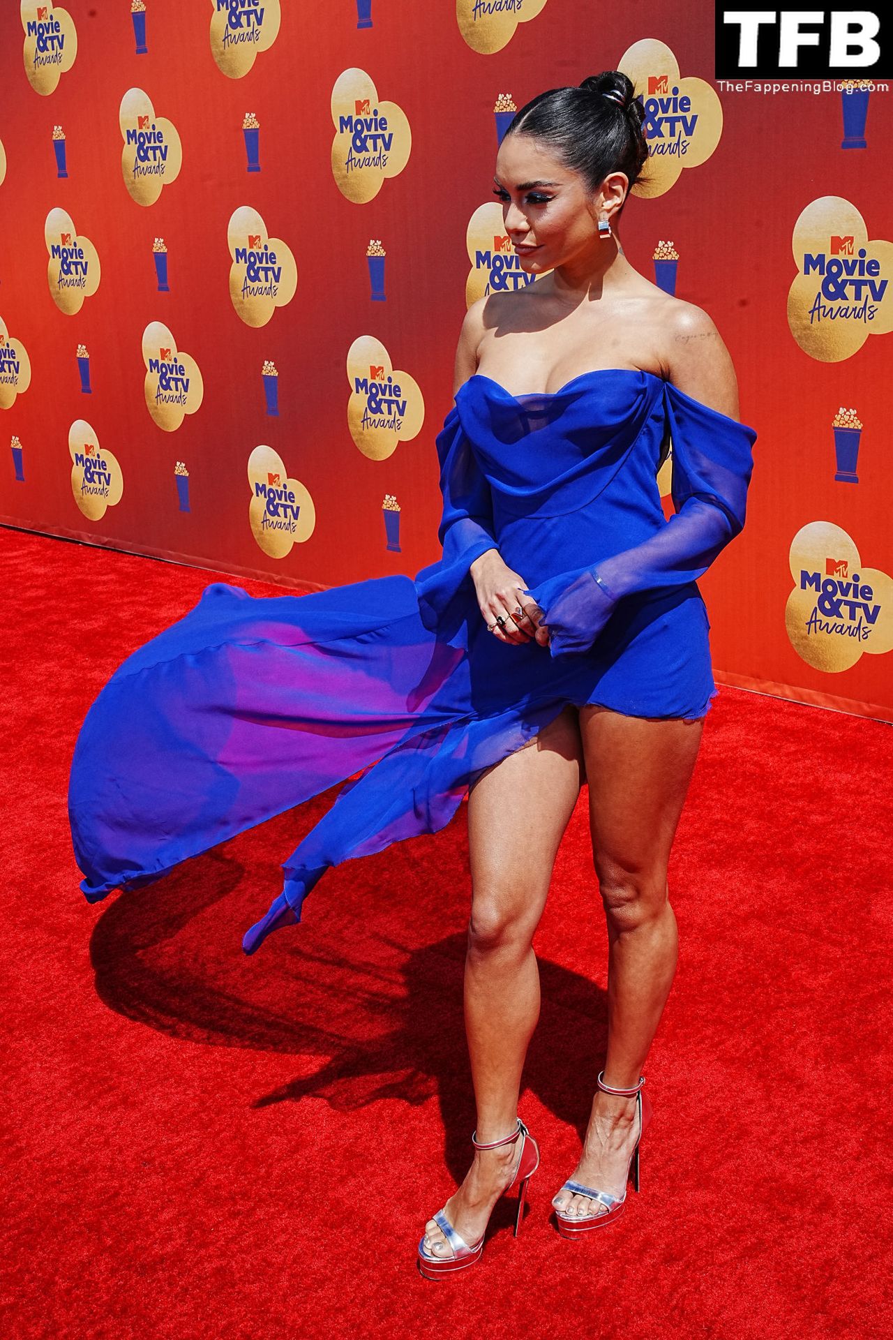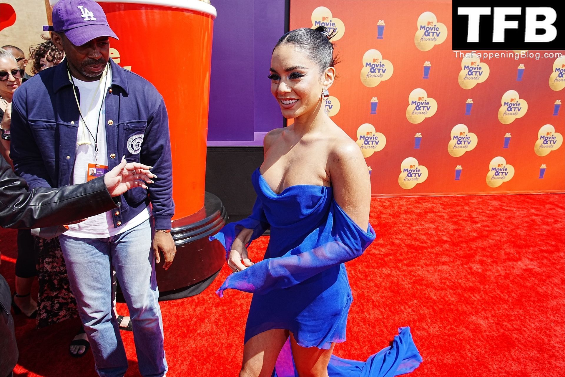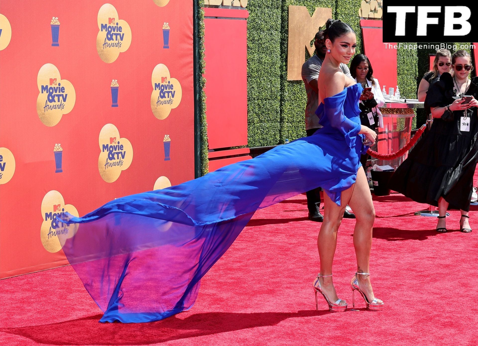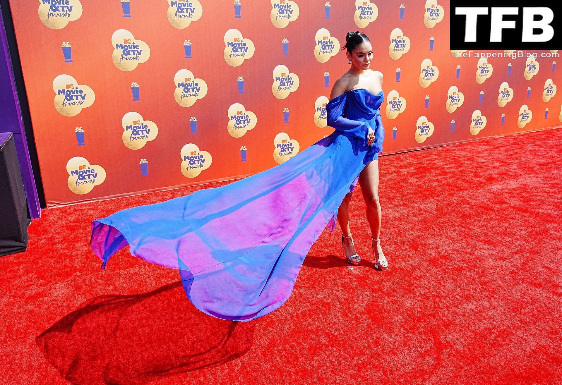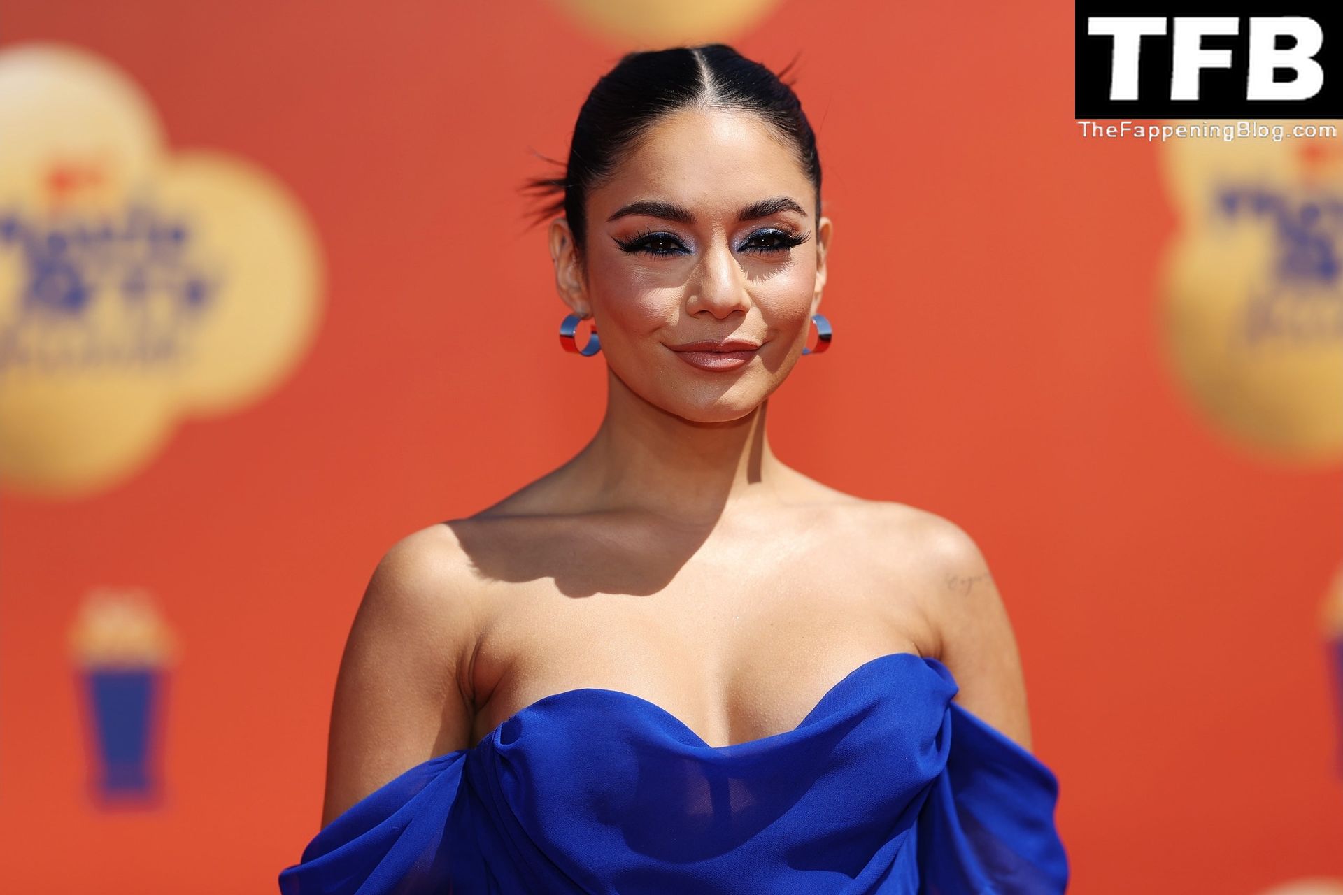 La estrella de The Fappening Vanessa Hudgens posa con un vestido azul en la alfombra roja de los MTV Movie & TV Awards en The Barker Hangar en Santa Mónica, 05/06/2022.