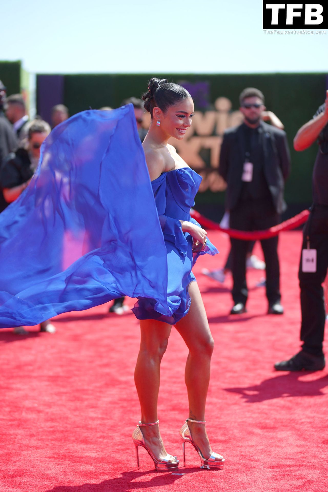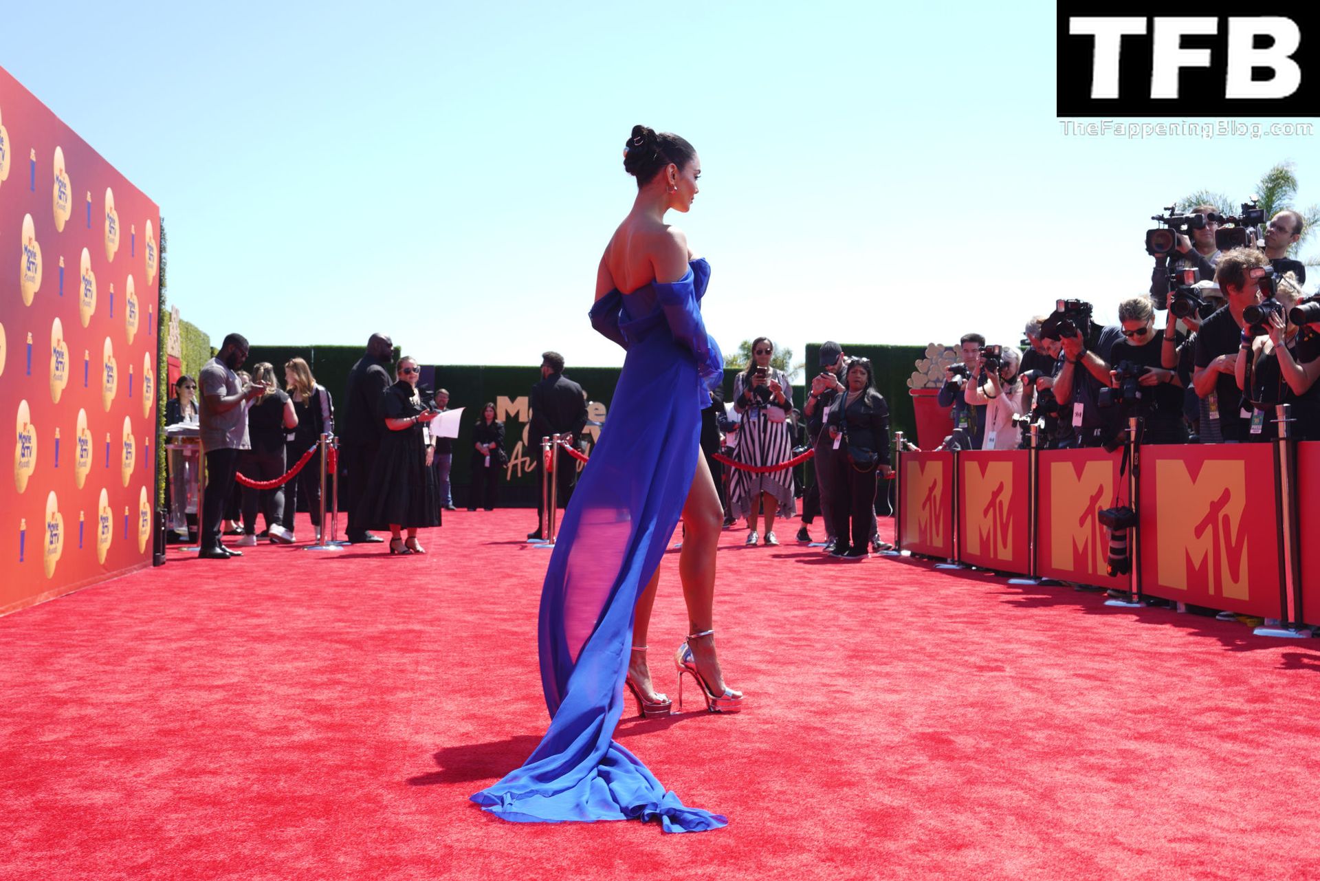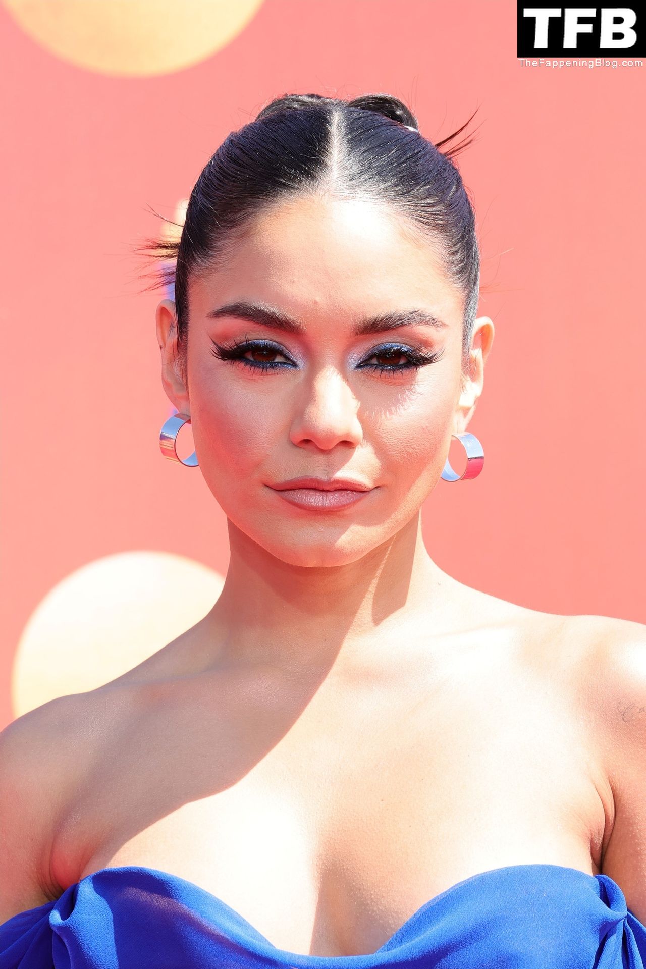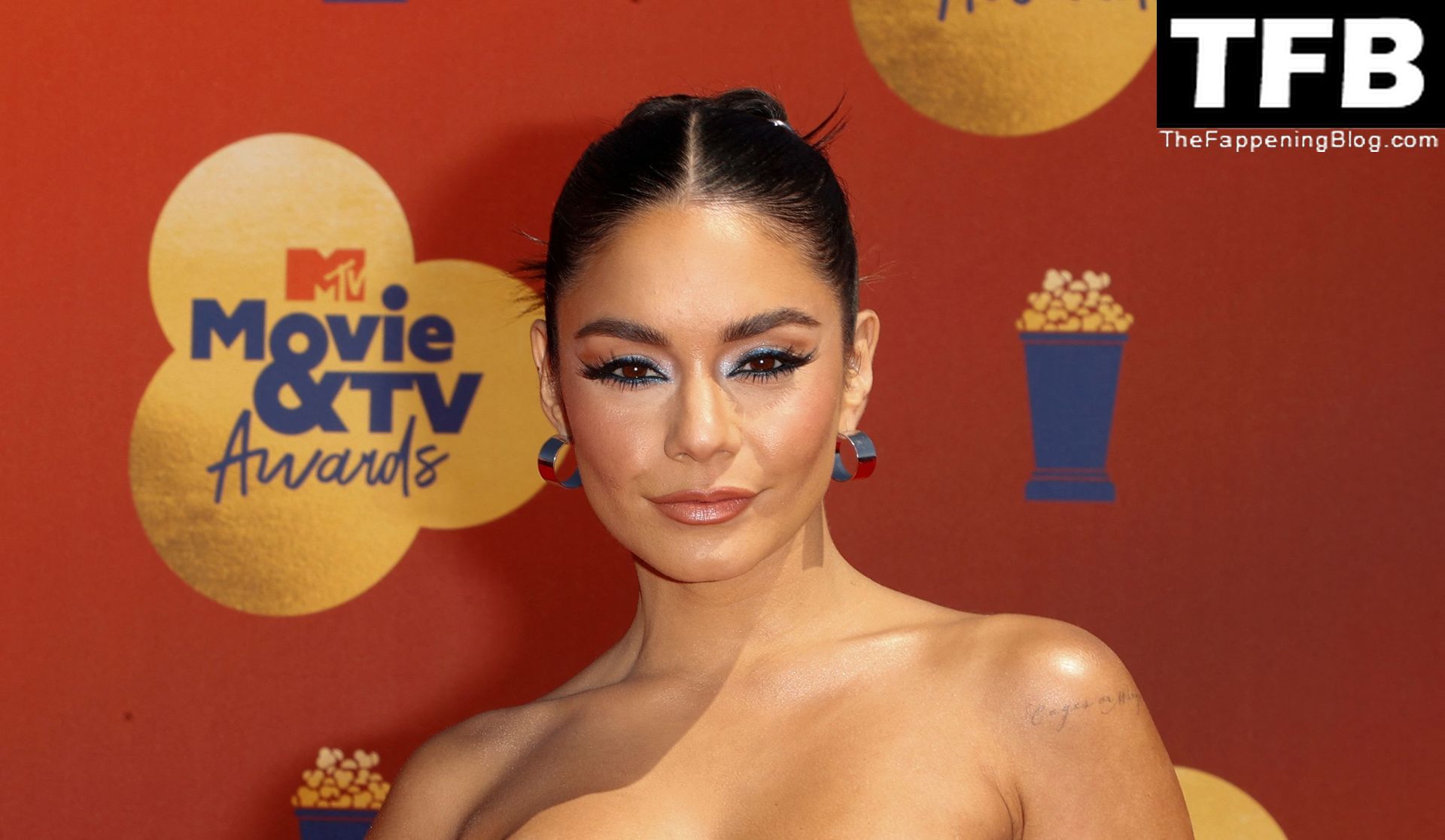 La estrella de The Fappening Vanessa Hudgens posa con un vestido azul en la alfombra roja de los MTV Movie & TV Awards en The Barker Hangar en Santa Mónica, 05/06/2022.
