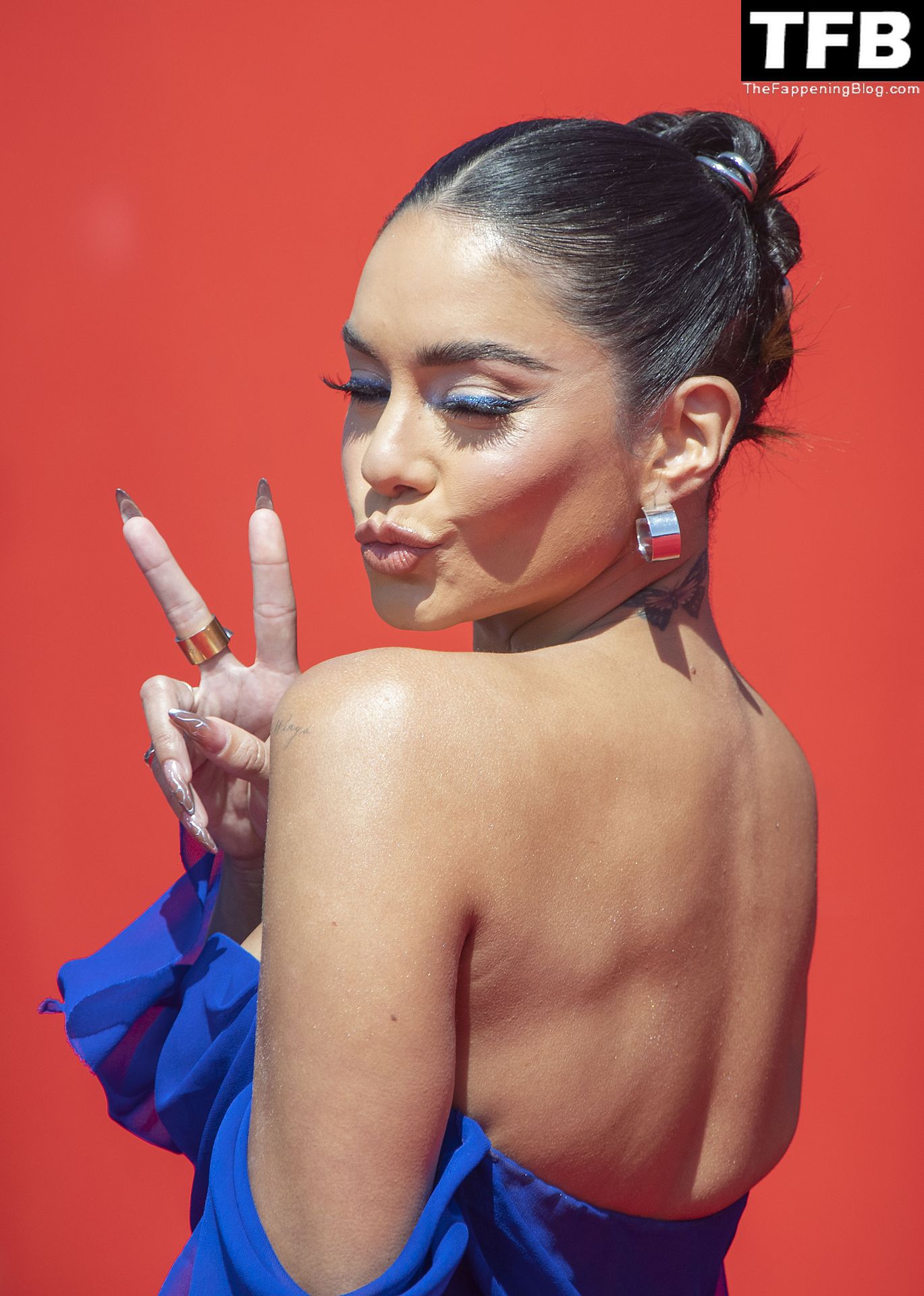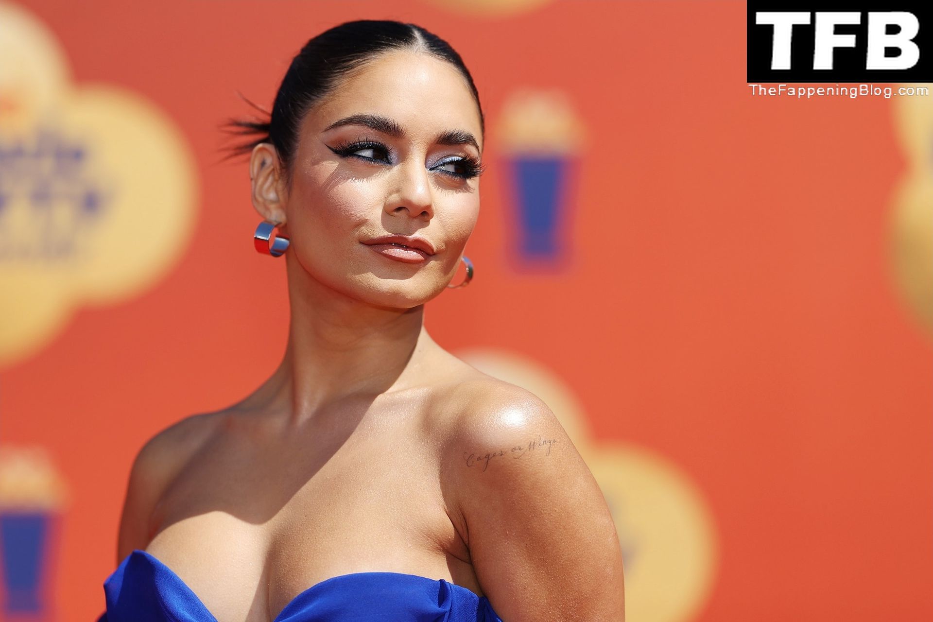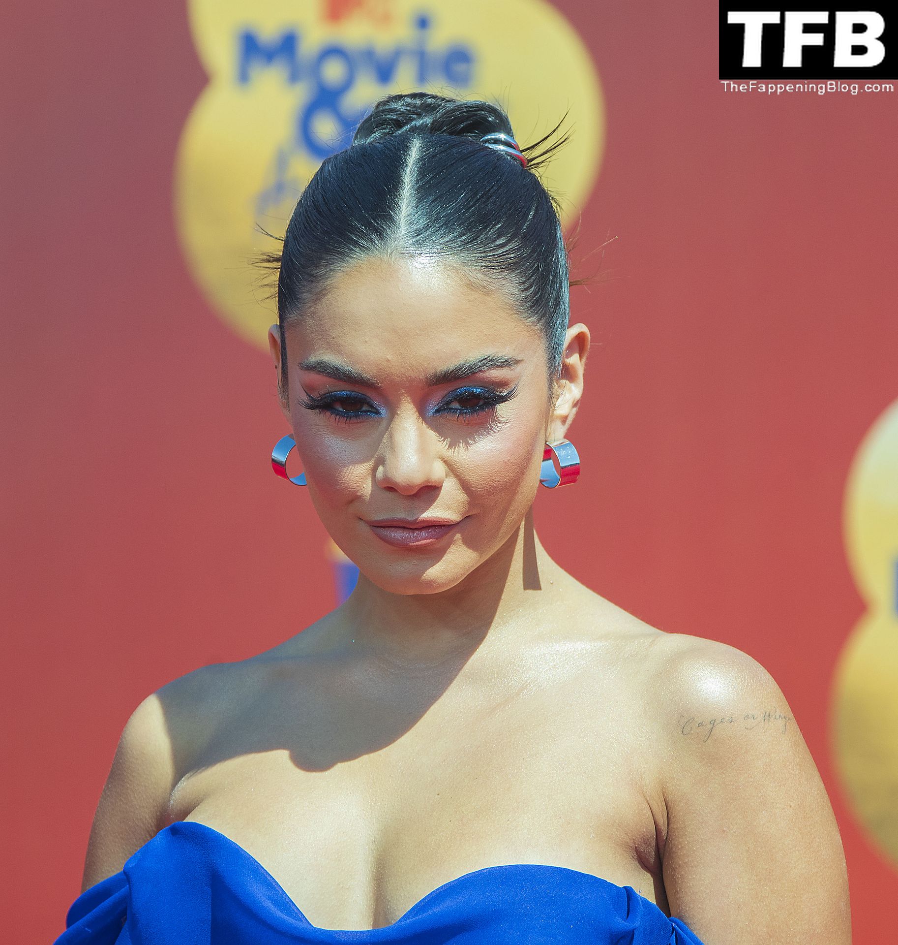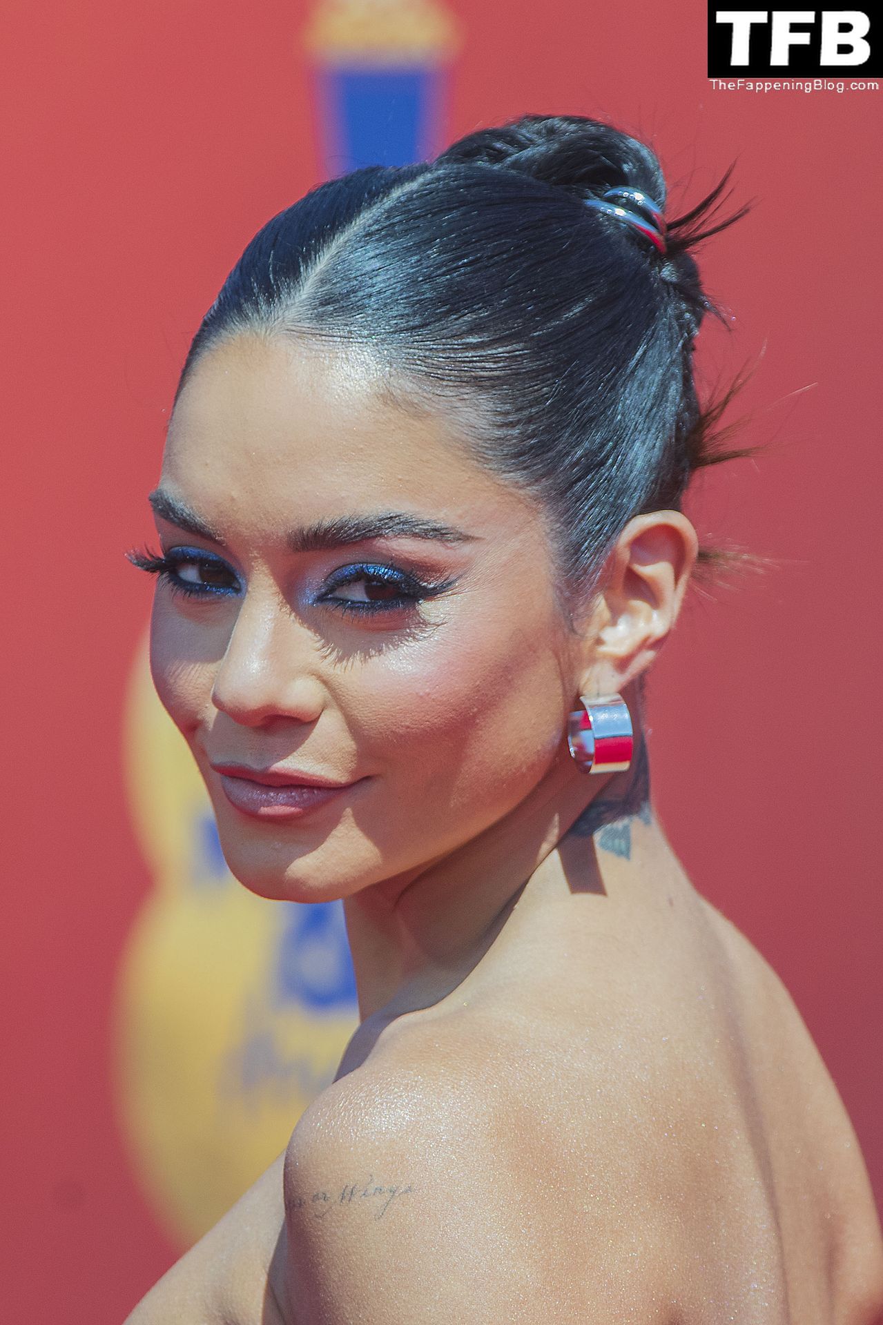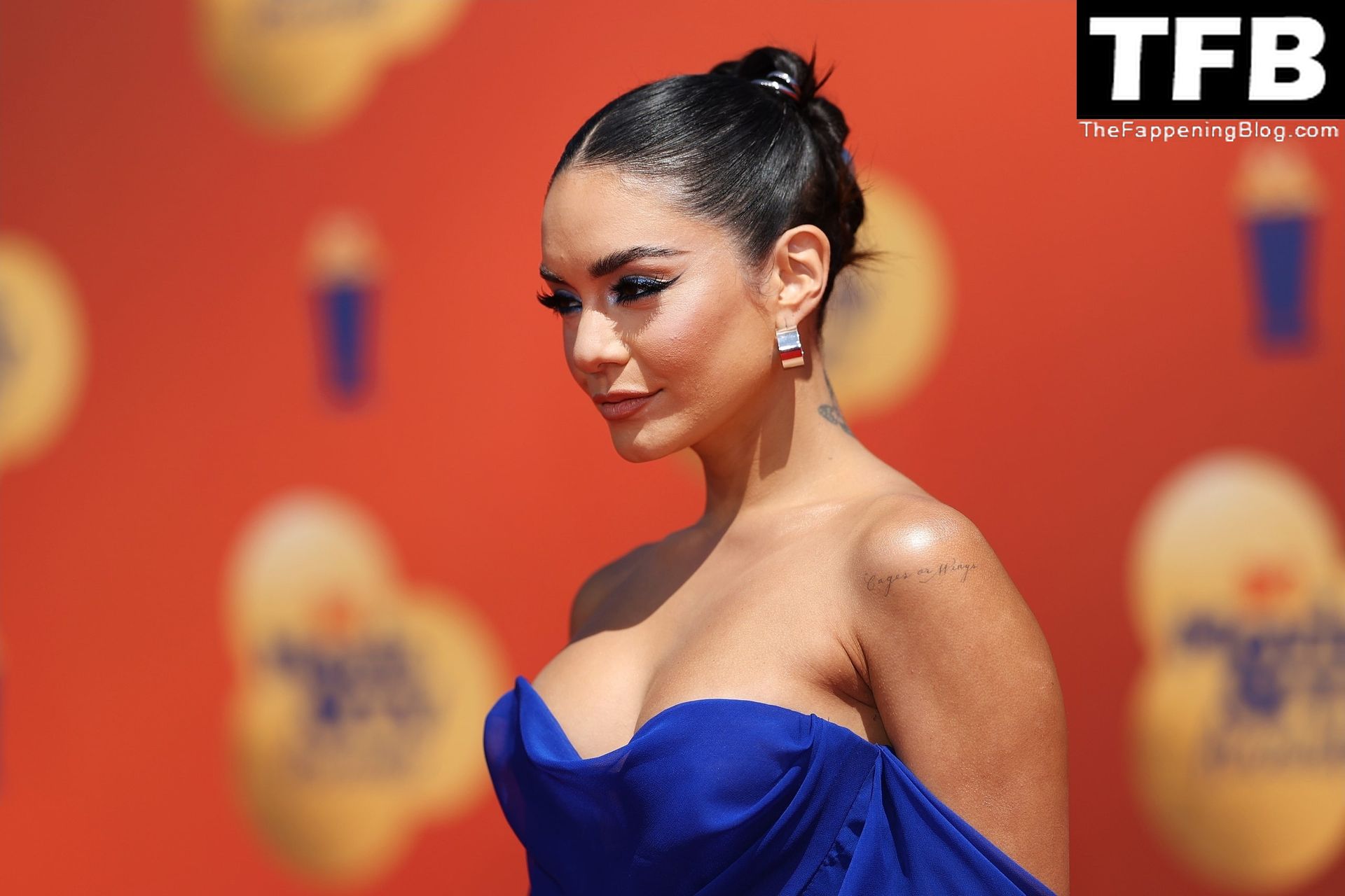 La estrella de The Fappening Vanessa Hudgens posa con un vestido azul en la alfombra roja de los MTV Movie & TV Awards en The Barker Hangar en Santa Mónica, 05/06/2022.
