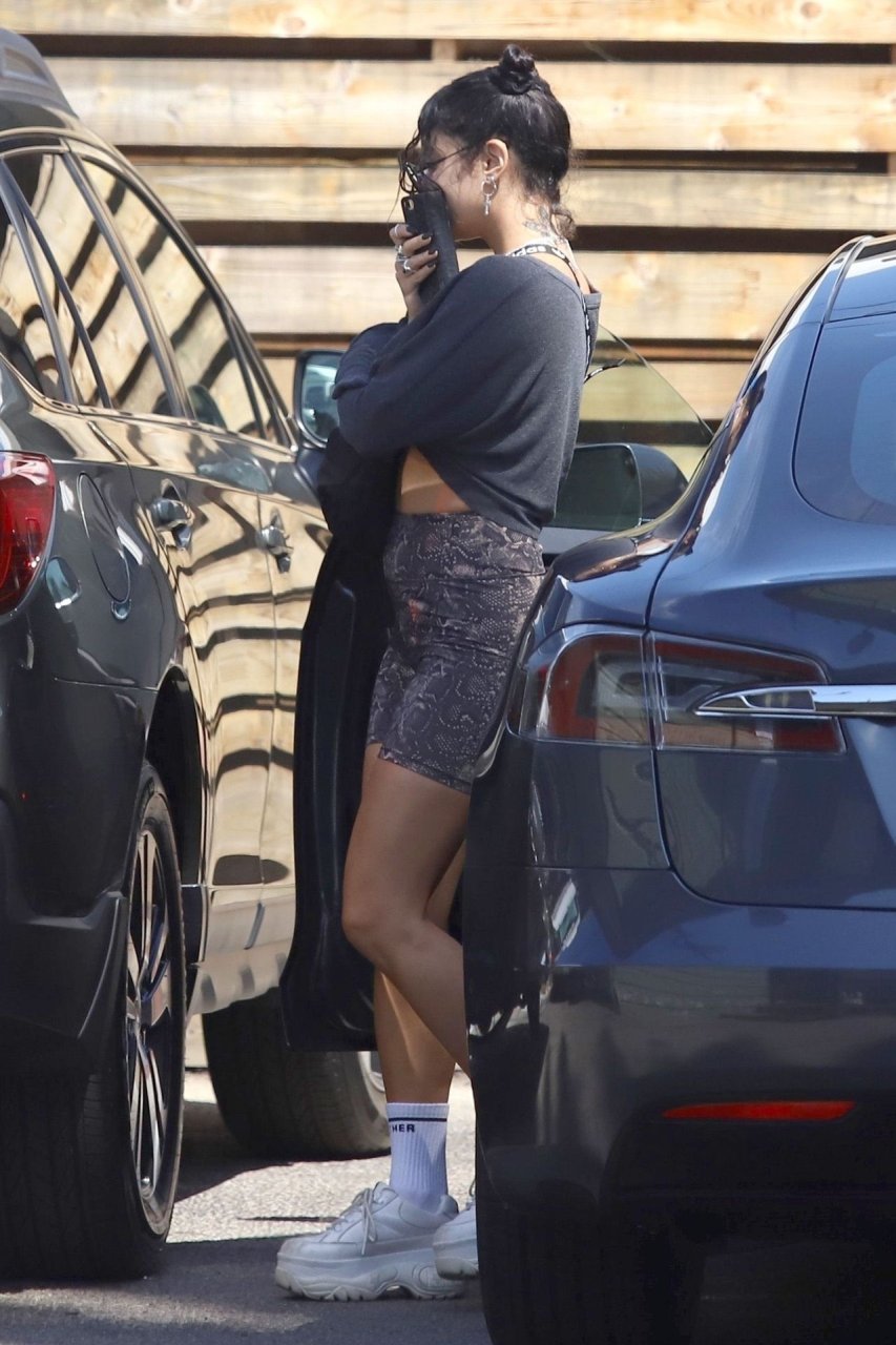 Vanessa Hudgens luce casual mientras hace recados en Los Feliz, 14/09/2019. Vanessa se ve genial con gafas de sol, un suéter suelto corto, shorts de ciclismo con estampado de piel de serpiente y zapatos blancos con plataforma.