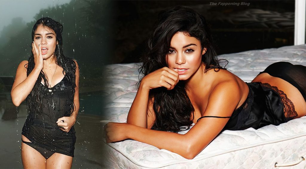 La estrella de The Fappening Vanessa Hudgens muestra su cuerpo mojado y sexy posando con ropa interior negra en una sesión de fotos para la revista Details (2010).