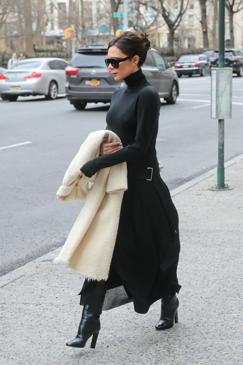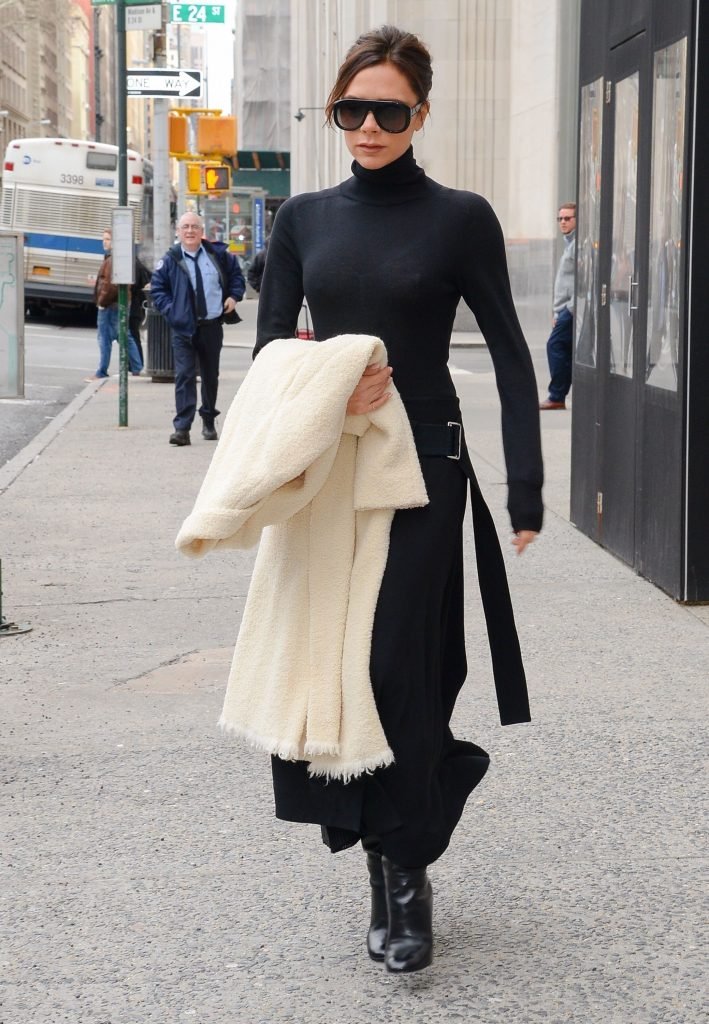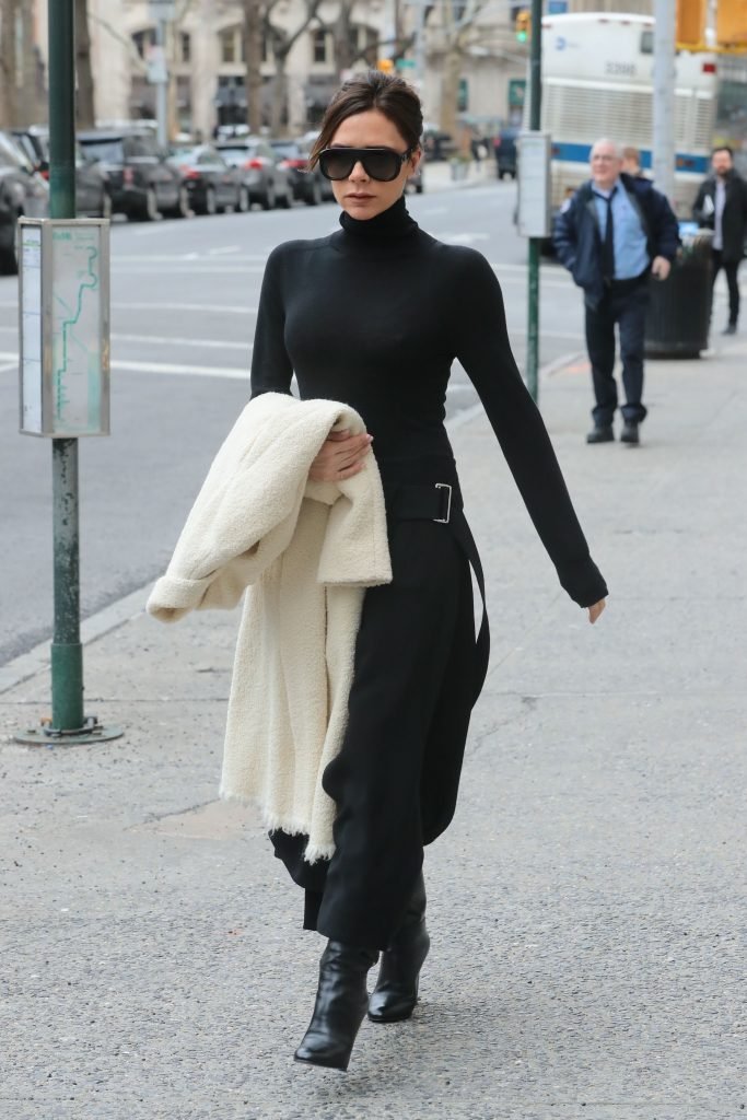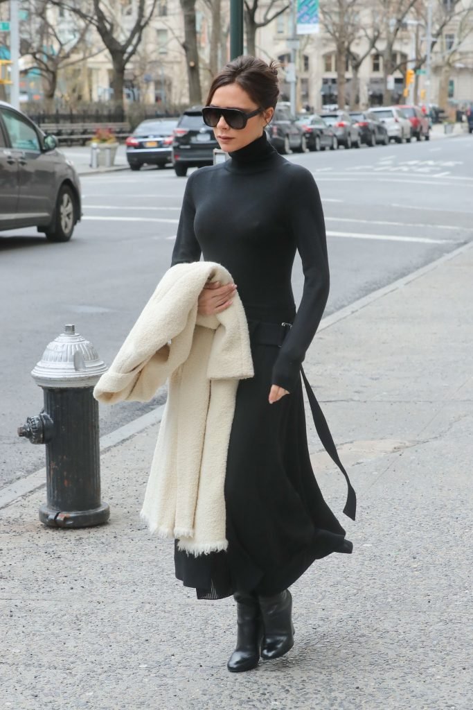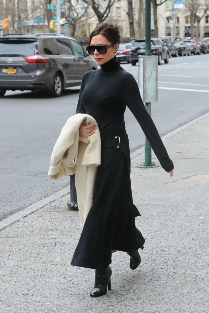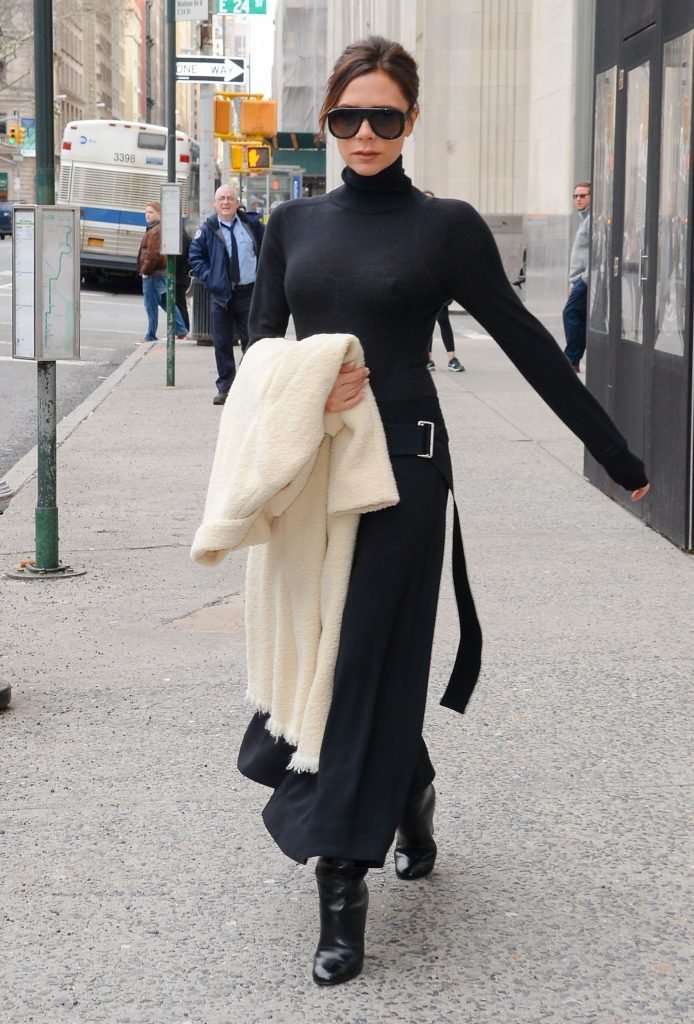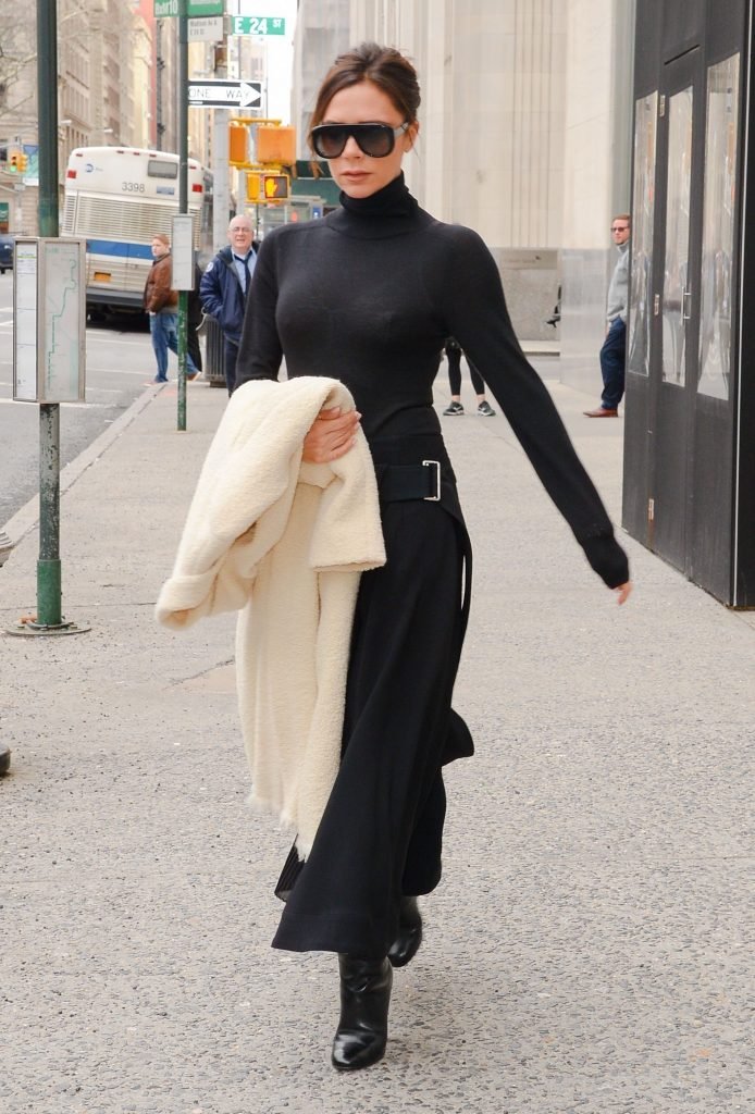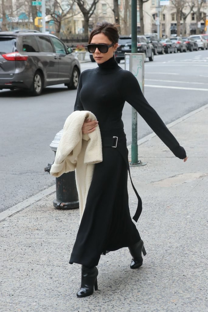 Victoria Beckham viste un conjunto completamente negro en la Gran Manzana, 03/04/2018. Victoria Beckham es una modelo, actriz, empresaria, cantante (Spice Girls) y diseñadora inglesa. Edad – 43.