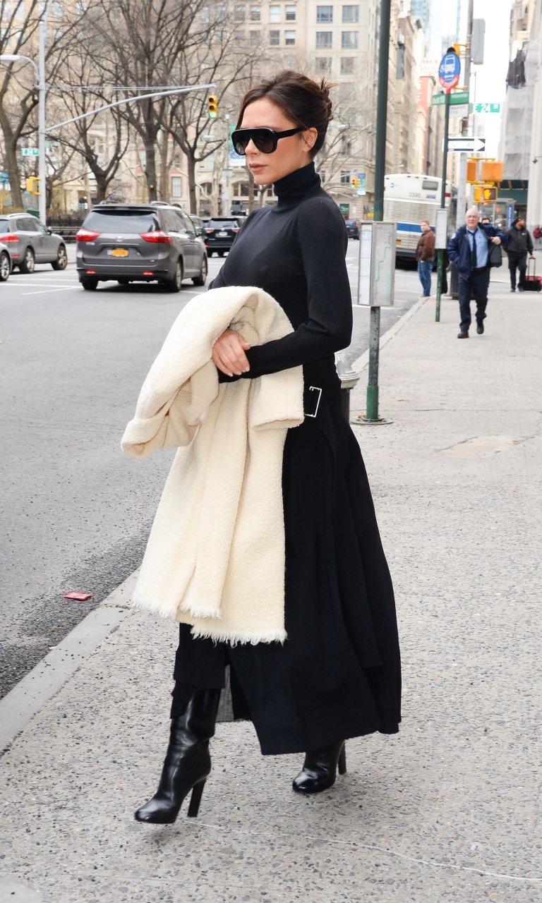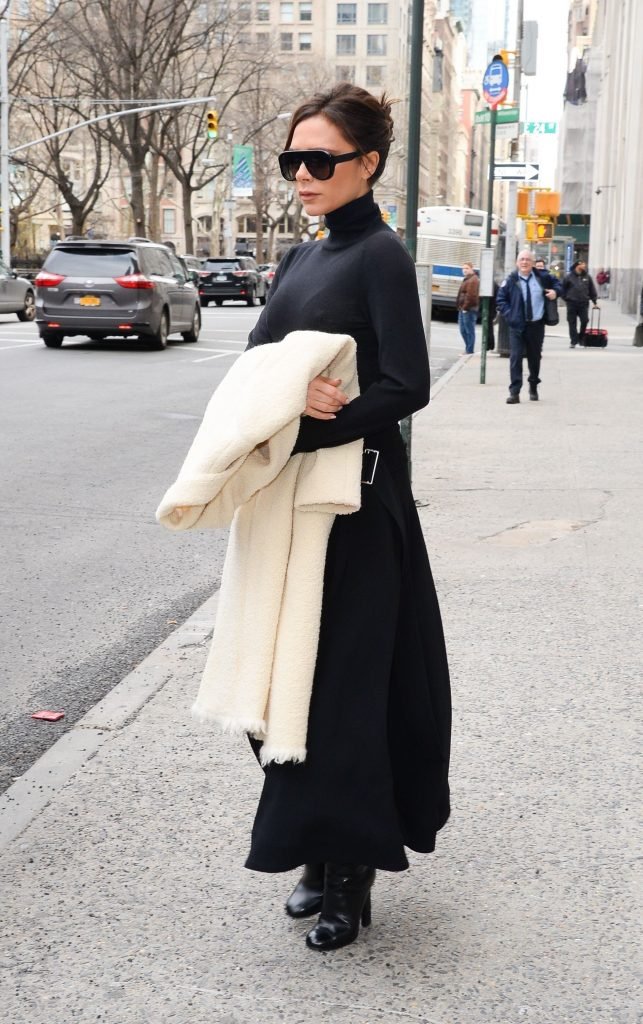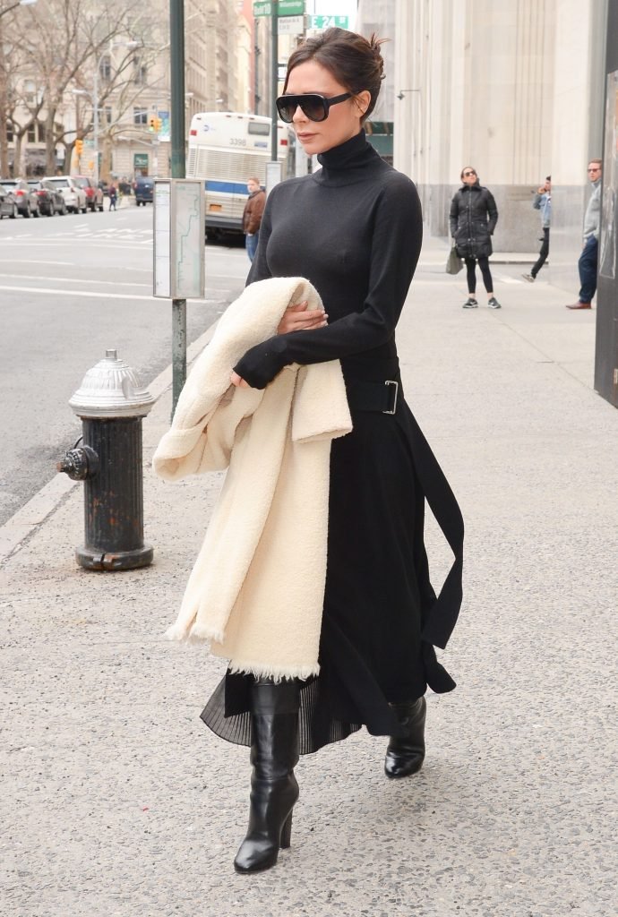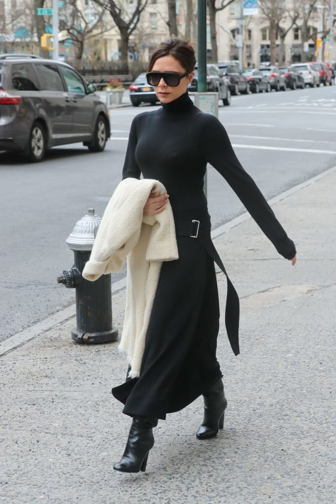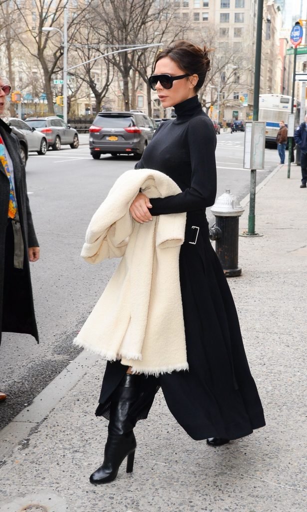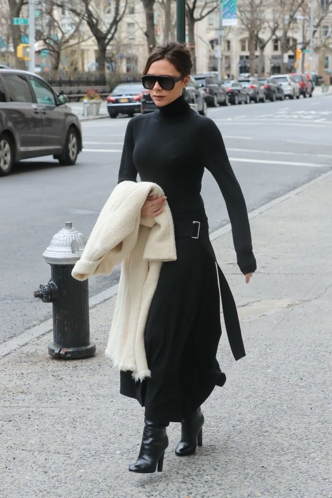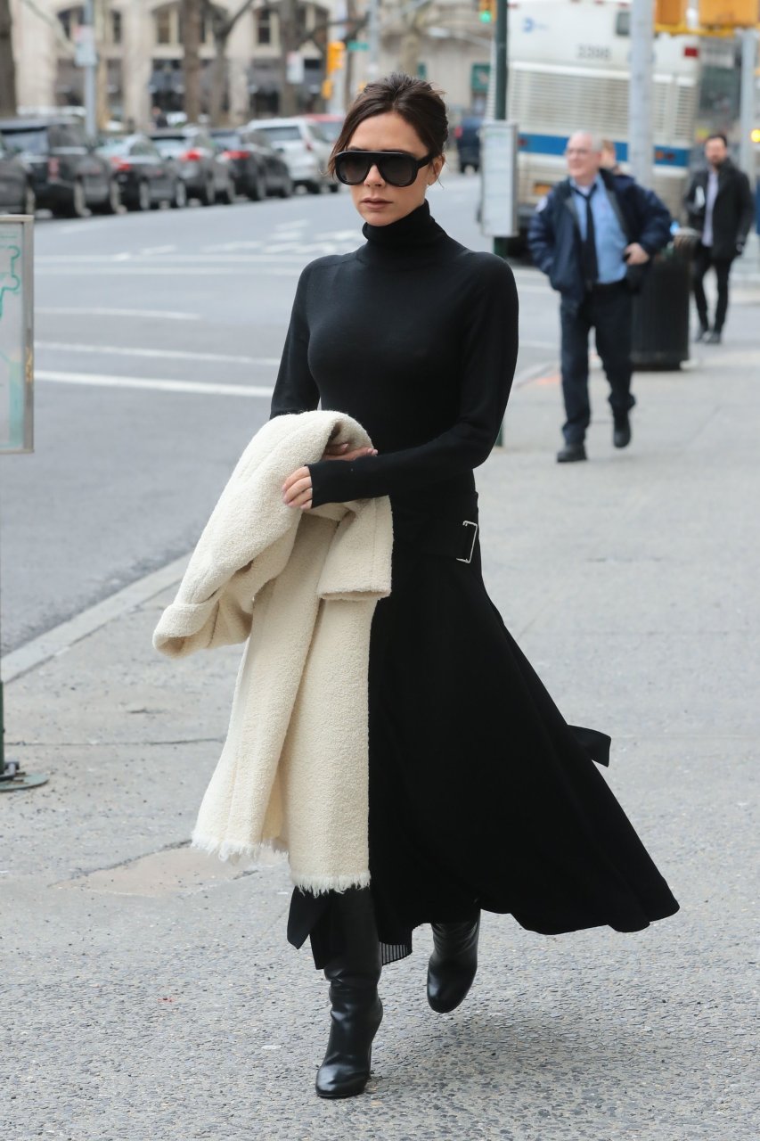 Victoria Beckham viste un conjunto completamente negro en la Gran Manzana, 03/04/2018. Victoria Beckham es una modelo, actriz, empresaria, cantante (Spice Girls) y diseñadora inglesa. Edad – 43.