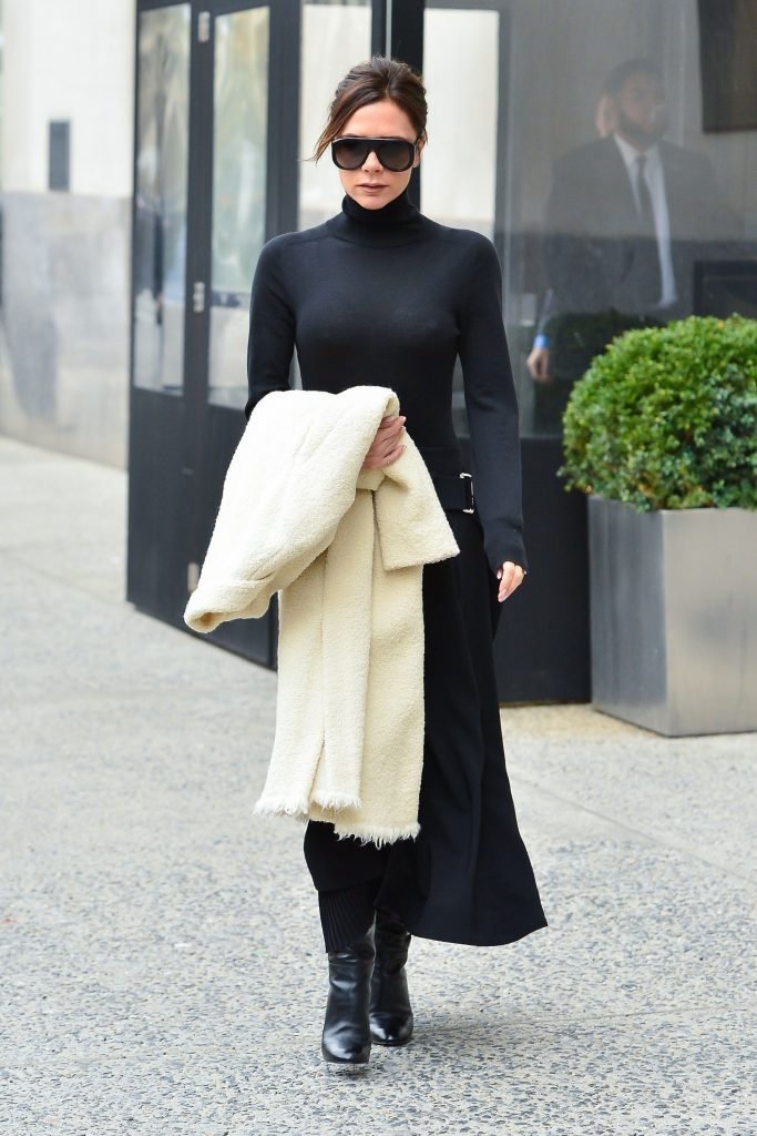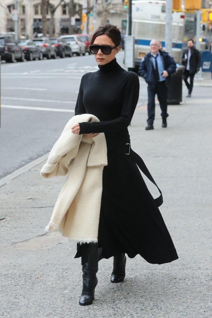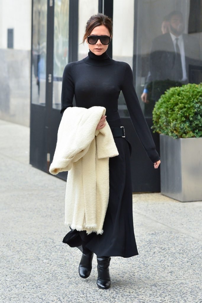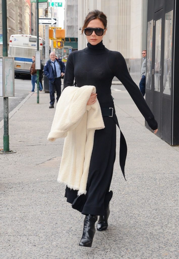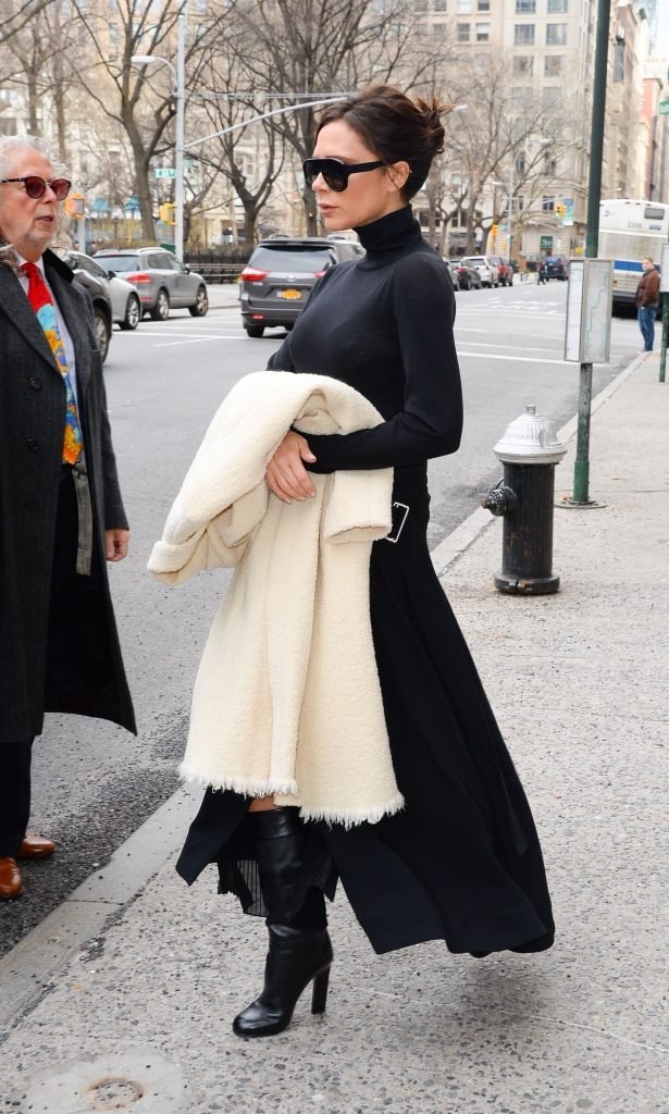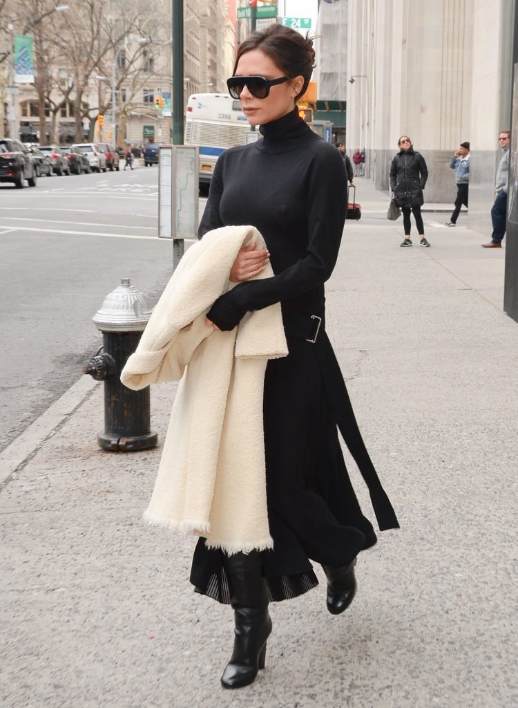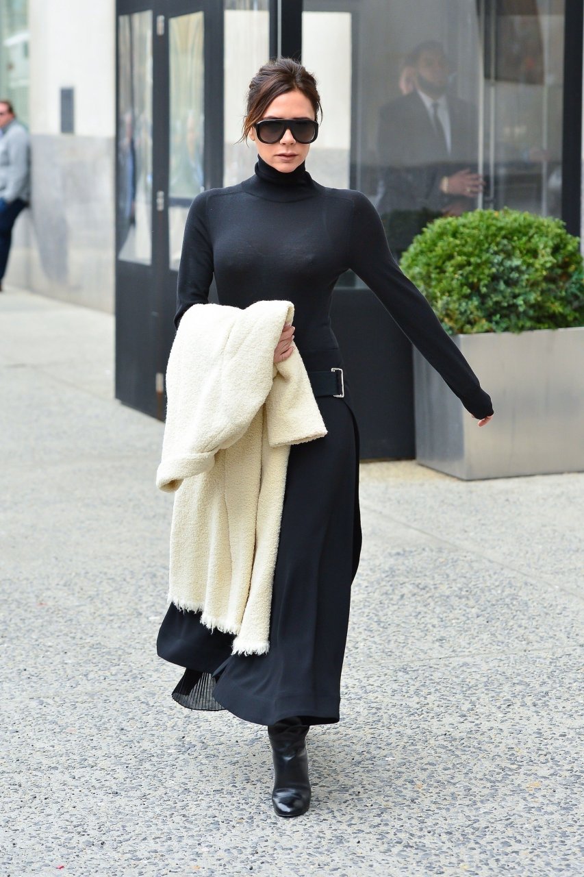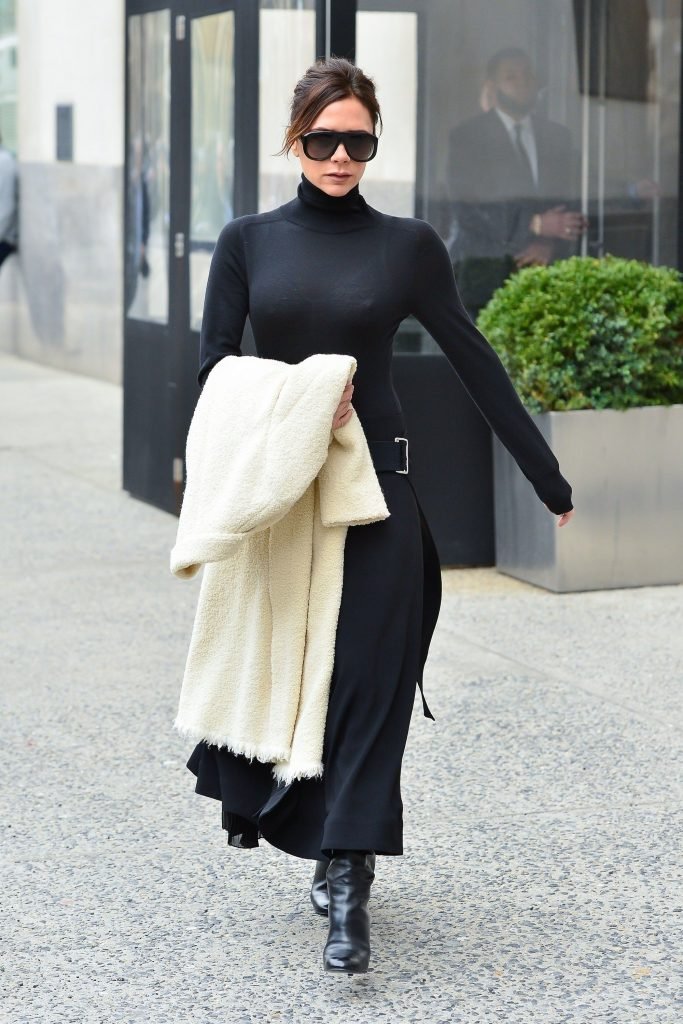 Victoria Beckham viste un conjunto completamente negro en la Gran Manzana, 03/04/2018. Victoria Beckham es una modelo, actriz, empresaria, cantante (Spice Girls) y diseñadora inglesa. Edad – 43.