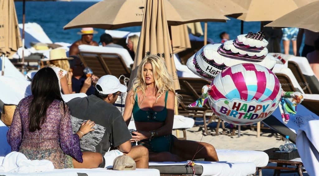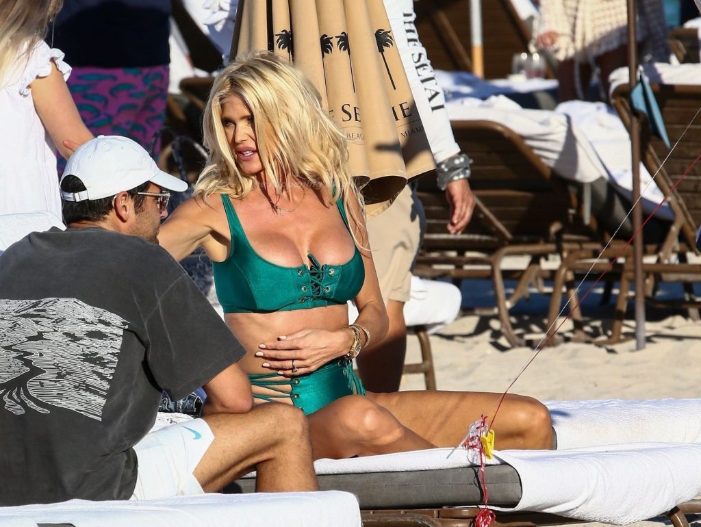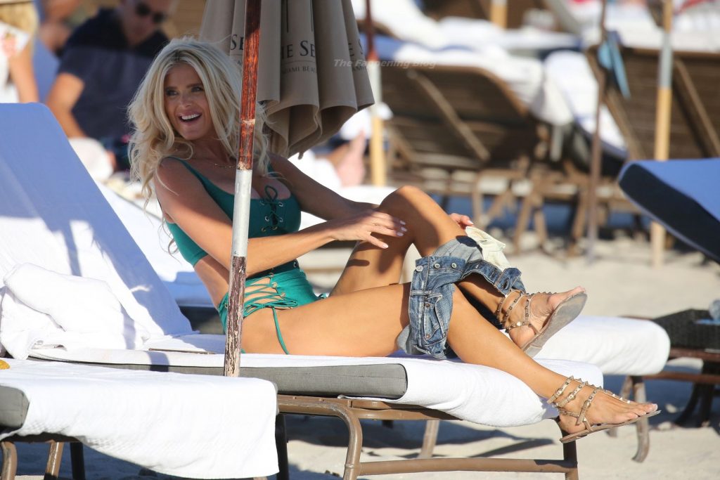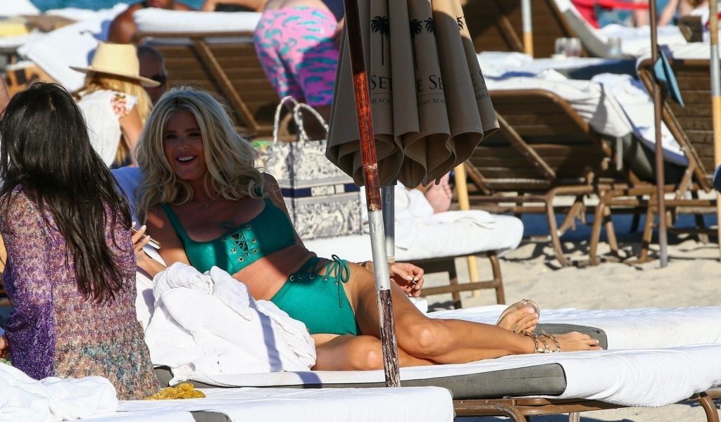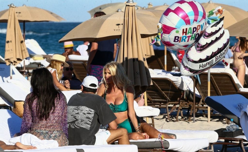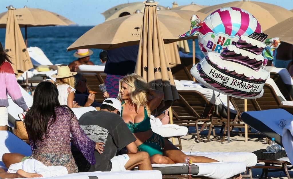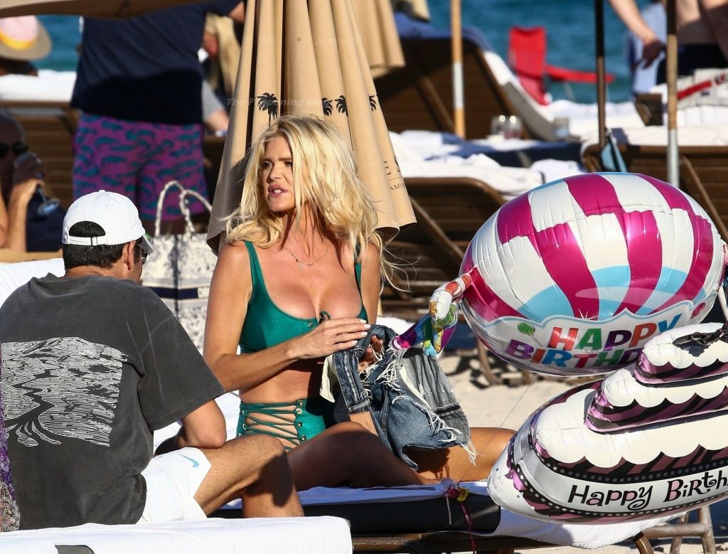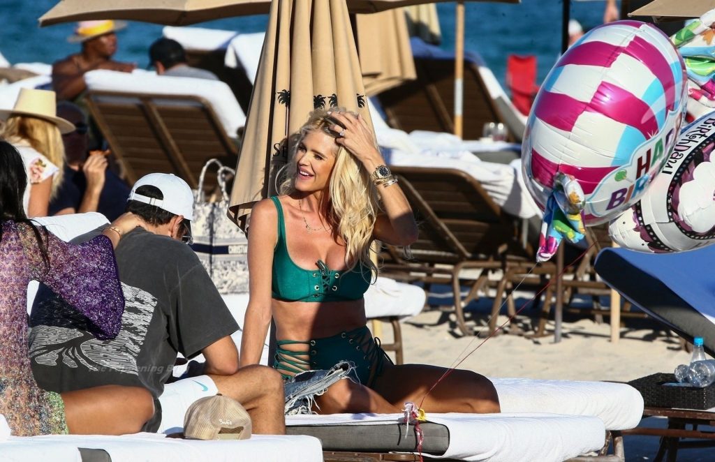 La modelo sueca Victoria Silvstedt muestra su figura bronceada con un sexy bikini verde mientras se relaja en la playa celebrando el cumpleaños de una amiga en Miami Beach, 23/01/2021.