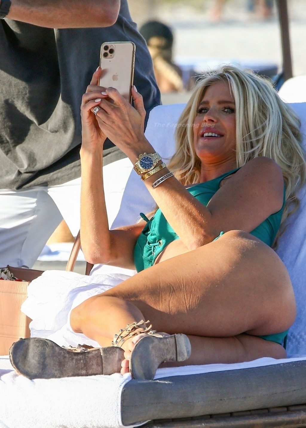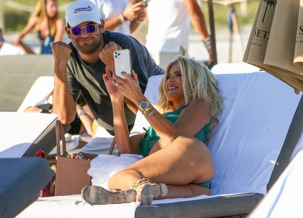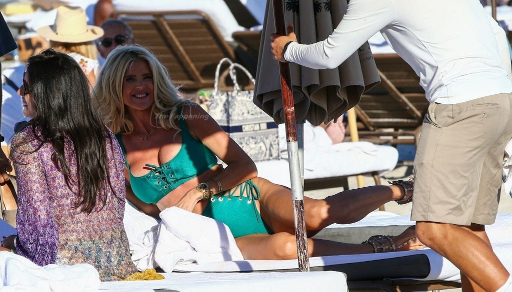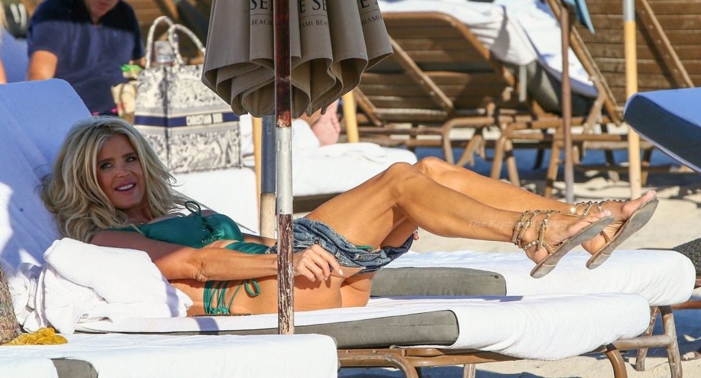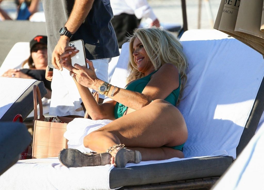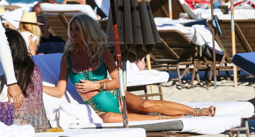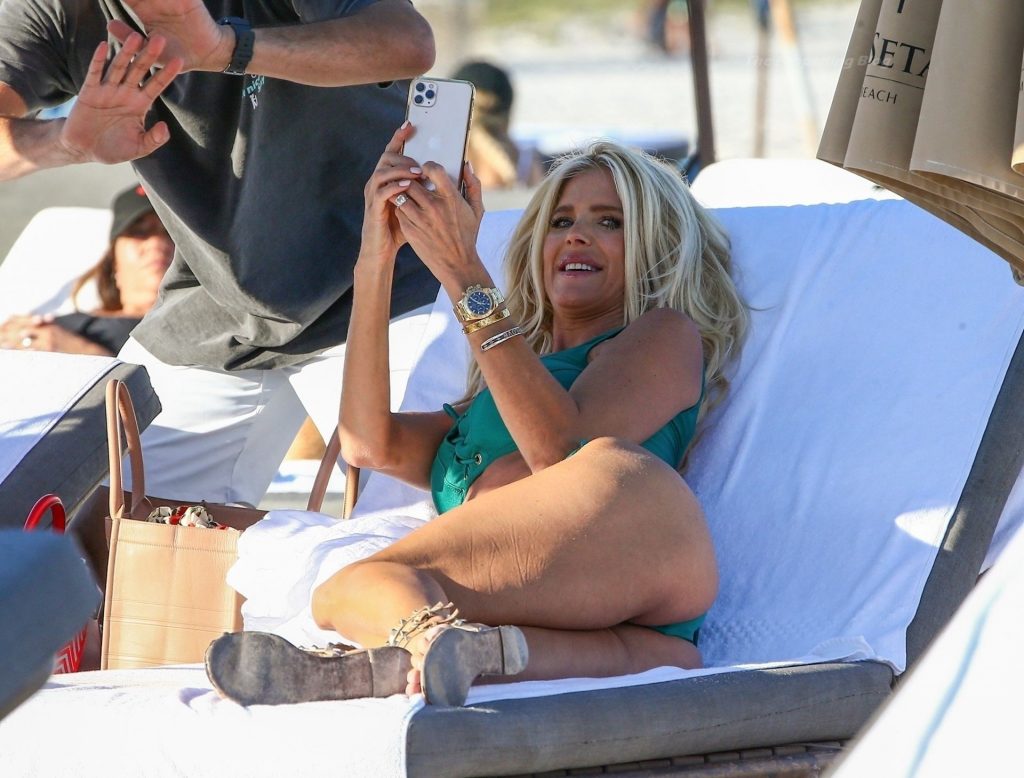 La modelo sueca Victoria Silvstedt muestra su figura bronceada con un sexy bikini verde mientras se relaja en la playa celebrando el cumpleaños de una amiga en Miami Beach, 23/01/2021.