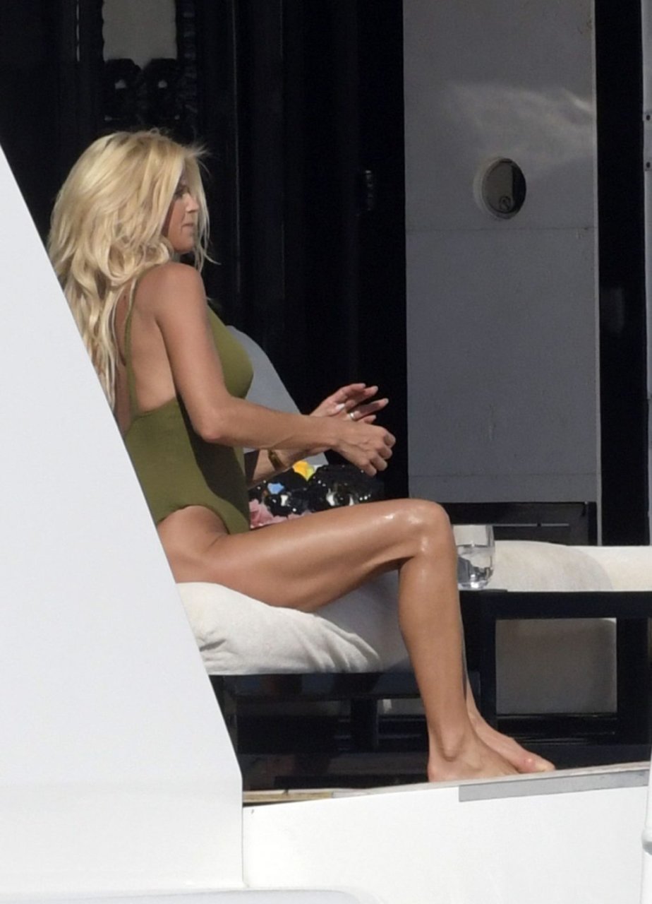 Victoria Silvstedt (43) fue vista usando un traje de baño verde súper sexy en la playa de Cerdeña, 06/08/2018. La figura de la celebridad es increíble: piernas largas, abdomen plano y senos exuberantes.