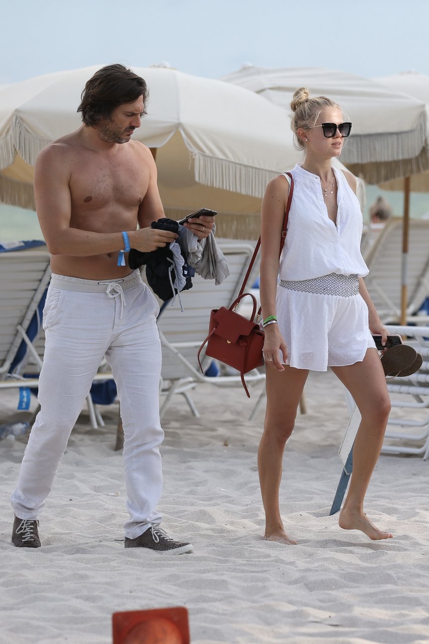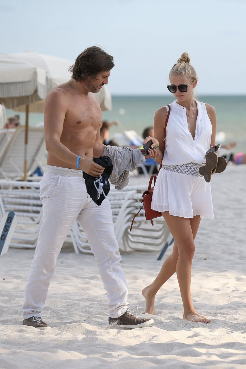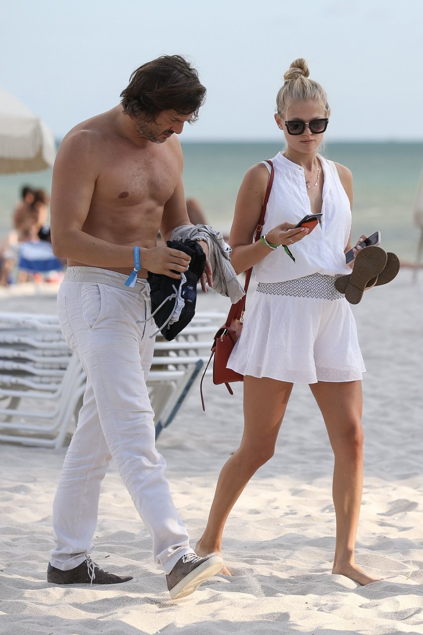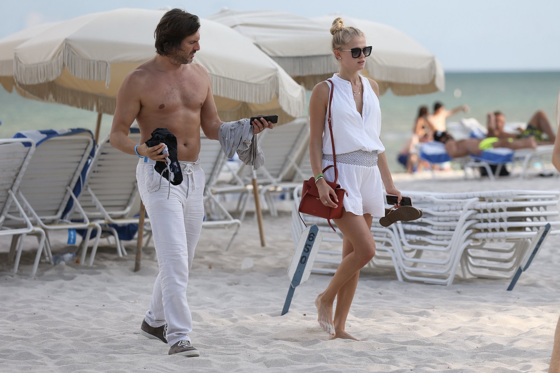 La modelo de Victoria’s Secret Vita Sidorkina muestra su barriga de embarazada con un traje de baño blanco de Solid and Striped mientras pasa la tarde con amigos y su esposo Valerio Morabito en Miami Beach (octubre de 2018).