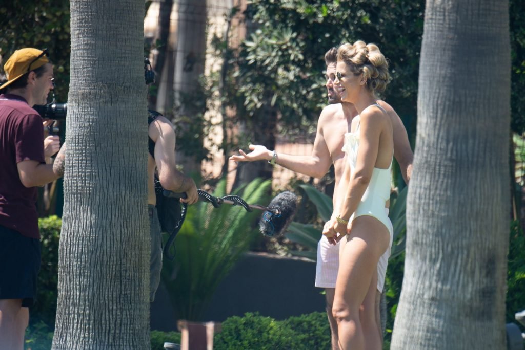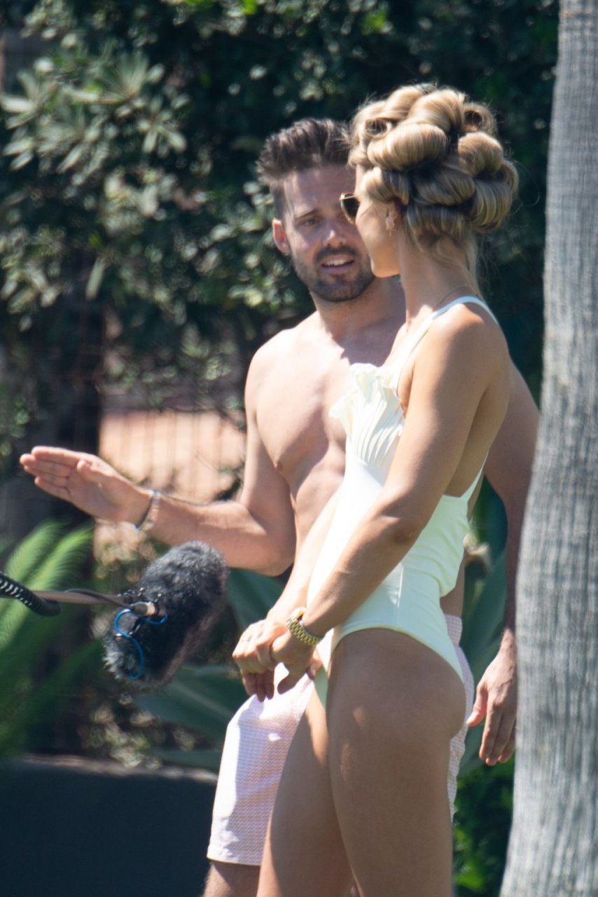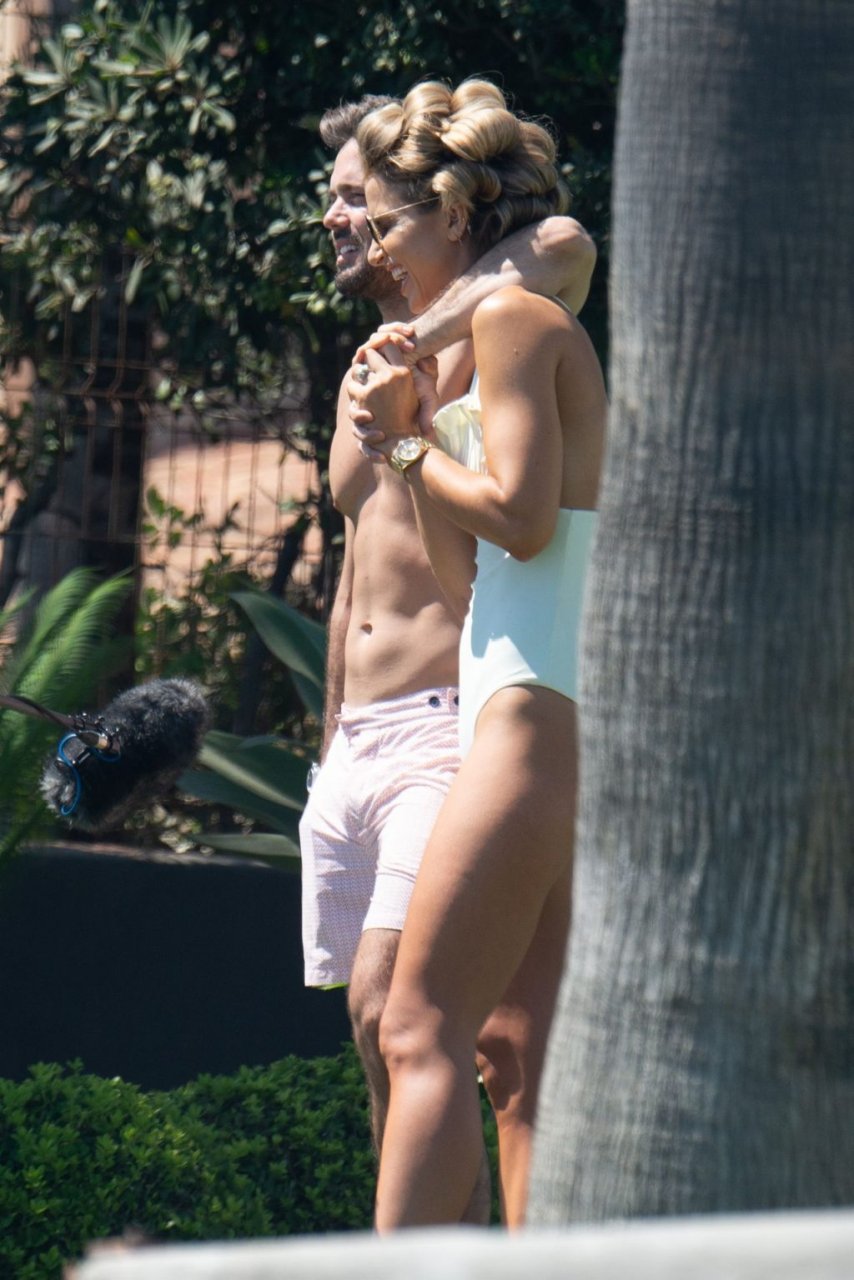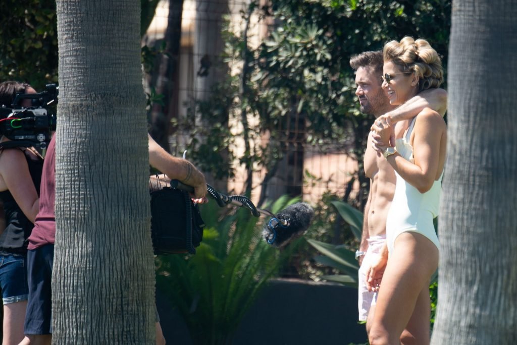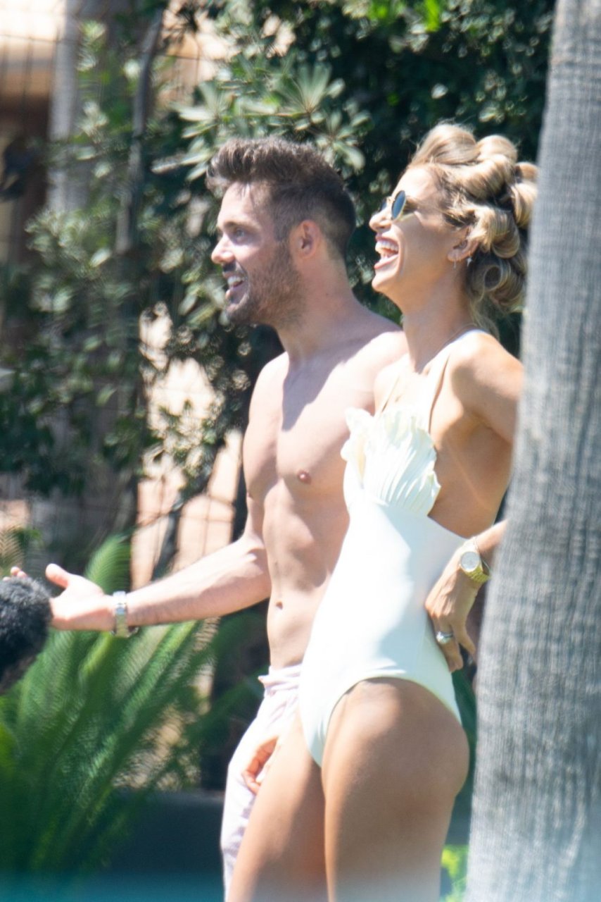 Vogue Williams y Spencer Matthews fueron vistos disfrutando de una divertida sesión de fotos en Marbella, 18/08/2019. Vogue comenzó con un traje de baño blanco y rulos, y luego se cambió a un espectacular traje de baño negro, posando junto a otras modelos junto al mar.