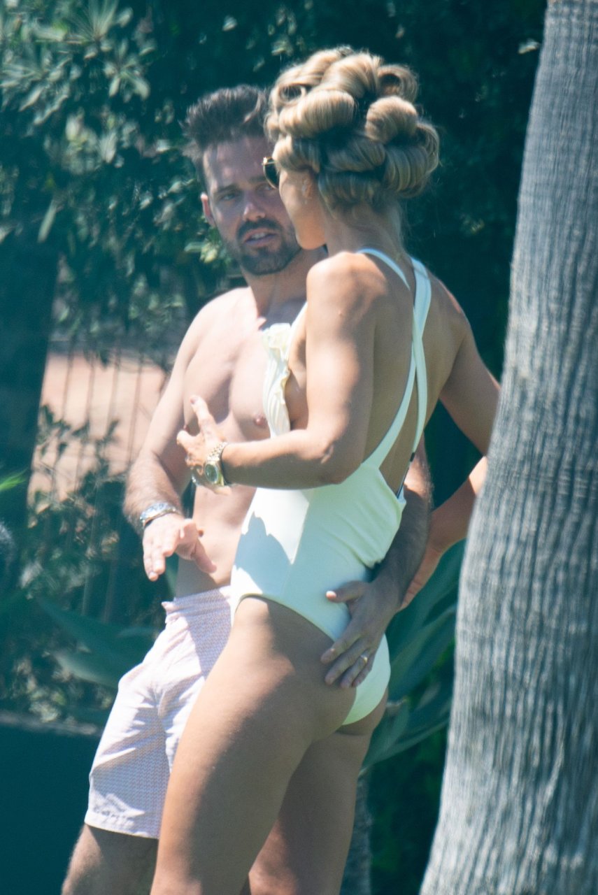 Vogue Williams y Spencer Matthews fueron vistos disfrutando de una divertida sesión de fotos en Marbella, 18/08/2019. Vogue comenzó con un traje de baño blanco y rulos, y luego se cambió a un espectacular traje de baño negro, posando junto a otras modelos junto al mar.