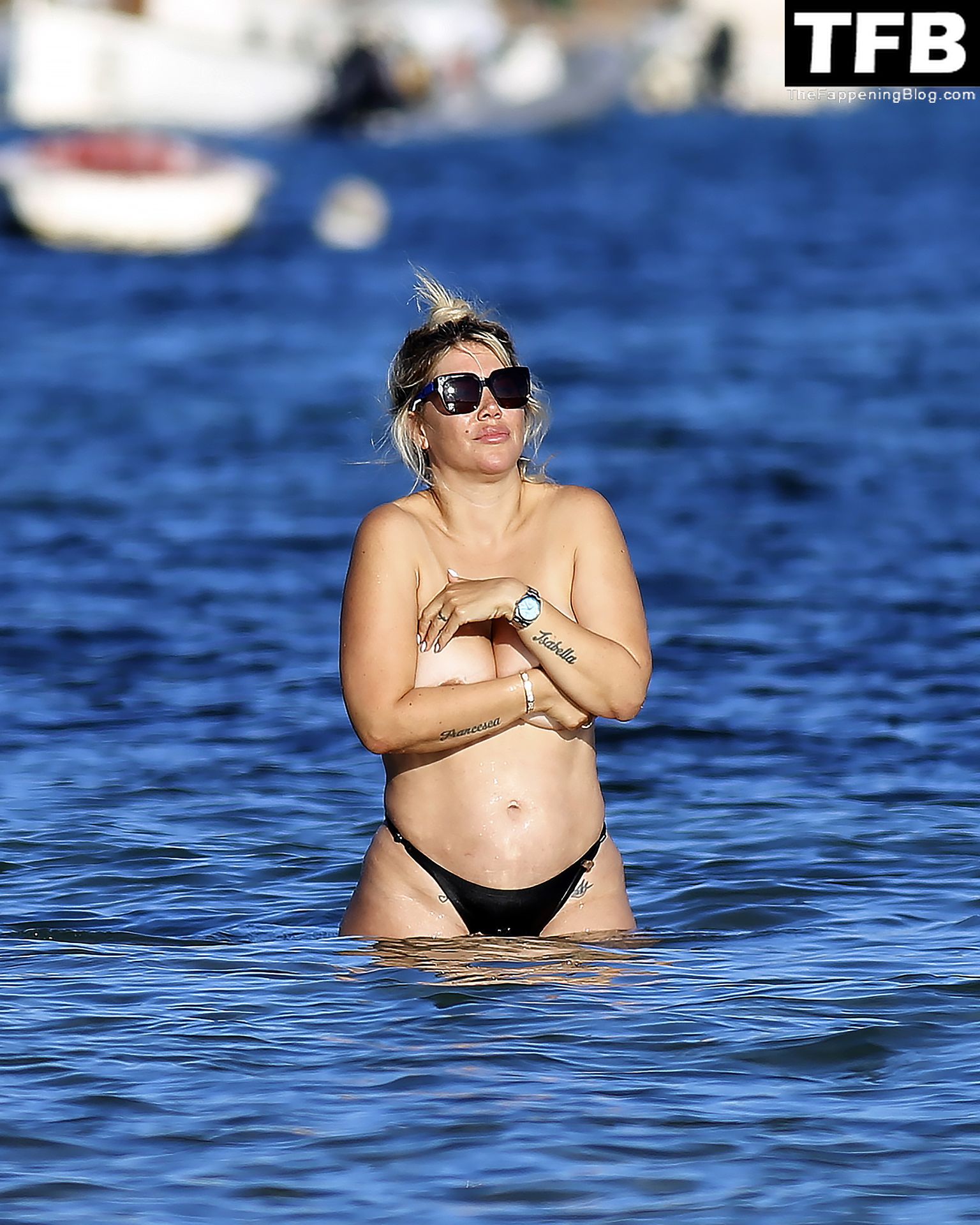 Impresionante Wanda Nara, la esposa del delantero del Paris Saint-Germain Mauro Icardi, deslumbra con una pose en topless en las playas de Ibiza, 17/07/2022.