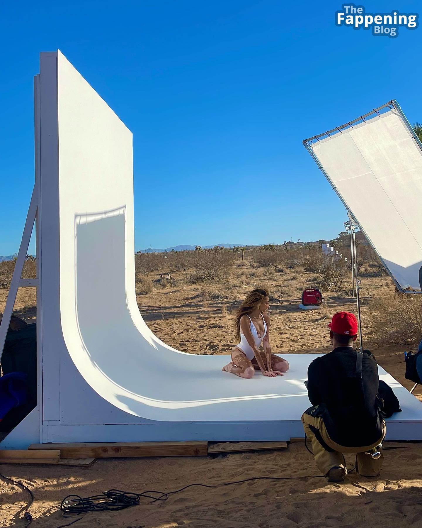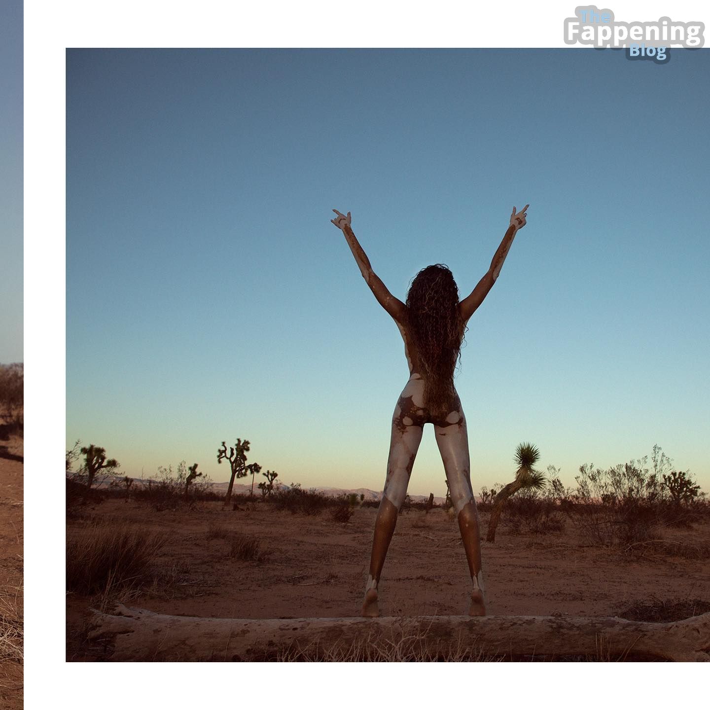 Y escucha esto: ella posa desnuda, cubriéndose los pechos con las manos y posando frente a un paisaje emocionante que transmite una sensación de libertad y armonía con la naturaleza.
