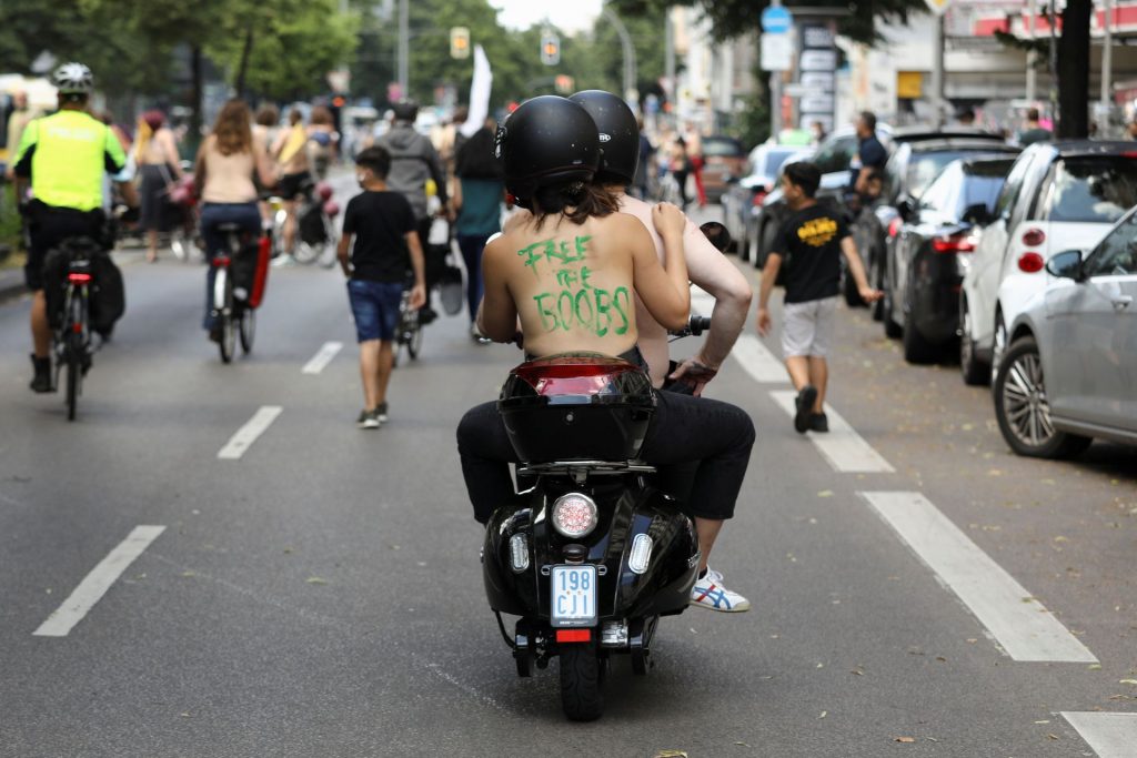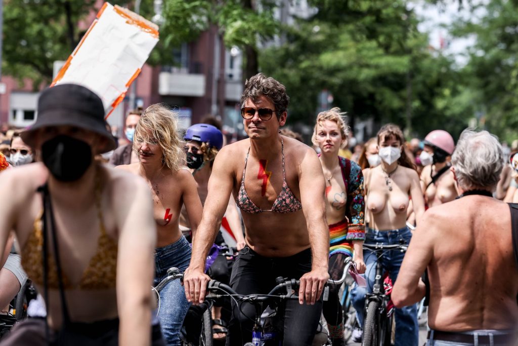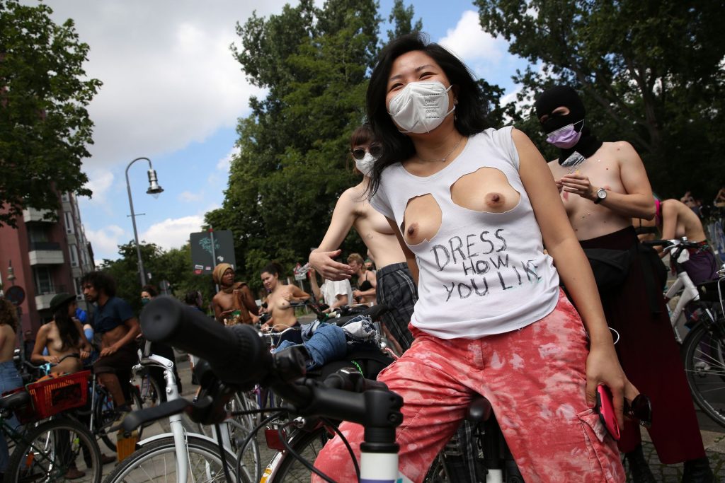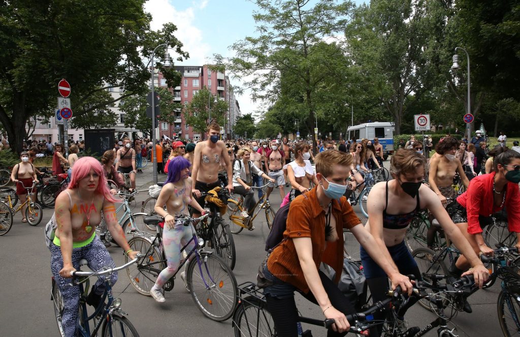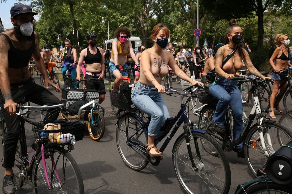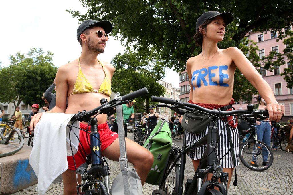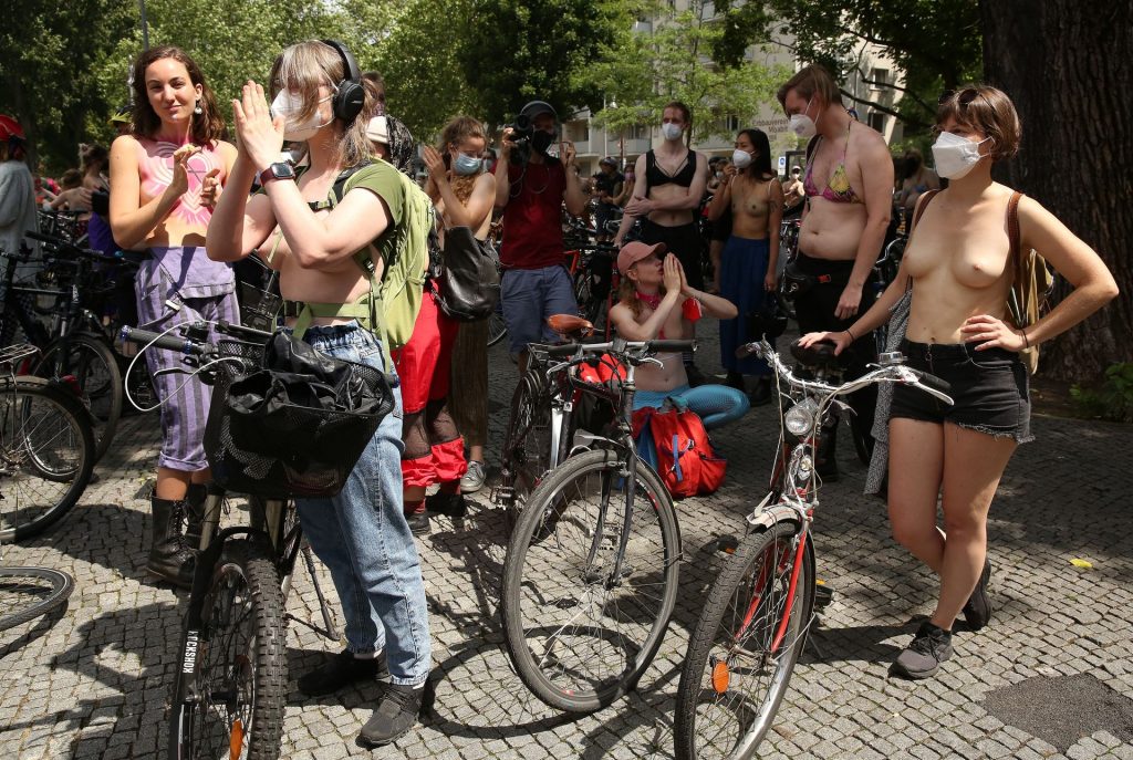 Los manifestantes montaron bicicletas en solidaridad con la ciudadana francesa Gabrielle Lebreton, a quien la policía le pidió que se cubriera mientras tomaba el sol topless en un parque de Berlín, argumentando que existe un doble estándar en cuanto a la diferencia entre la aceptación del derecho de los hombres frente al de las mujeres a estar topless en público.