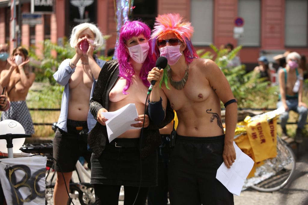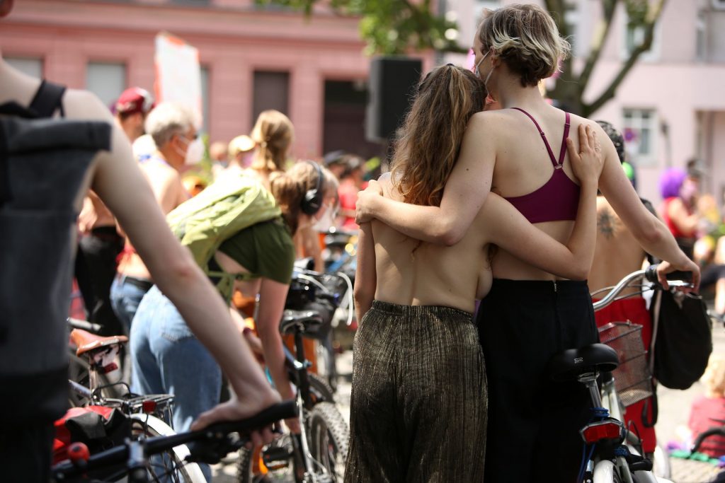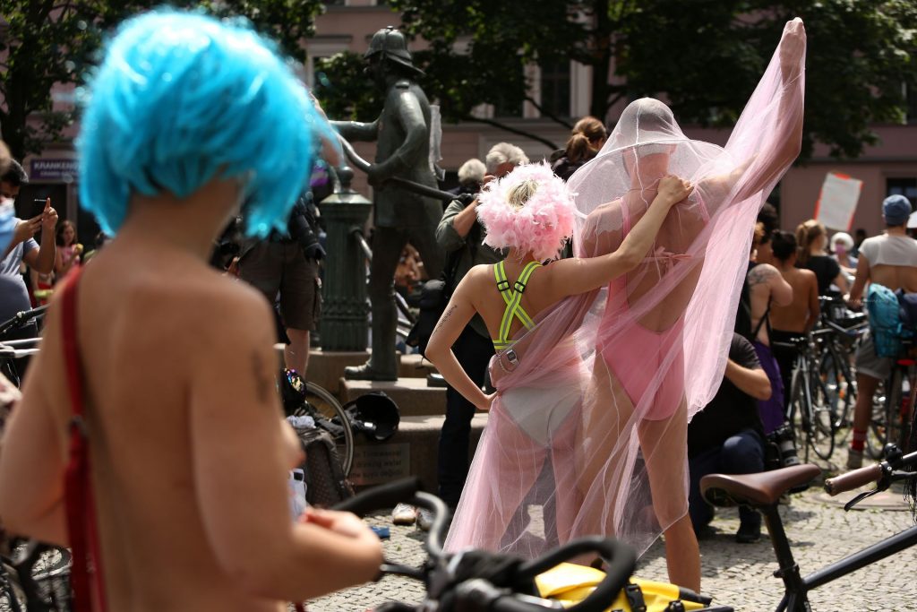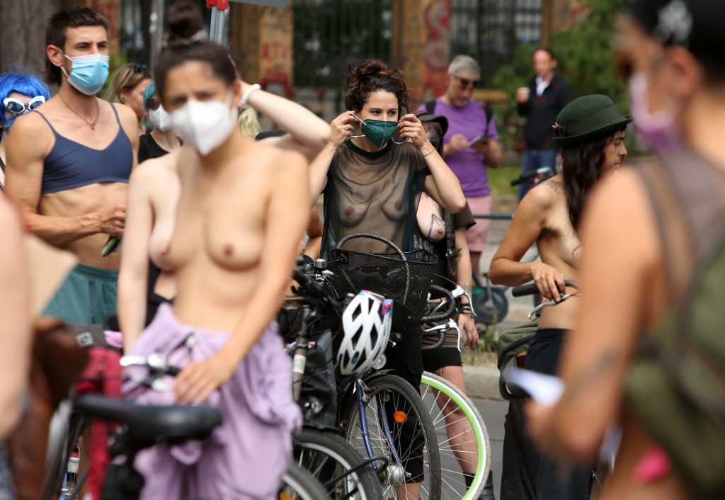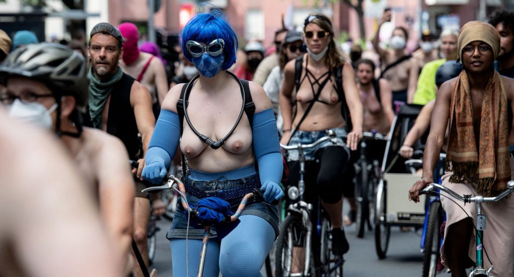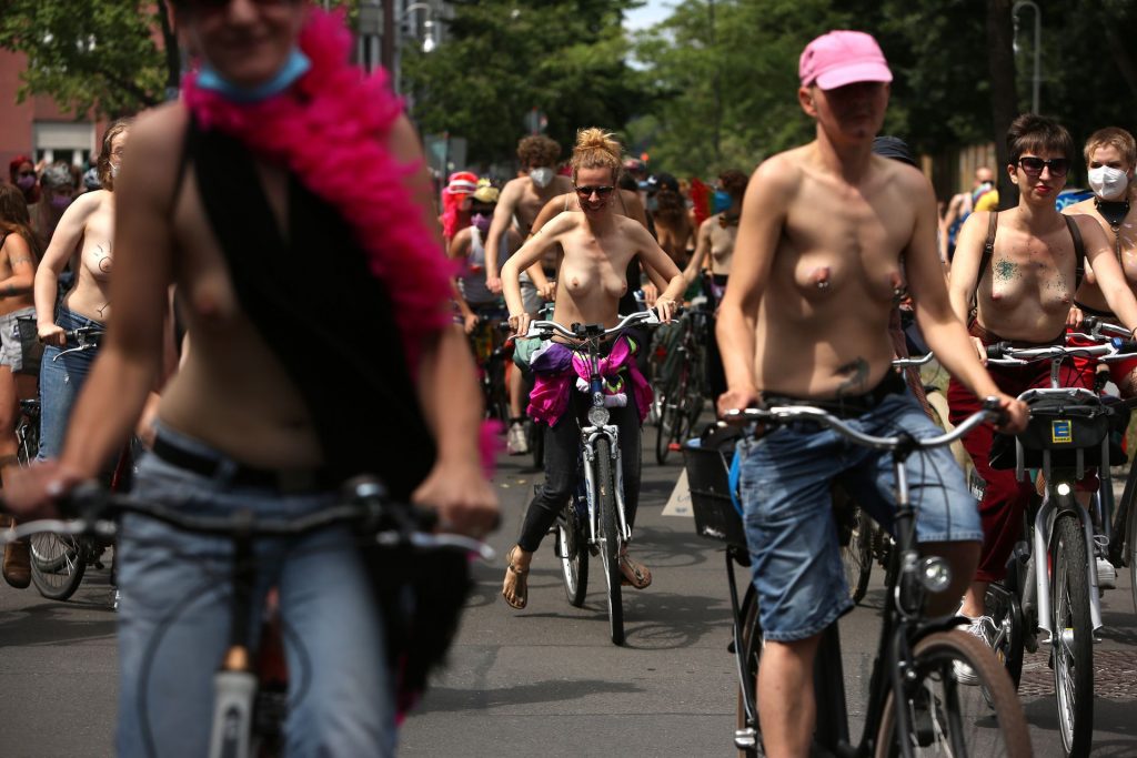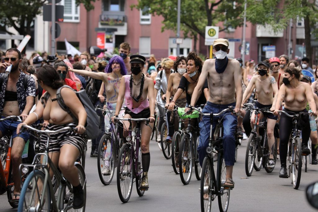 Los manifestantes montaron bicicletas en solidaridad con la ciudadana francesa Gabrielle Lebreton, a quien la policía le pidió que se cubriera mientras tomaba el sol topless en un parque de Berlín, argumentando que existe un doble estándar en cuanto a la diferencia entre la aceptación del derecho de los hombres frente al de las mujeres a estar topless en público.