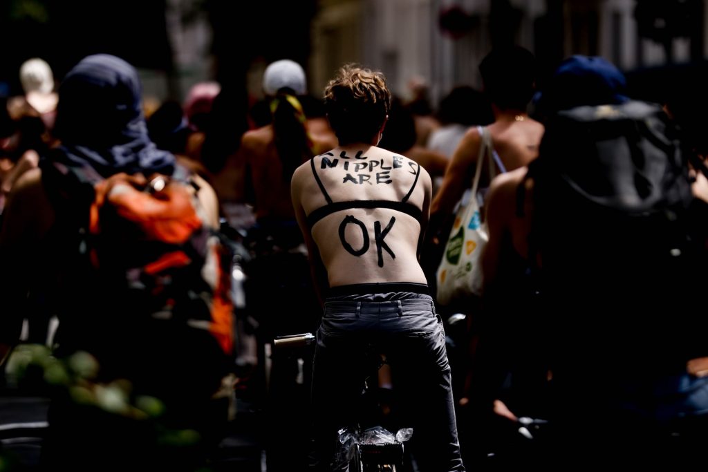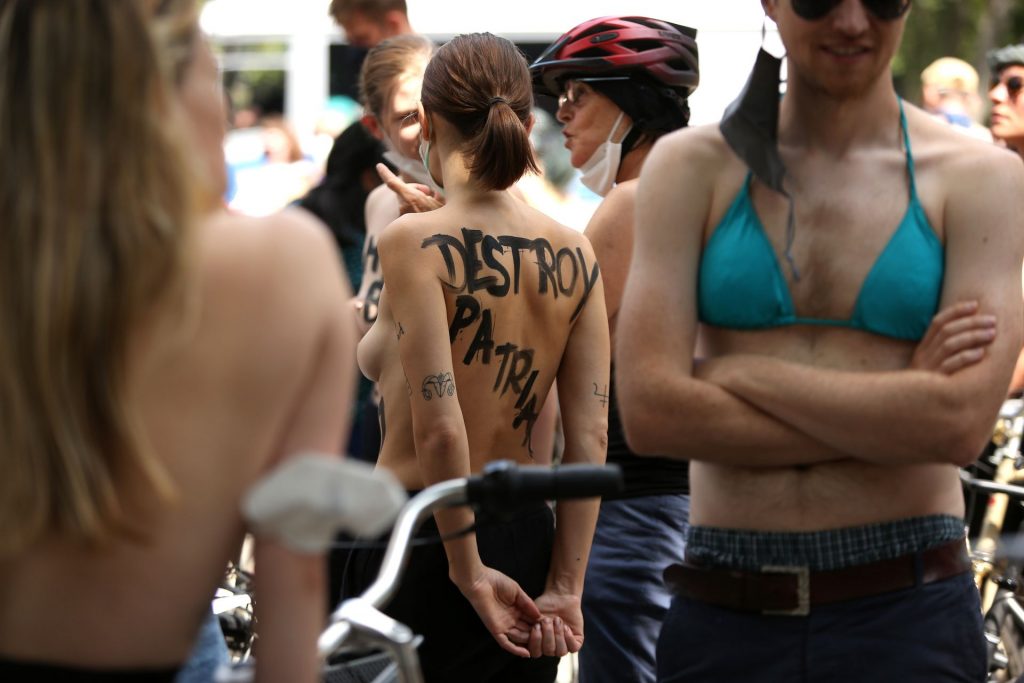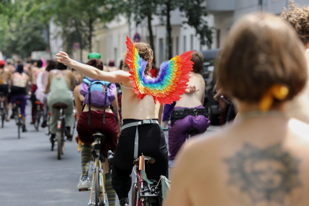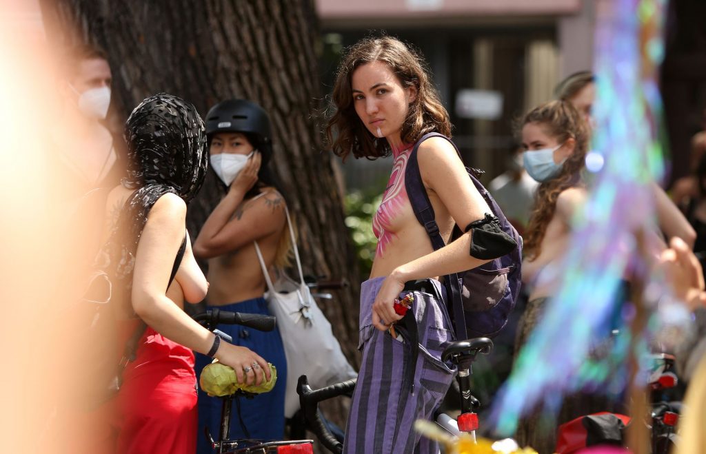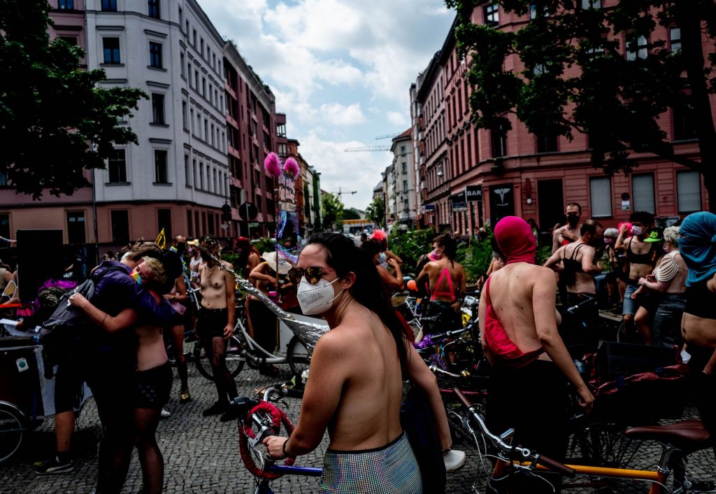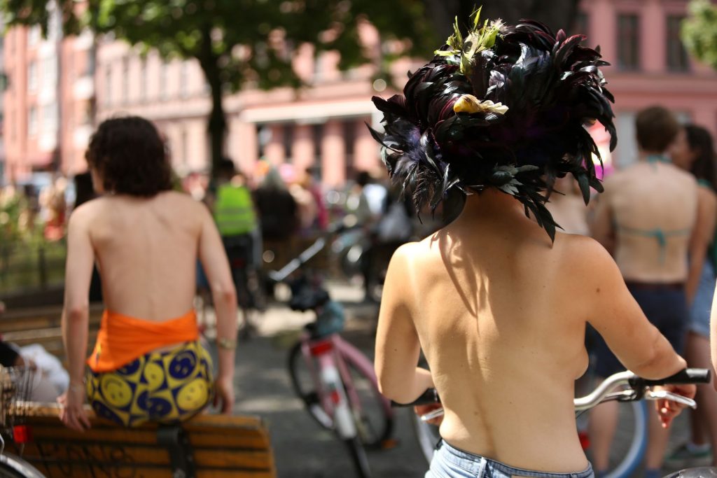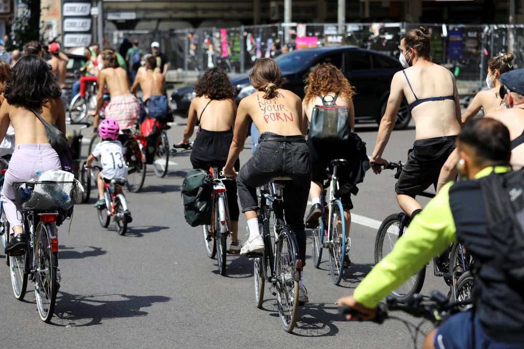 Los manifestantes montaron bicicletas en solidaridad con la ciudadana francesa Gabrielle Lebreton, a quien la policía le pidió que se cubriera mientras tomaba el sol topless en un parque de Berlín, argumentando que existe un doble estándar en cuanto a la diferencia entre la aceptación del derecho de los hombres frente al de las mujeres a estar topless en público.