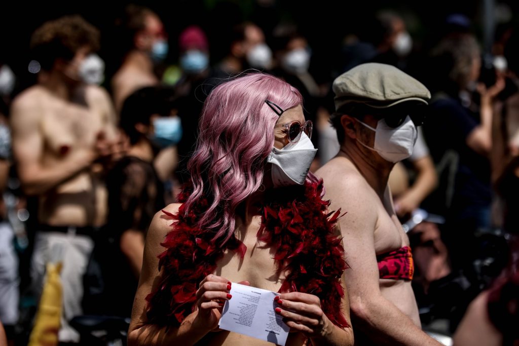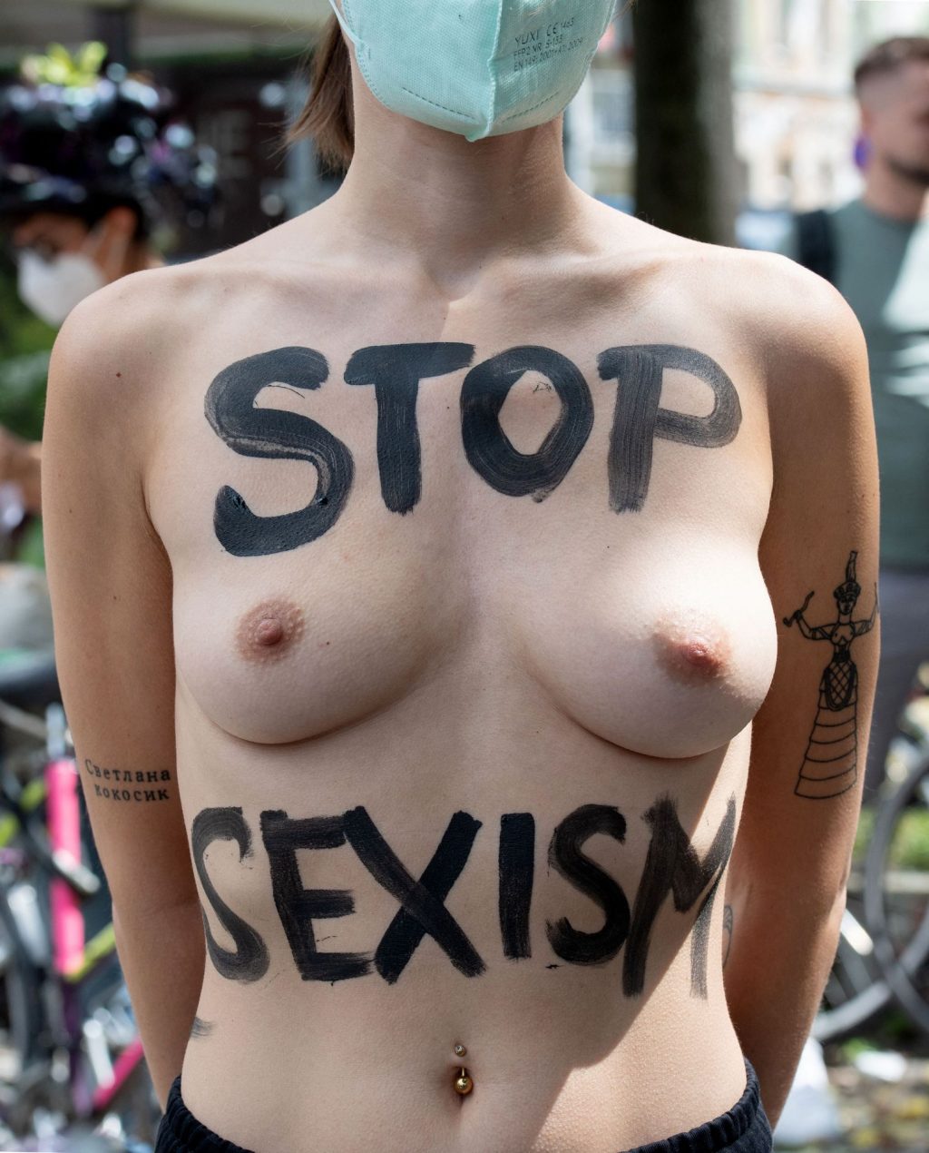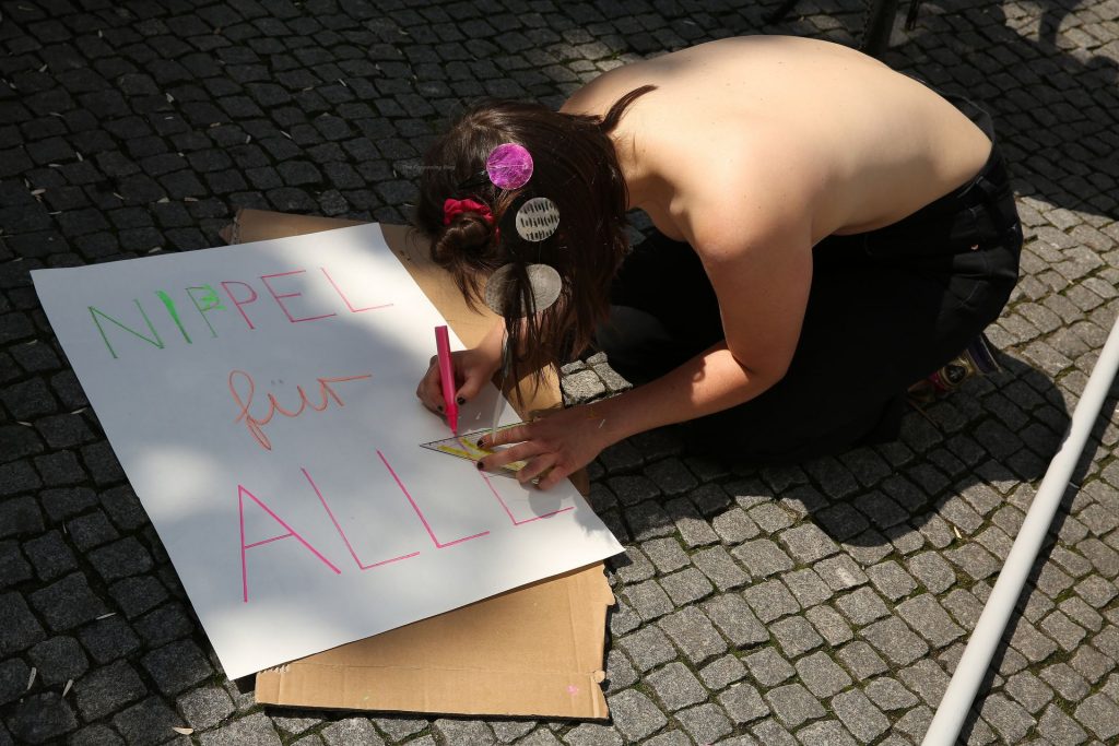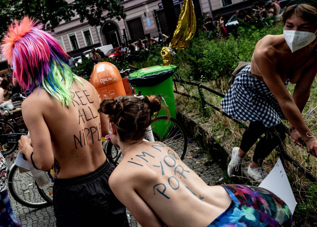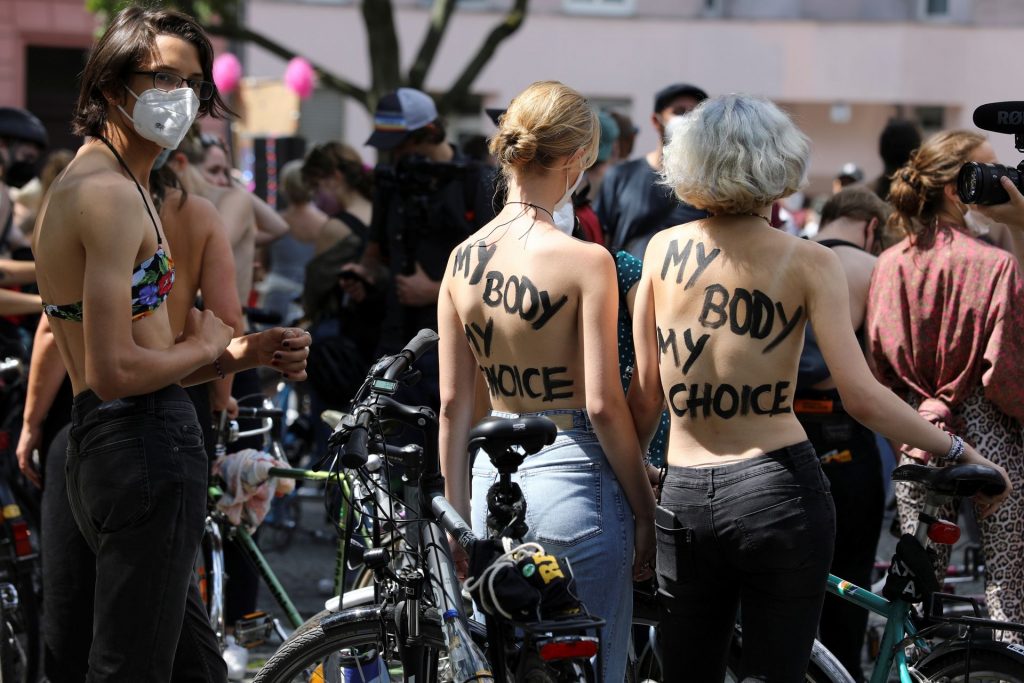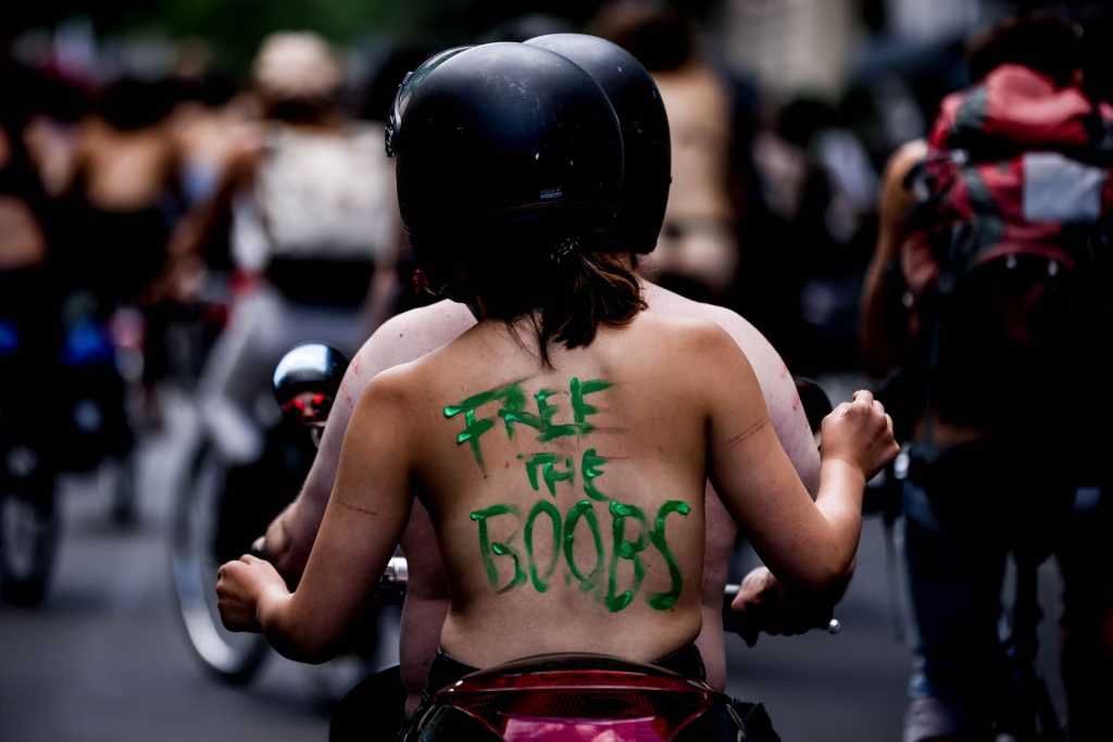 Los manifestantes montaron bicicletas en solidaridad con la ciudadana francesa Gabrielle Lebreton, a quien la policía le pidió que se cubriera mientras tomaba el sol topless en un parque de Berlín, argumentando que existe un doble estándar en cuanto a la diferencia entre la aceptación del derecho de los hombres frente al de las mujeres a estar topless en público.