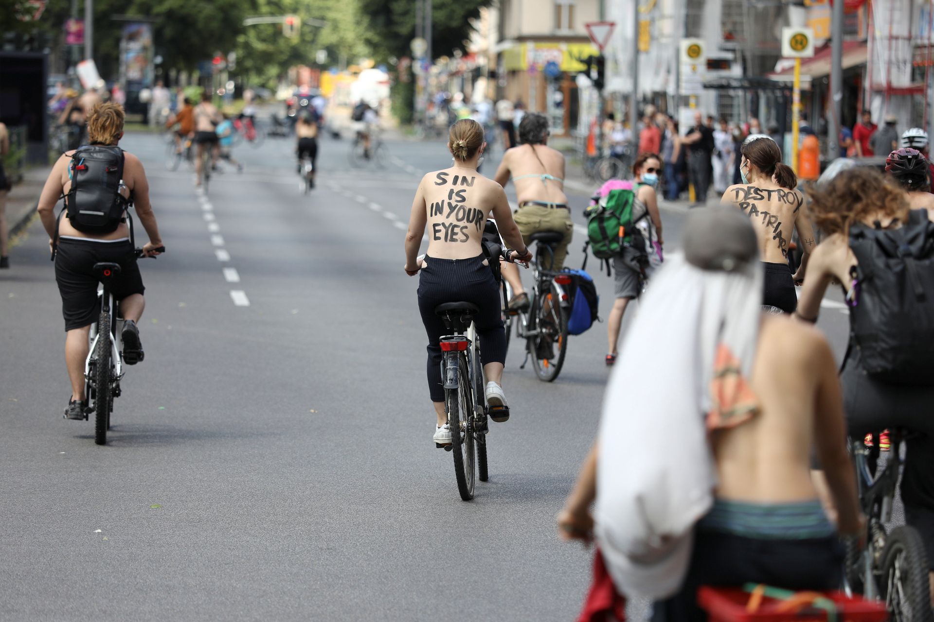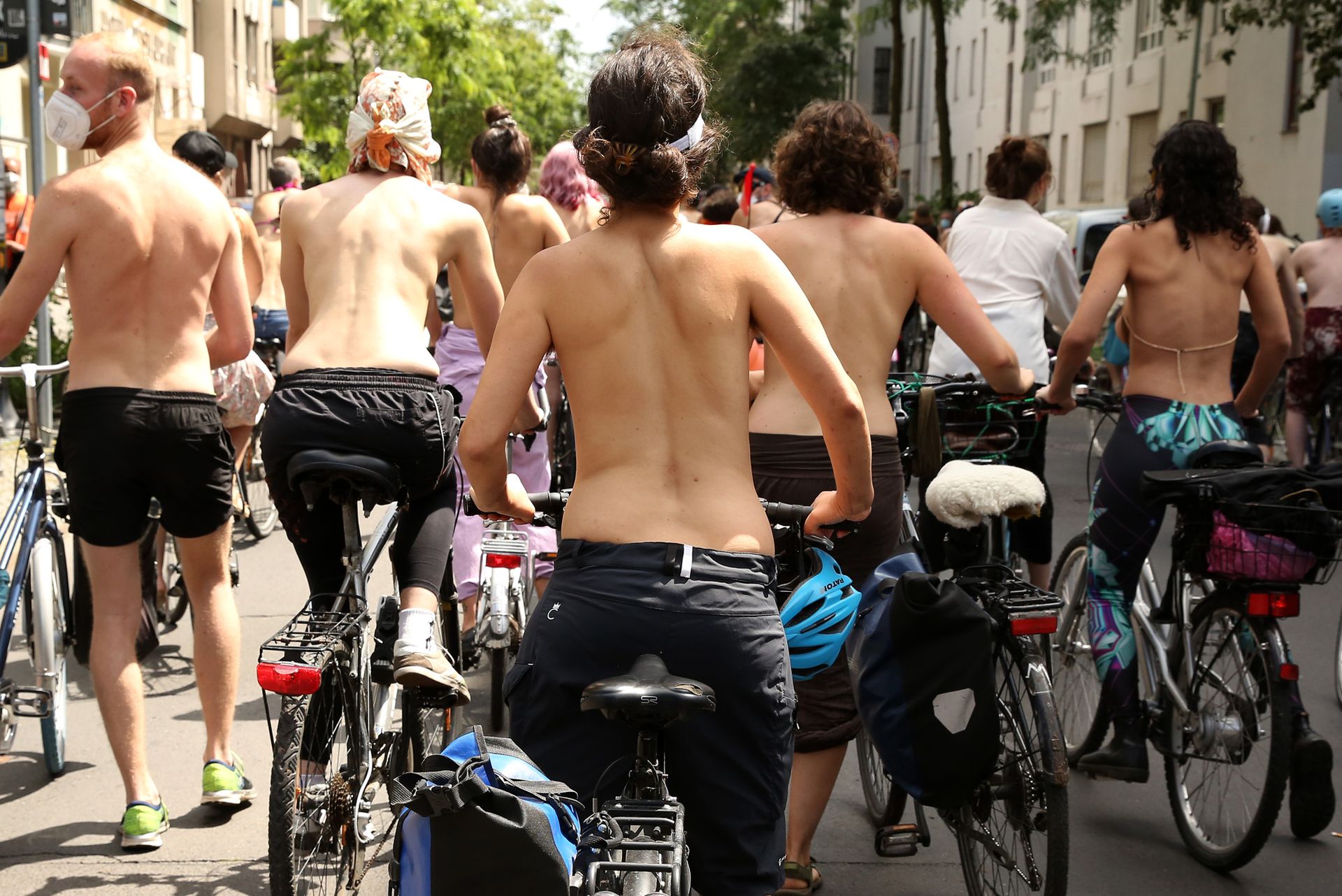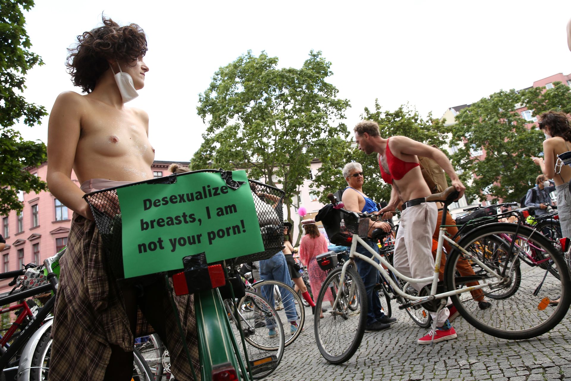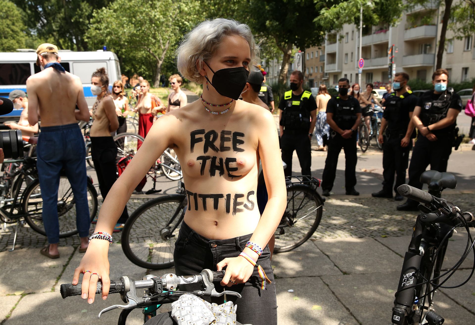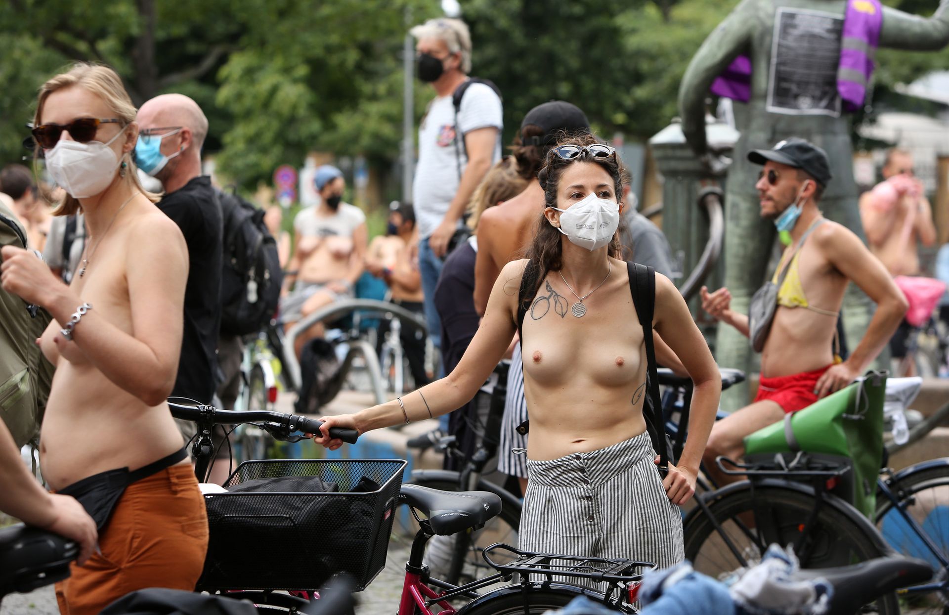 Los manifestantes montaron bicicletas en solidaridad con la ciudadana francesa Gabrielle Lebreton, a quien la policía le pidió que se cubriera mientras tomaba el sol topless en un parque de Berlín, argumentando que existe un doble estándar en cuanto a la diferencia entre la aceptación del derecho de los hombres frente al de las mujeres a estar topless en público.