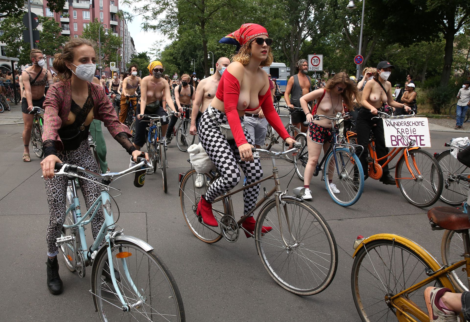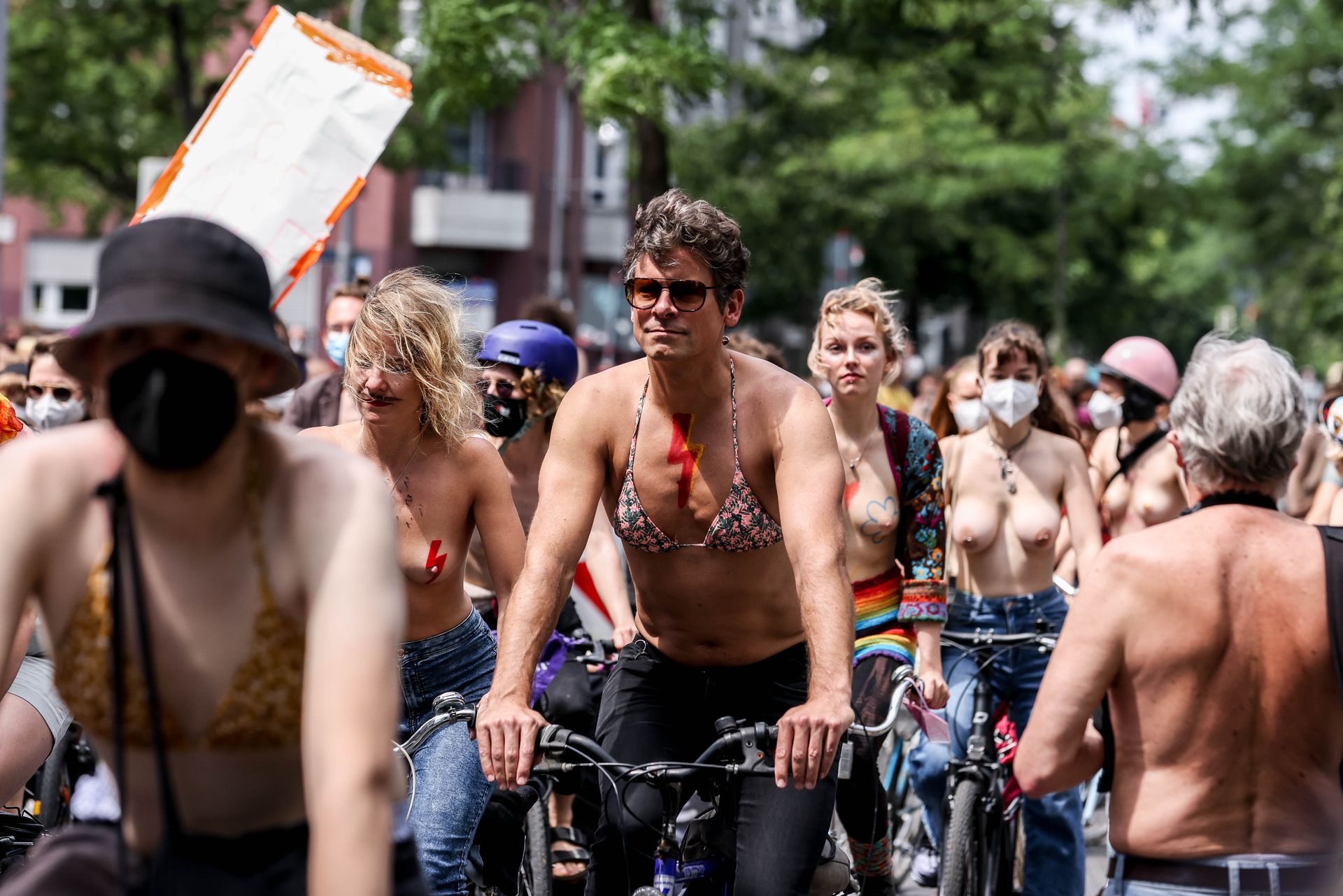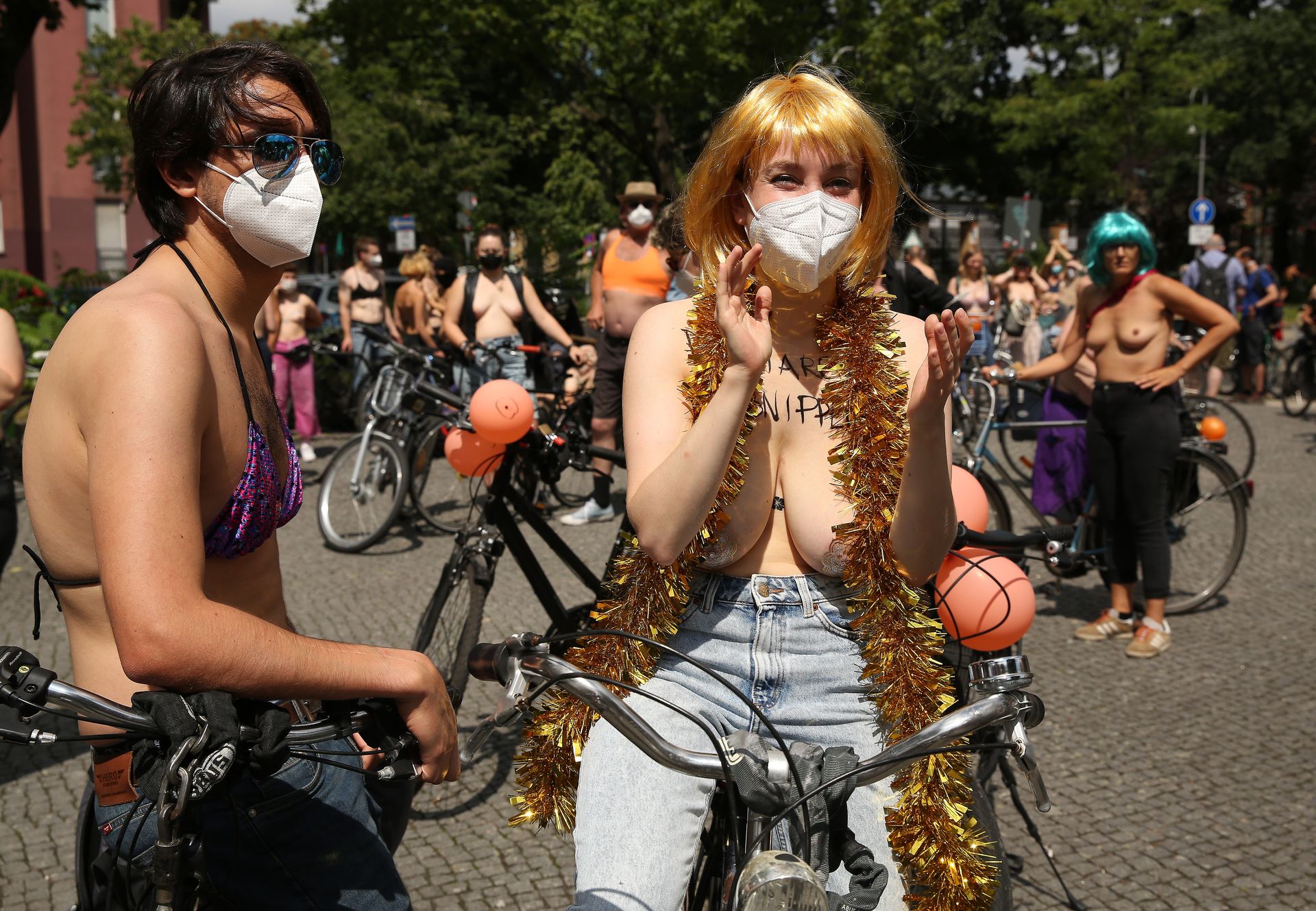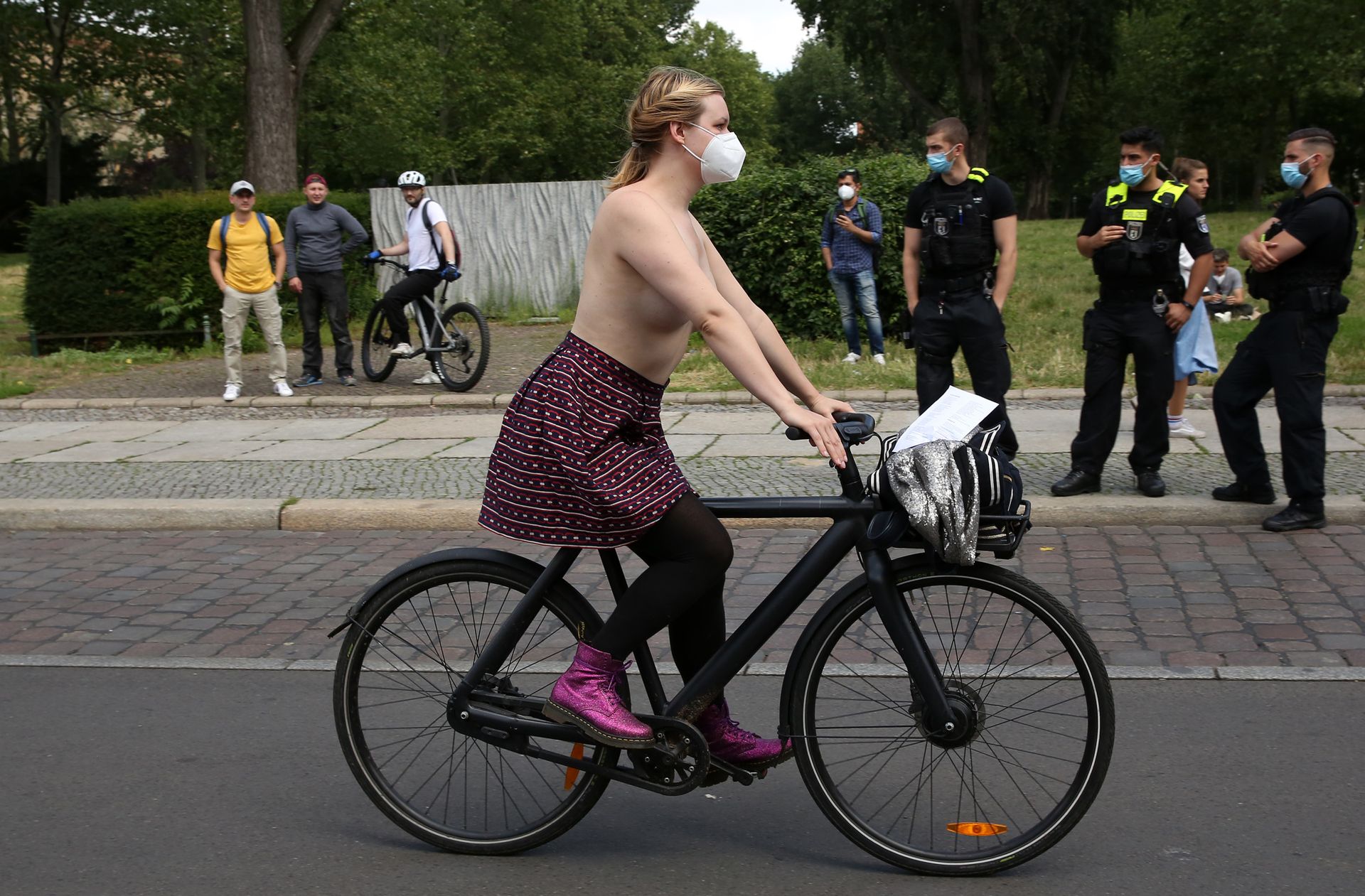 Los manifestantes montaron bicicletas en solidaridad con la ciudadana francesa Gabrielle Lebreton, a quien la policía le pidió que se cubriera mientras tomaba el sol topless en un parque de Berlín, argumentando que existe un doble estándar en cuanto a la diferencia entre la aceptación del derecho de los hombres frente al de las mujeres a estar topless en público.