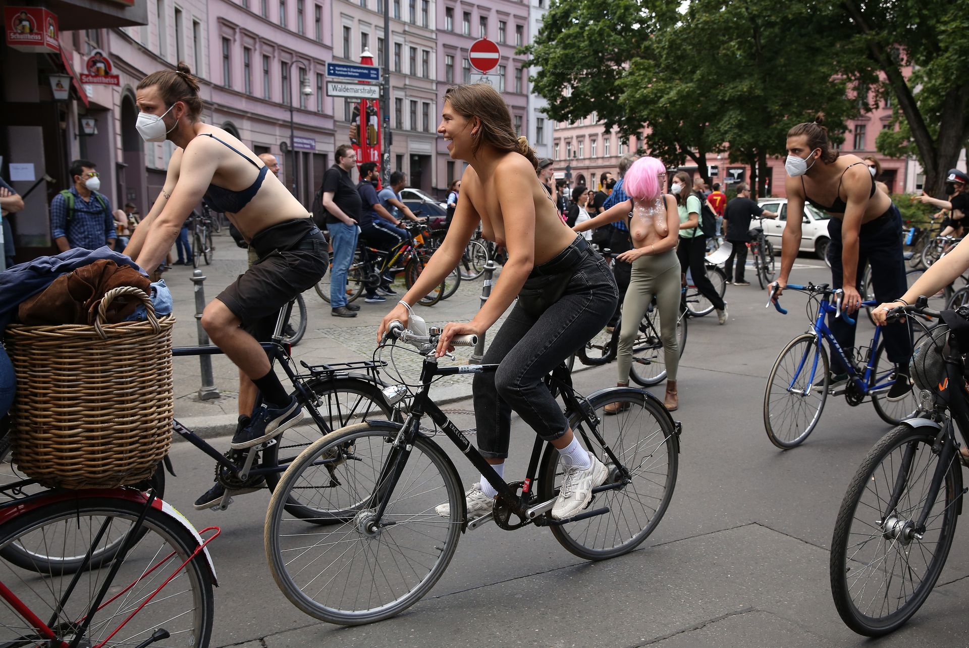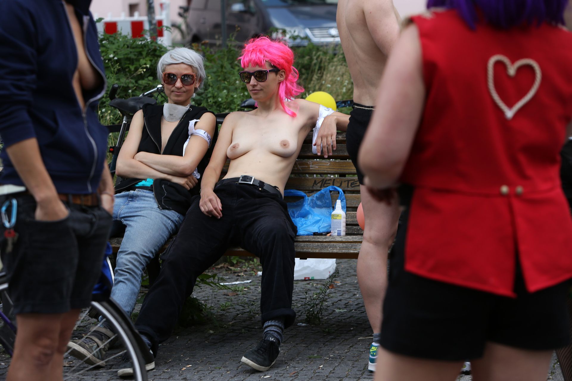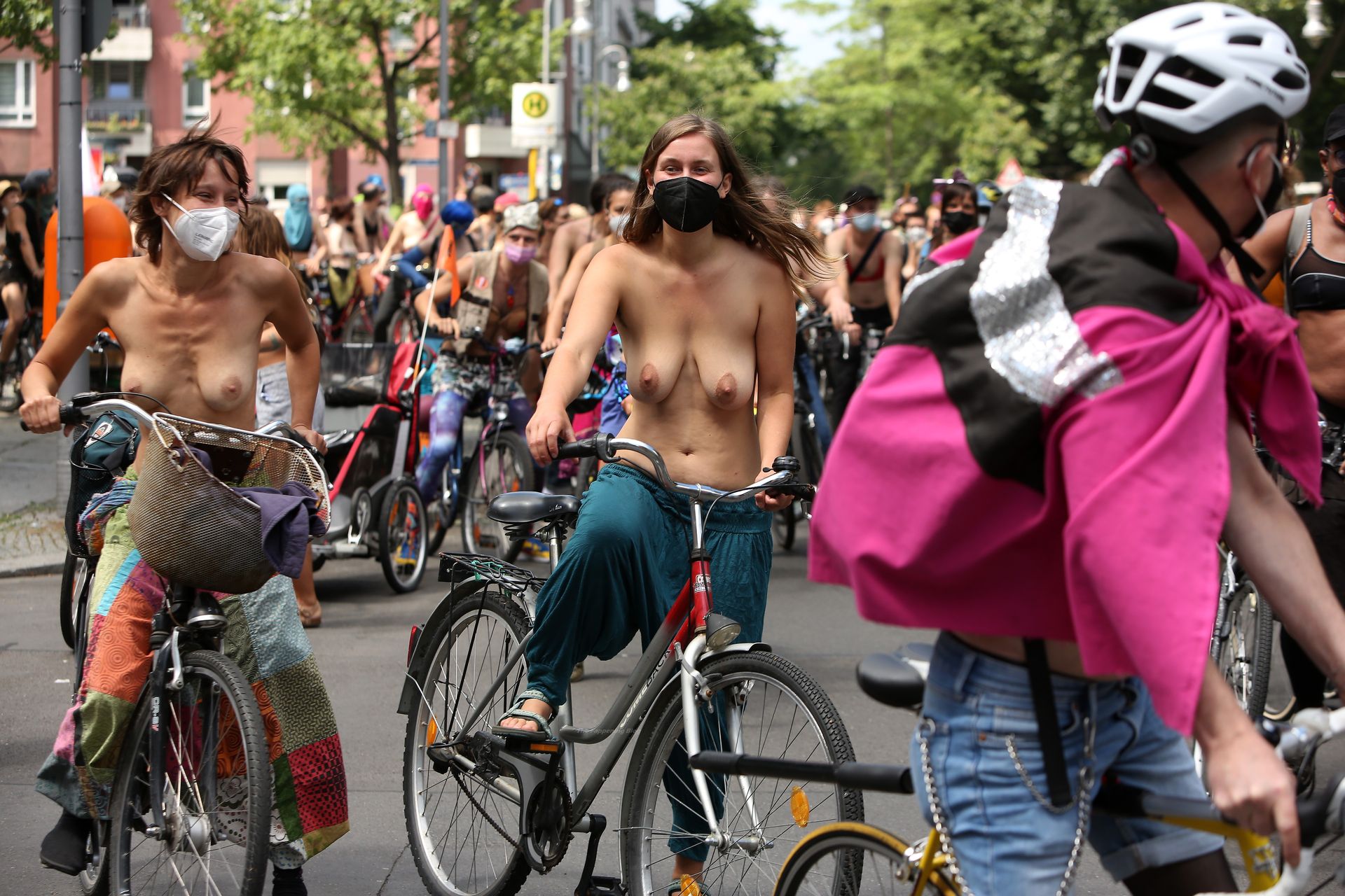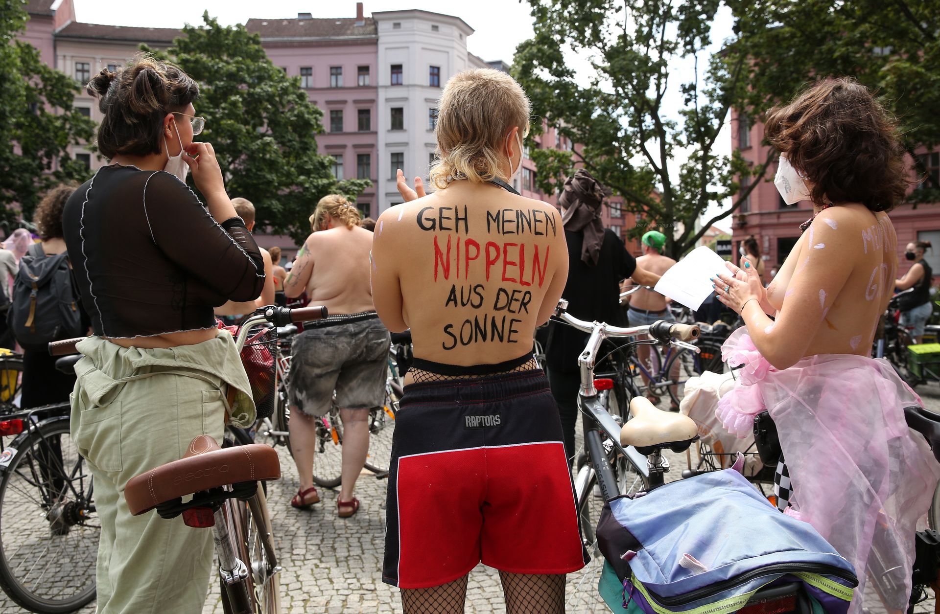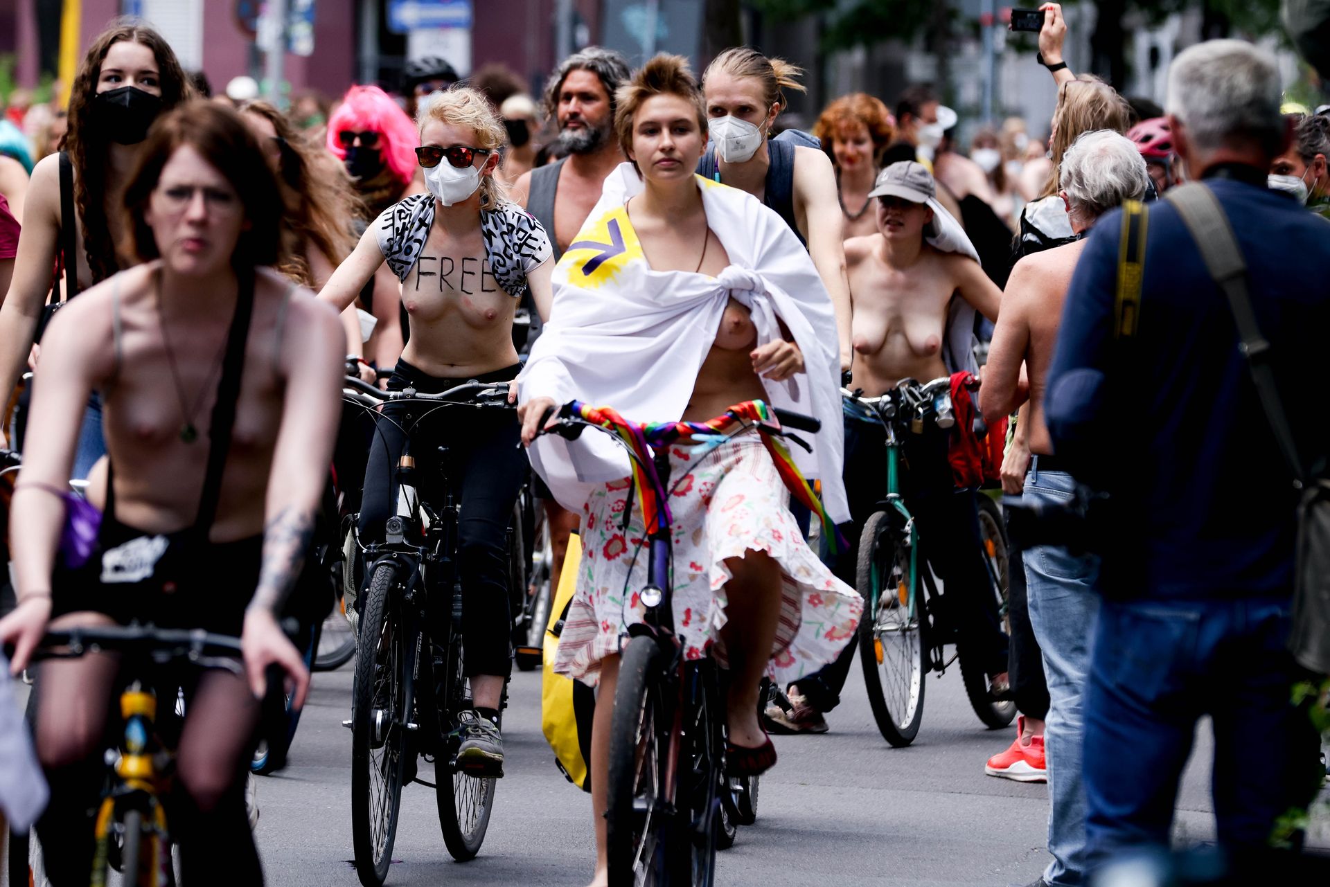 Los manifestantes montaron bicicletas en solidaridad con la ciudadana francesa Gabrielle Lebreton, a quien la policía le pidió que se cubriera mientras tomaba el sol topless en un parque de Berlín, argumentando que existe un doble estándar en cuanto a la diferencia entre la aceptación del derecho de los hombres frente al de las mujeres a estar topless en público.