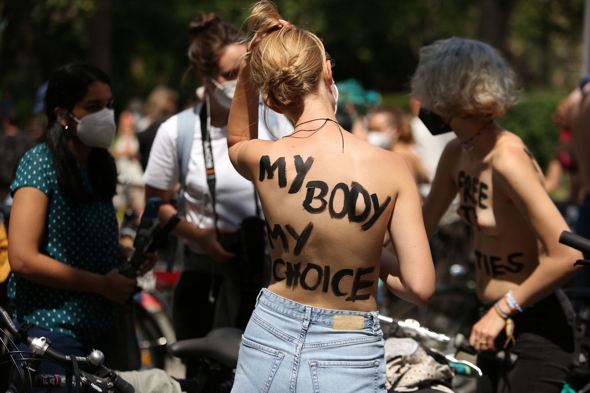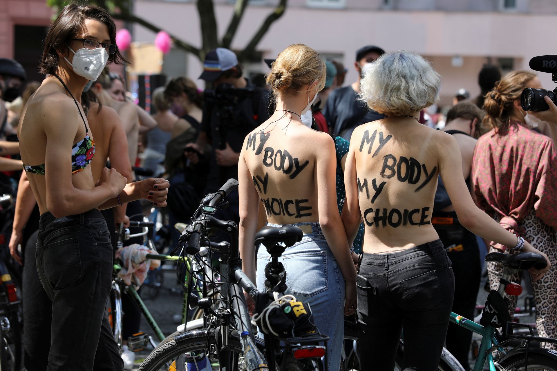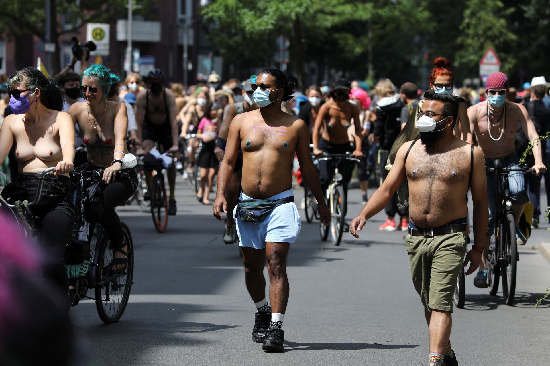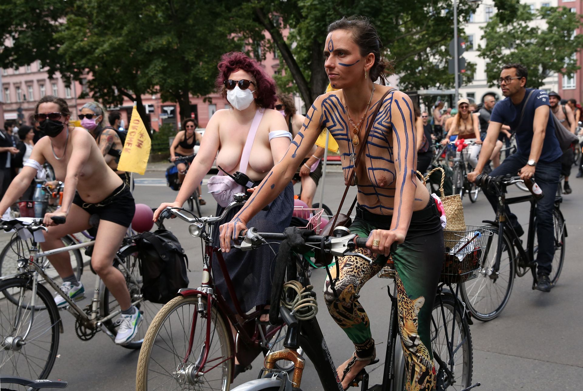 Los manifestantes montaron bicicletas en solidaridad con la ciudadana francesa Gabrielle Lebreton, a quien la policía le pidió que se cubriera mientras tomaba el sol topless en un parque de Berlín, argumentando que existe un doble estándar en cuanto a la diferencia entre la aceptación del derecho de los hombres frente al de las mujeres a estar topless en público.