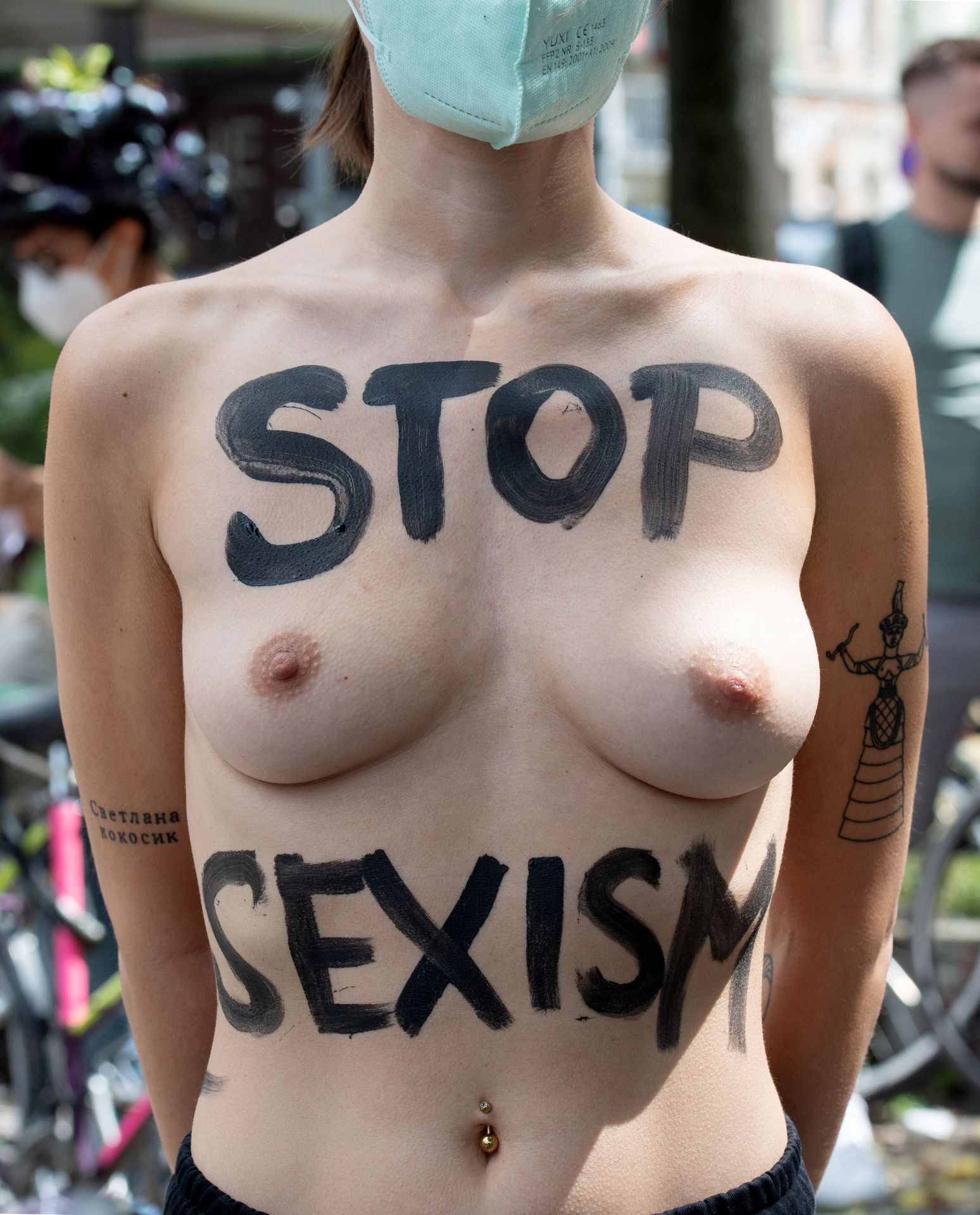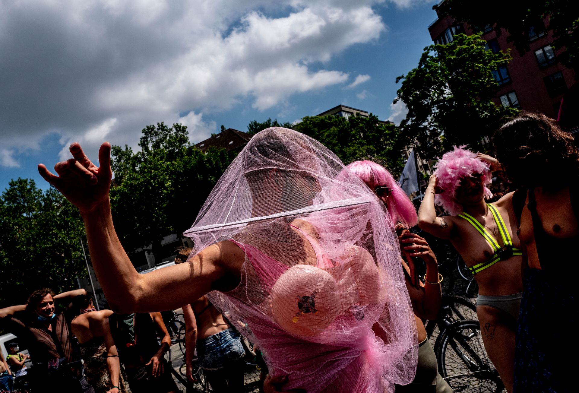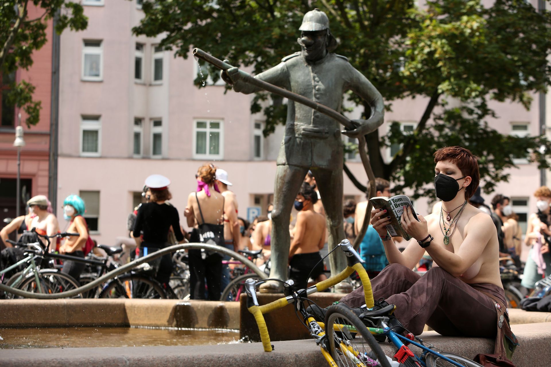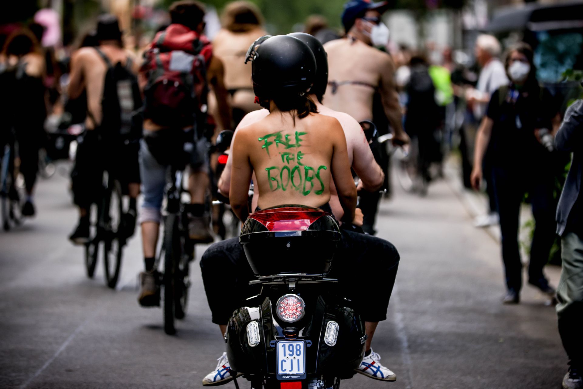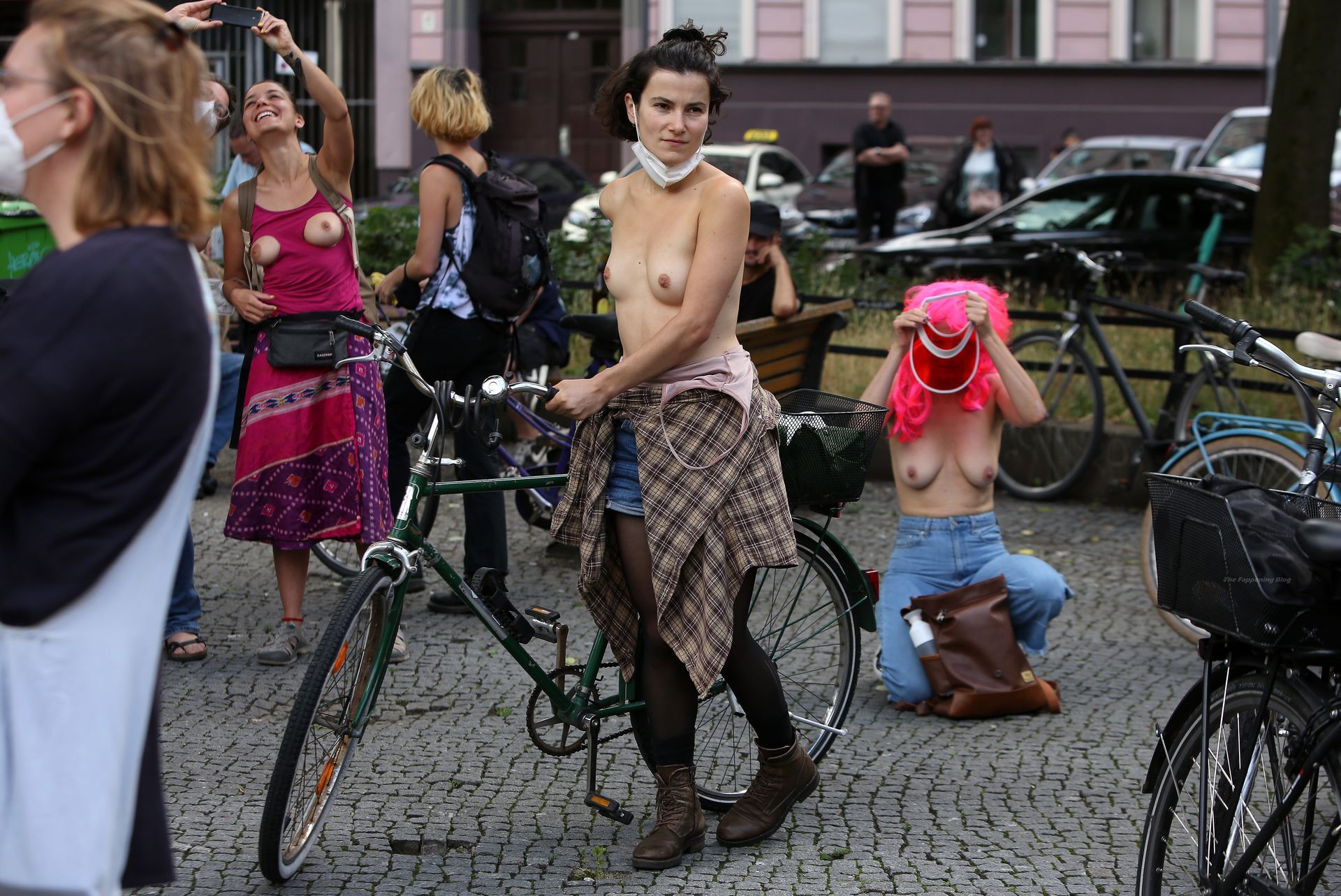 Los manifestantes montaron bicicletas en solidaridad con la ciudadana francesa Gabrielle Lebreton, a quien la policía le pidió que se cubriera mientras tomaba el sol topless en un parque de Berlín, argumentando que existe un doble estándar en cuanto a la diferencia entre la aceptación del derecho de los hombres frente al de las mujeres a estar topless en público.