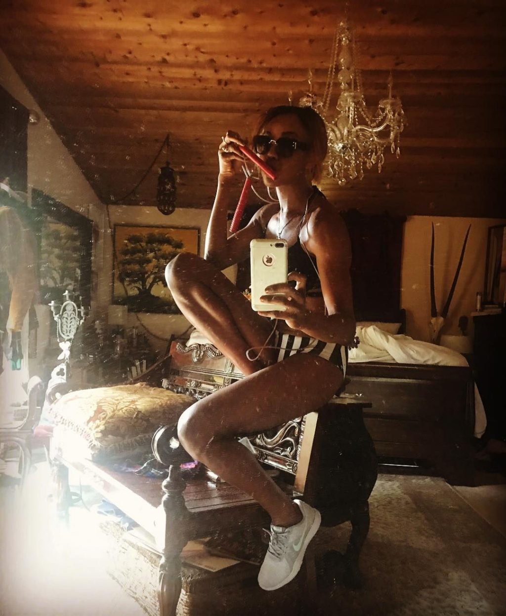 Ella tiene lápiz labial en los dientes en la foto con Stephanie.