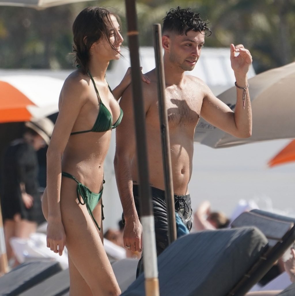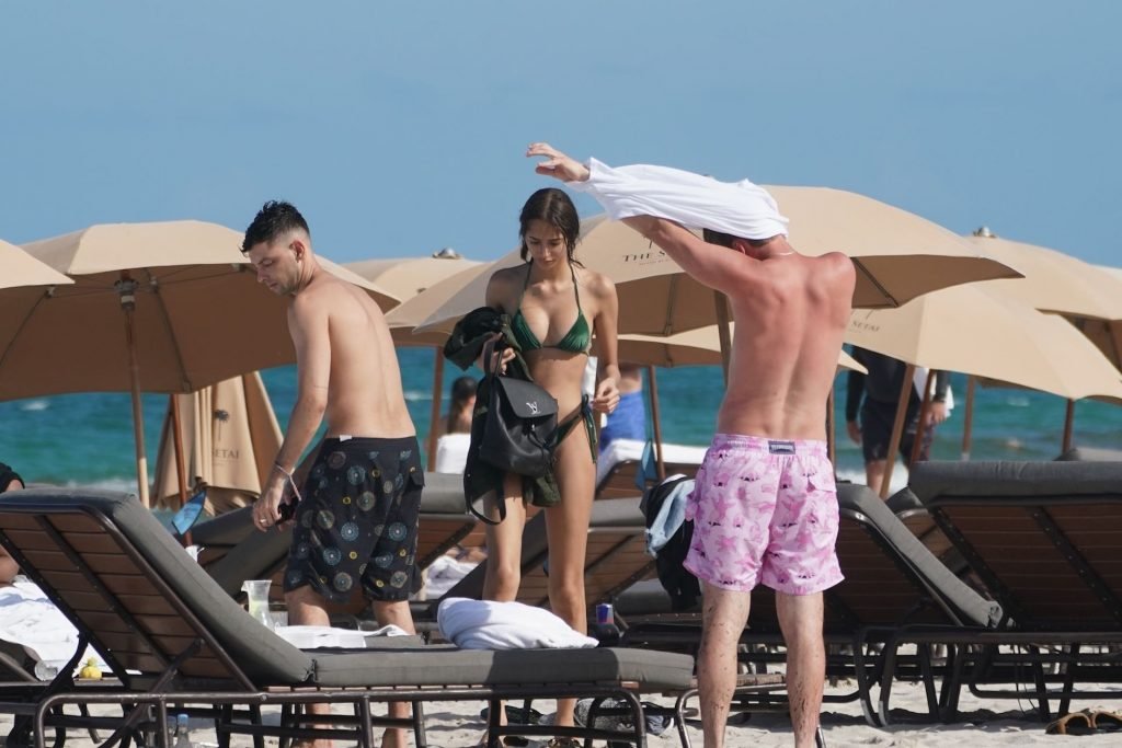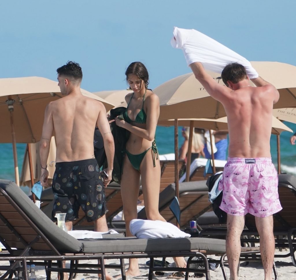 Skinny Dutch babe Yasmin Wijnaldum fue vista con un pequeño bikini verde en la playa de Miami Beach, 11/05/2019. La modelo de Victoria’s Secret fue vista con un acompañante masculino misterioso y amigos durante su salida al sol.