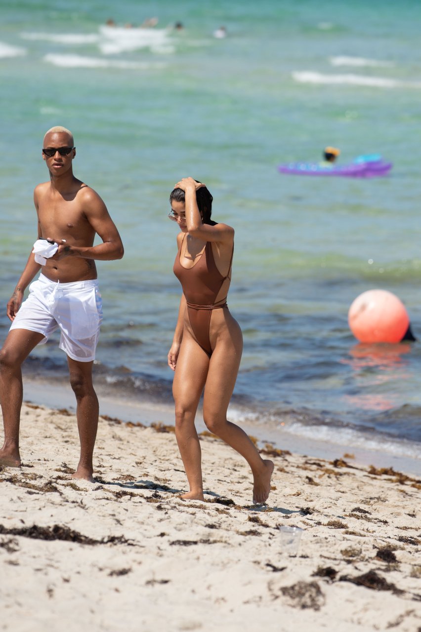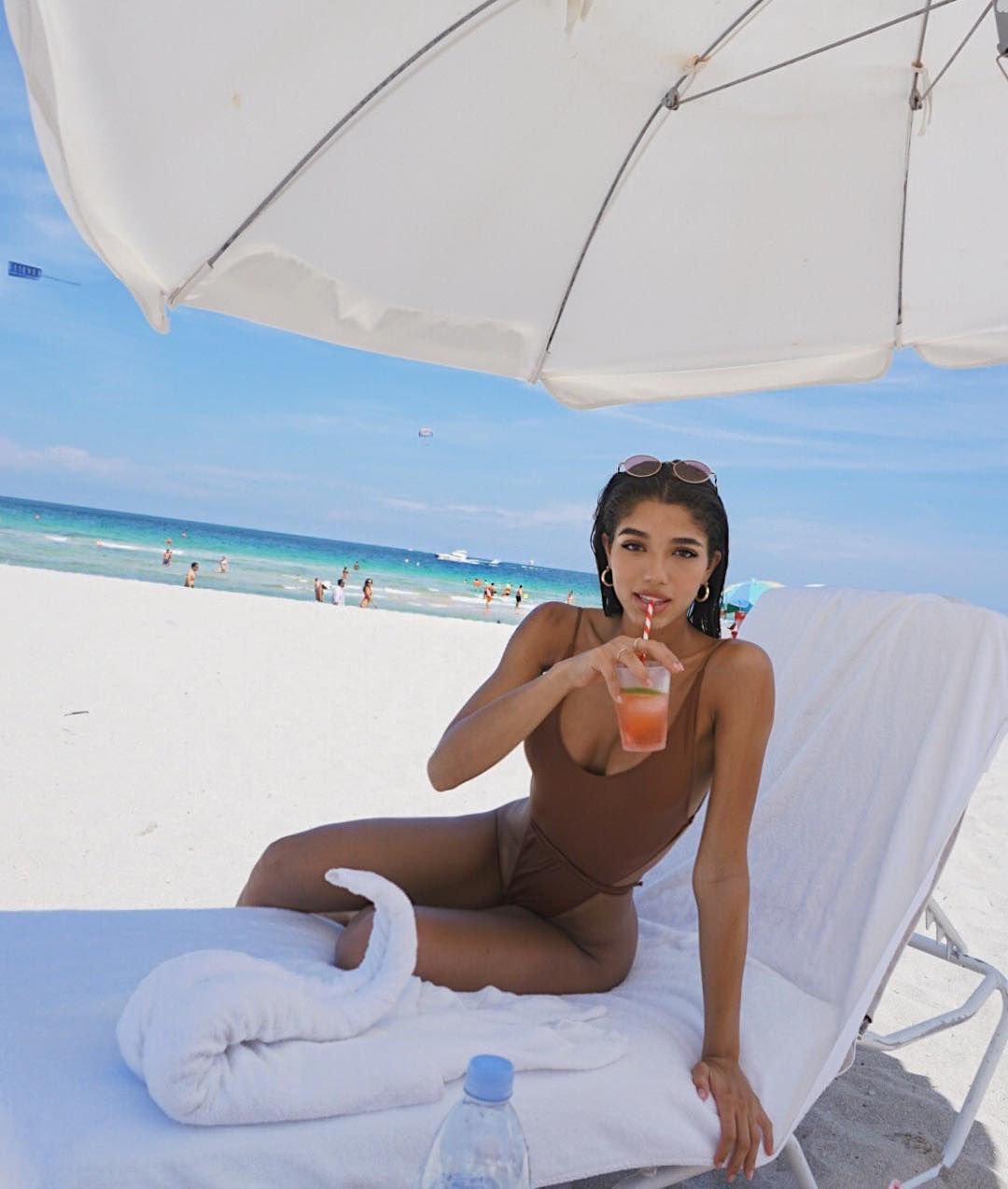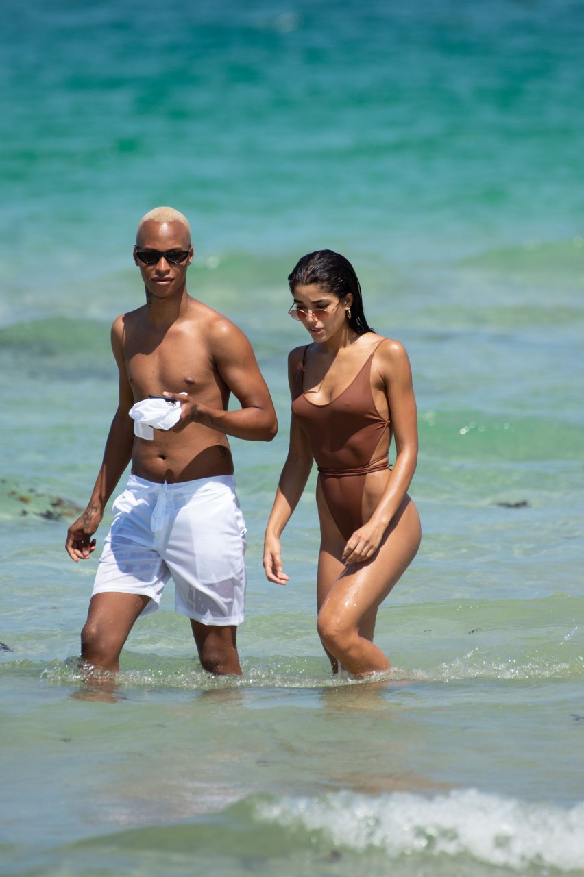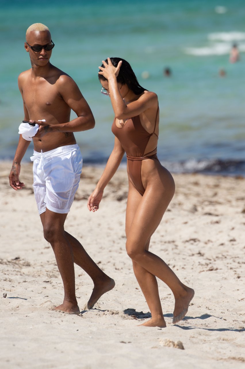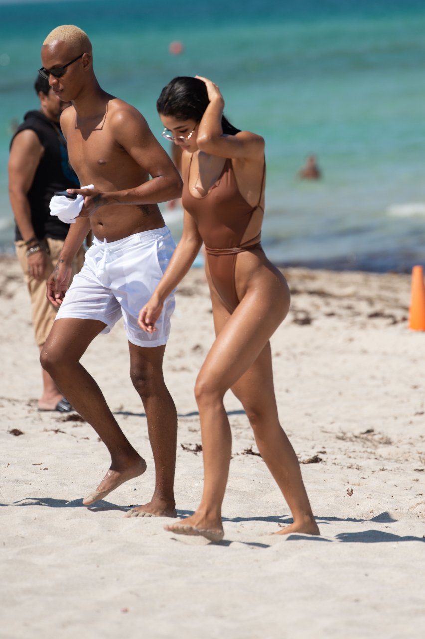 La modelo de Instagram Yovanna Ventura disfrutó de un día soleado con amigos en la playa de Miami Beach, 14/07/2018. La morena de 22 años llevaba un traje de baño marrón de una pieza mientras se relajaba con sus amigos.
