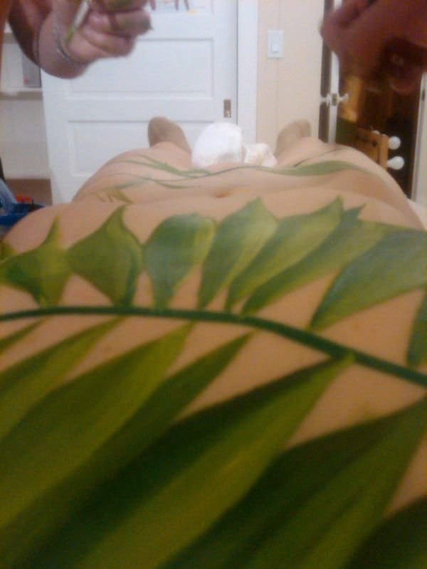 En cuanto a la pintura corporal, esa pintura azul verdosa está envolviendo el lado equivocado de su cadera. También debería tener picos para las hojas y una espina que atraviese el centro.