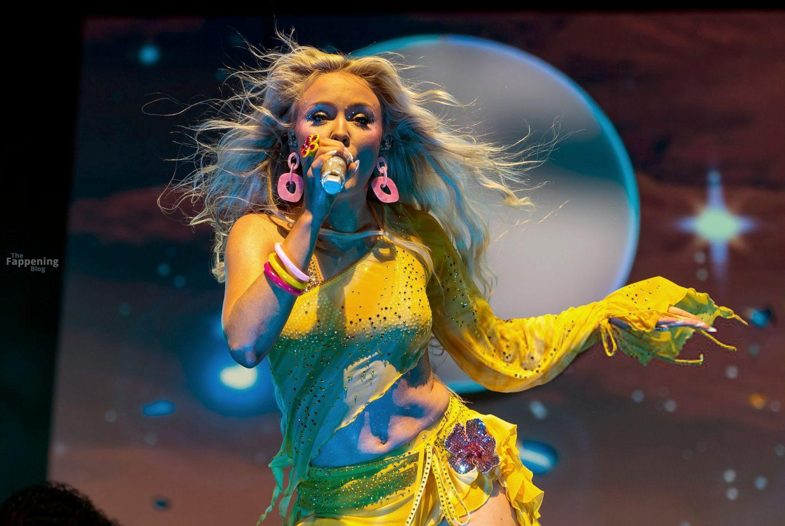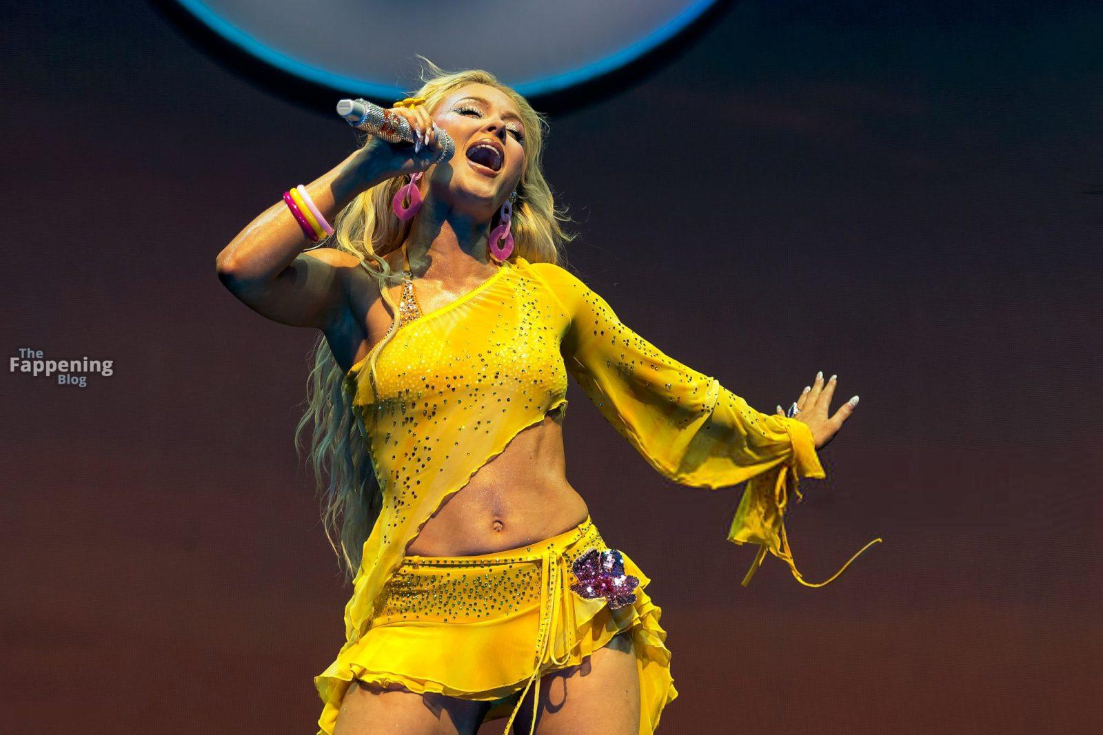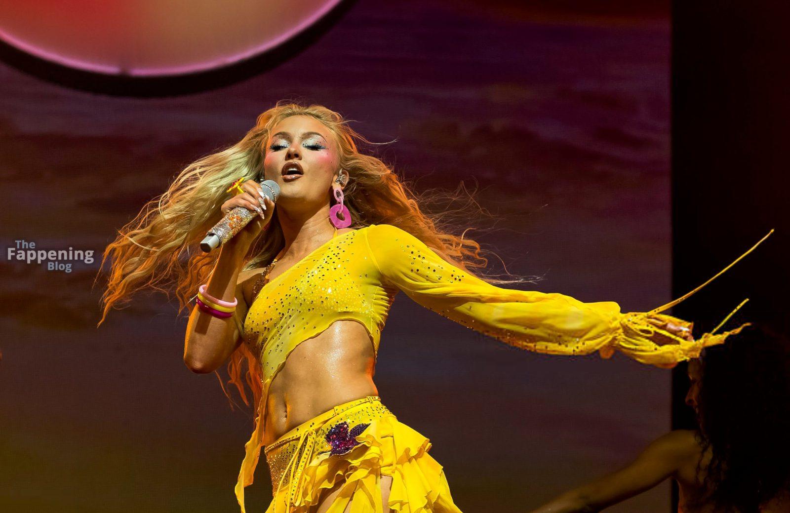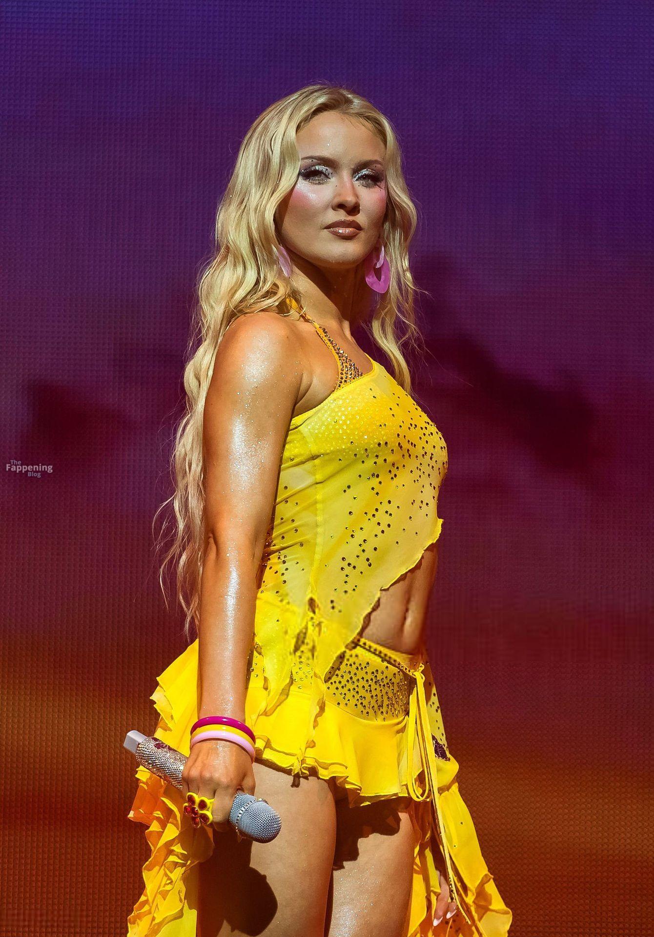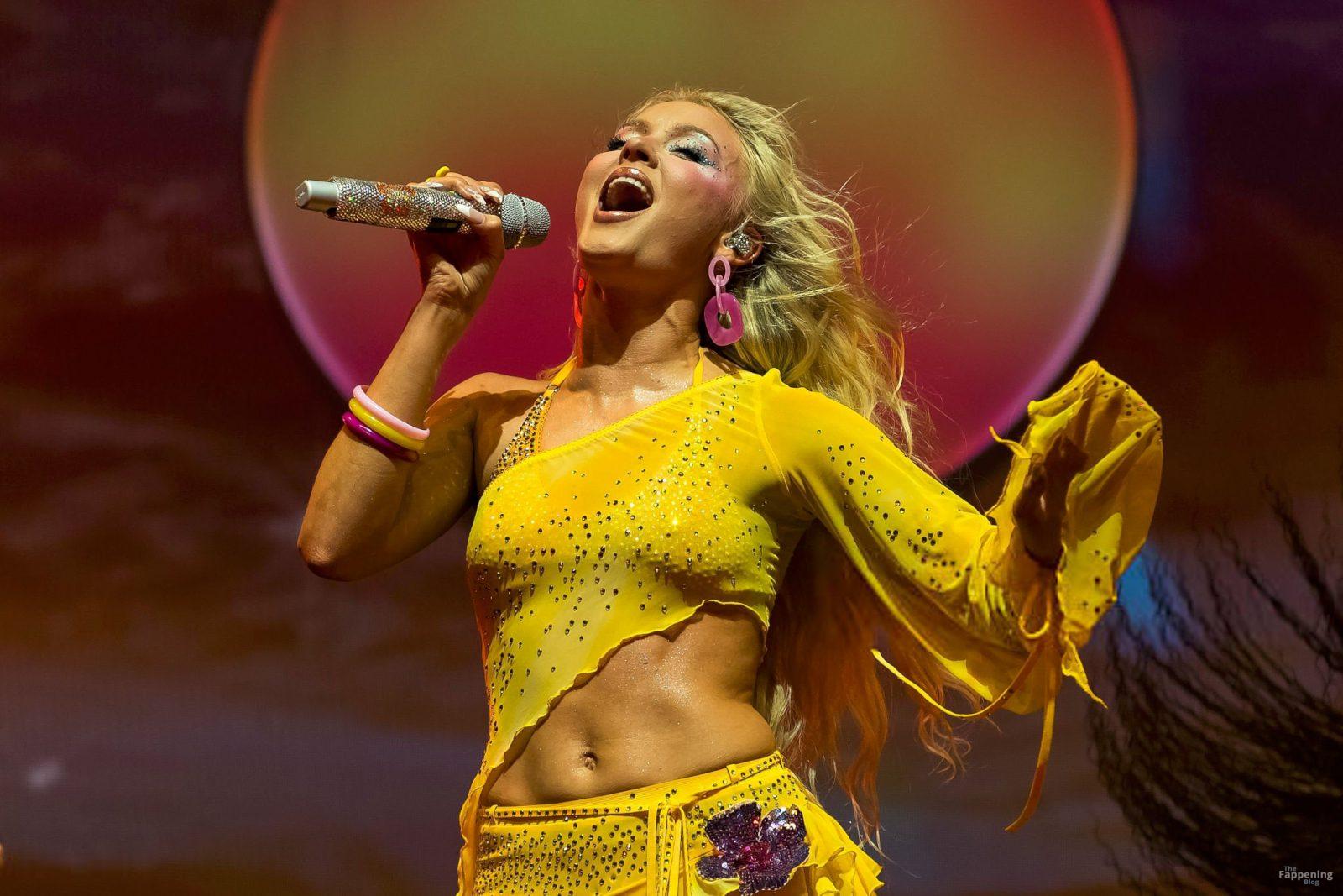 Zara Larsson subió al escenario del OVO Arena Wembley con un top corto amarillo transparente y una minifalda que mostraban sus abdominales y piernas.