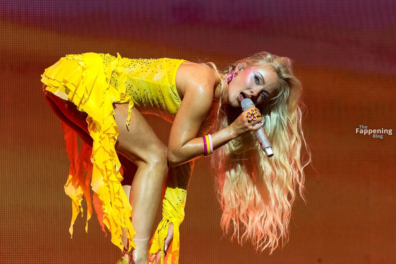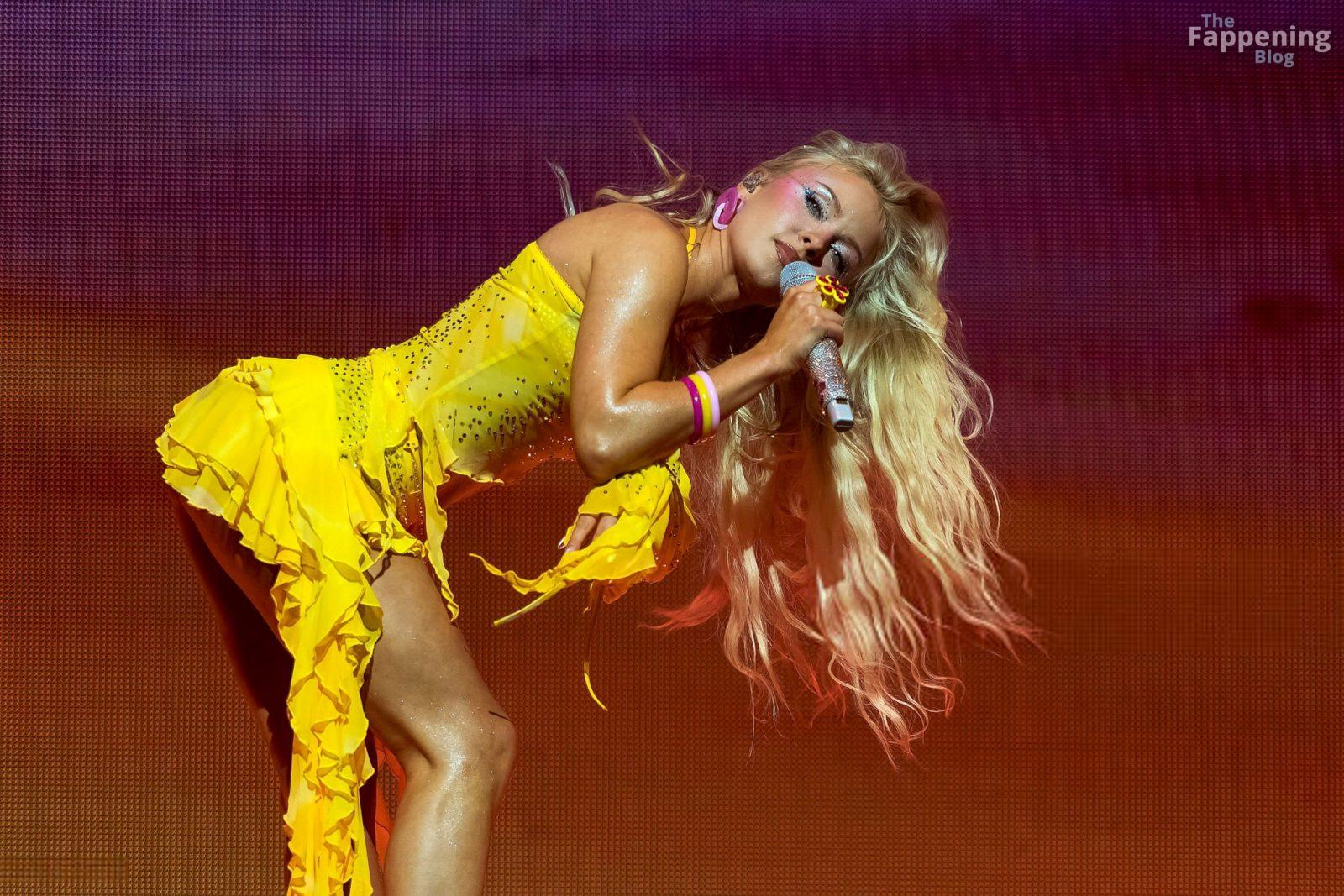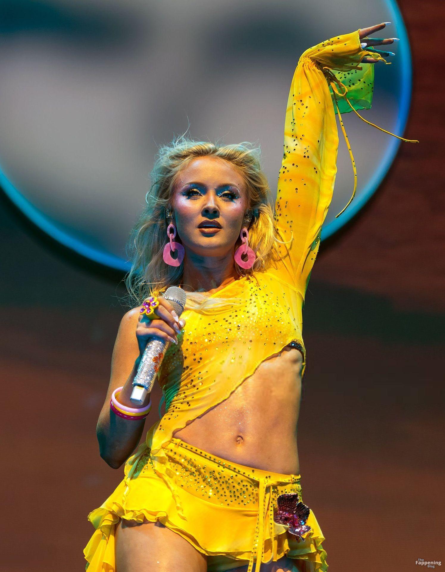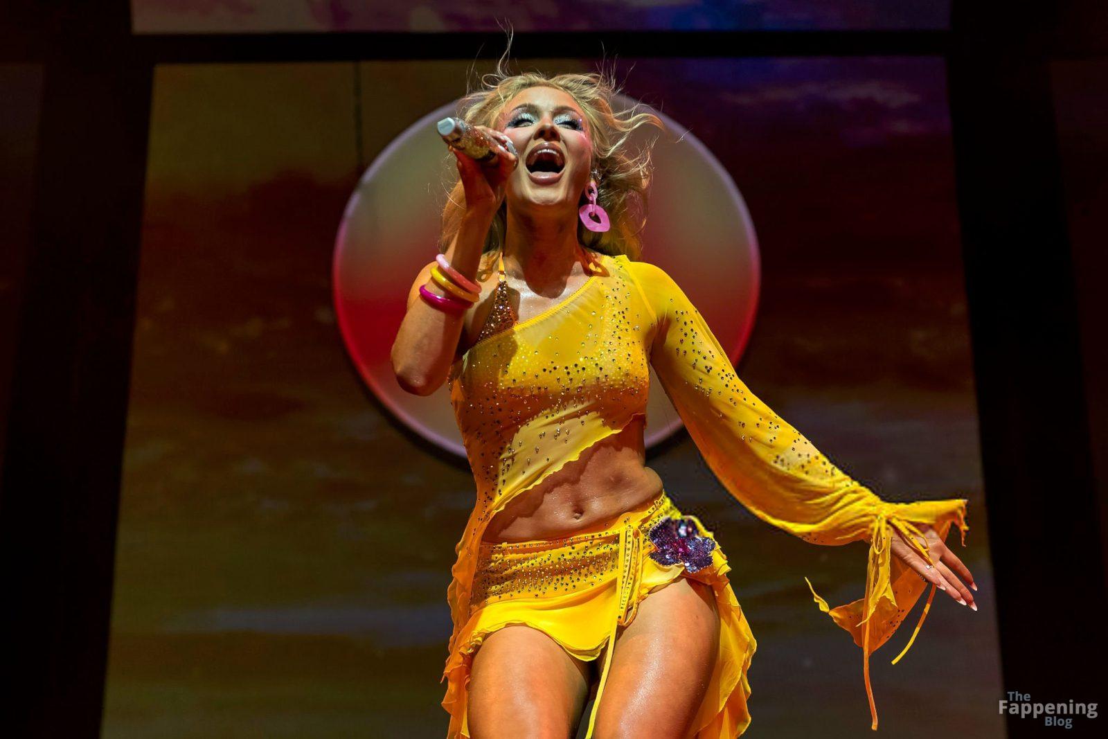Zara Larsson subió al escenario del OVO Arena Wembley con un top corto amarillo transparente y una minifalda que mostraban sus abdominales y piernas.