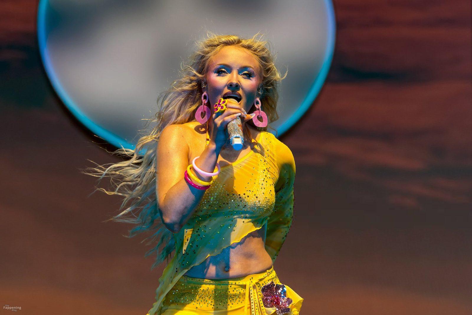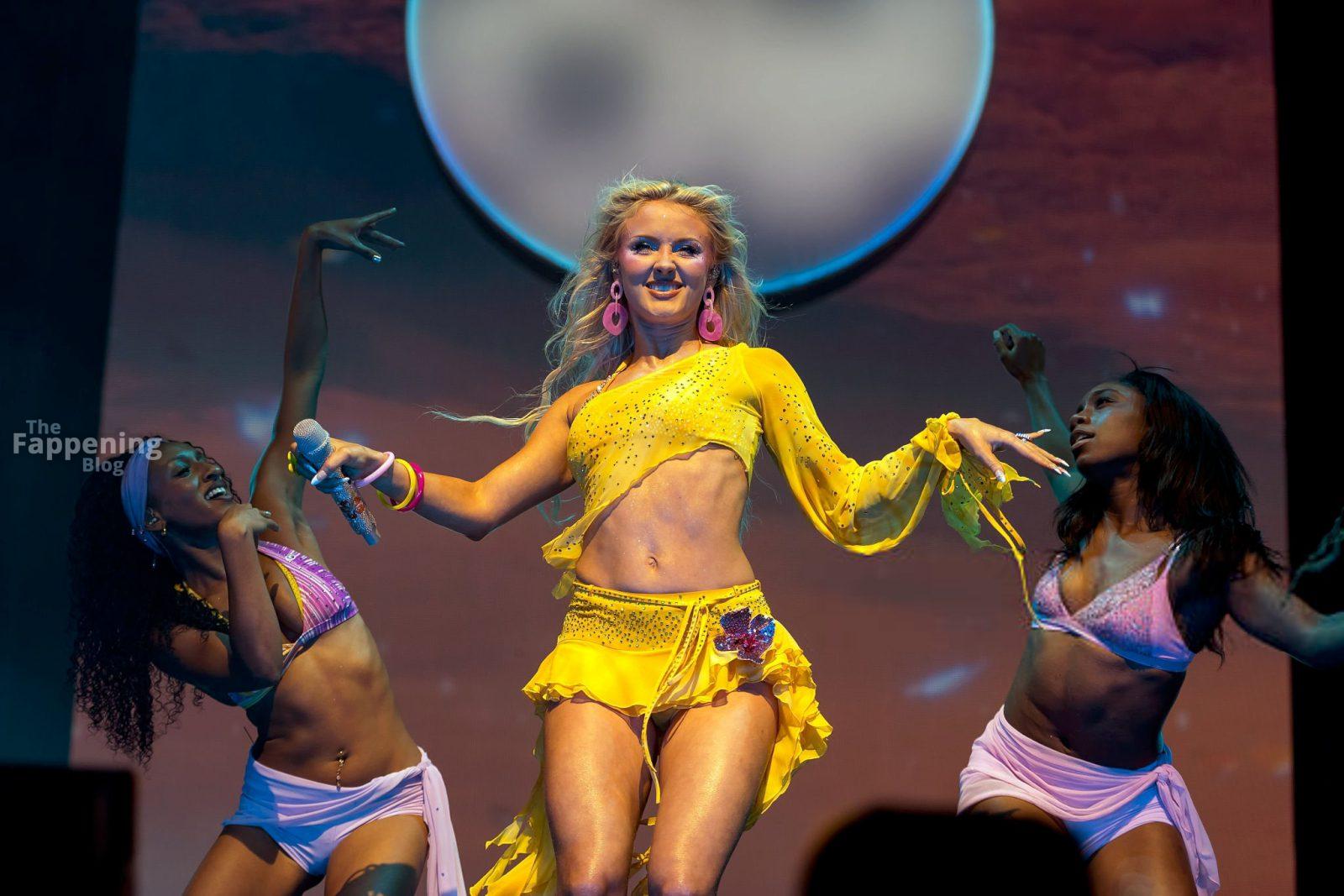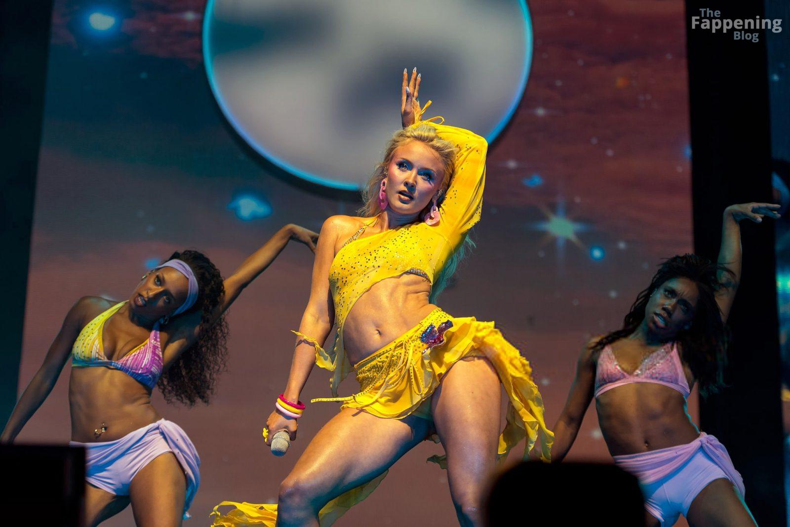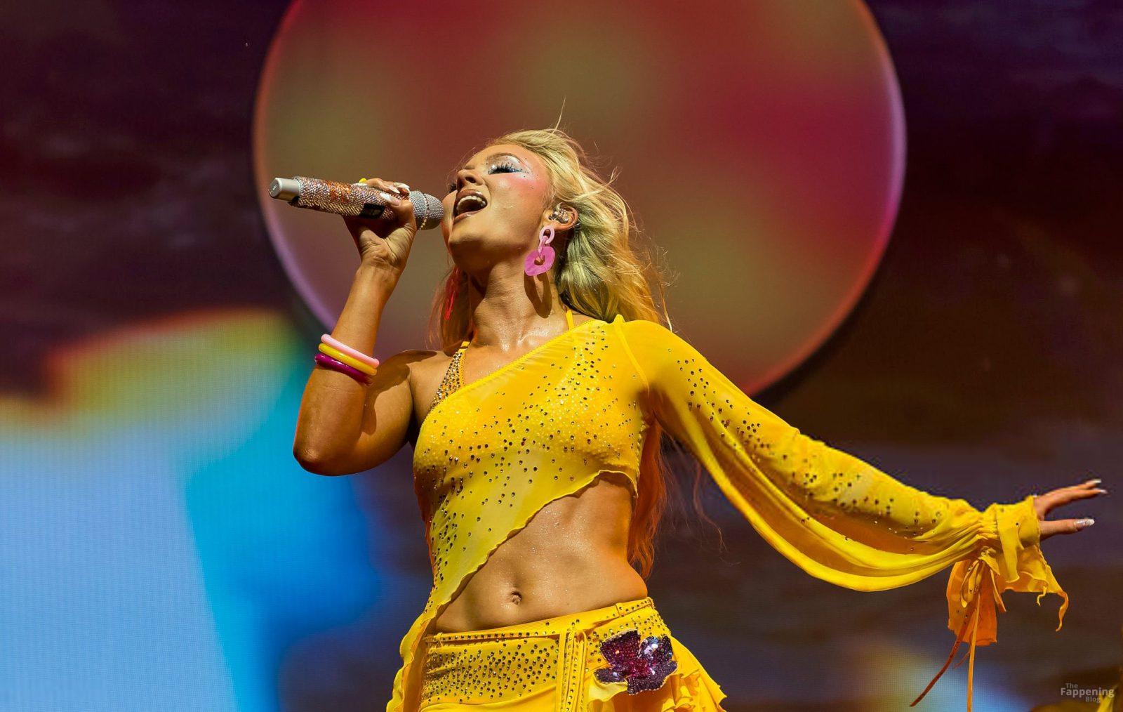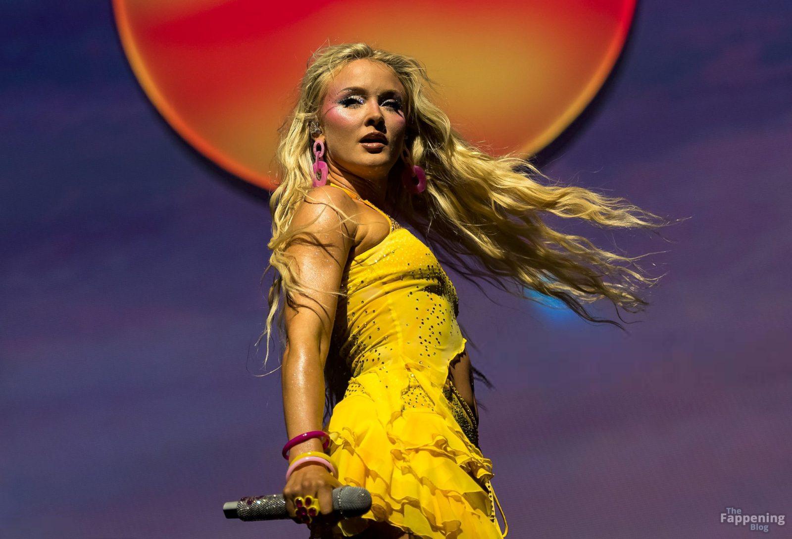 Zara Larsson subió al escenario del OVO Arena Wembley con un top corto amarillo transparente y una minifalda que mostraban sus abdominales y piernas.