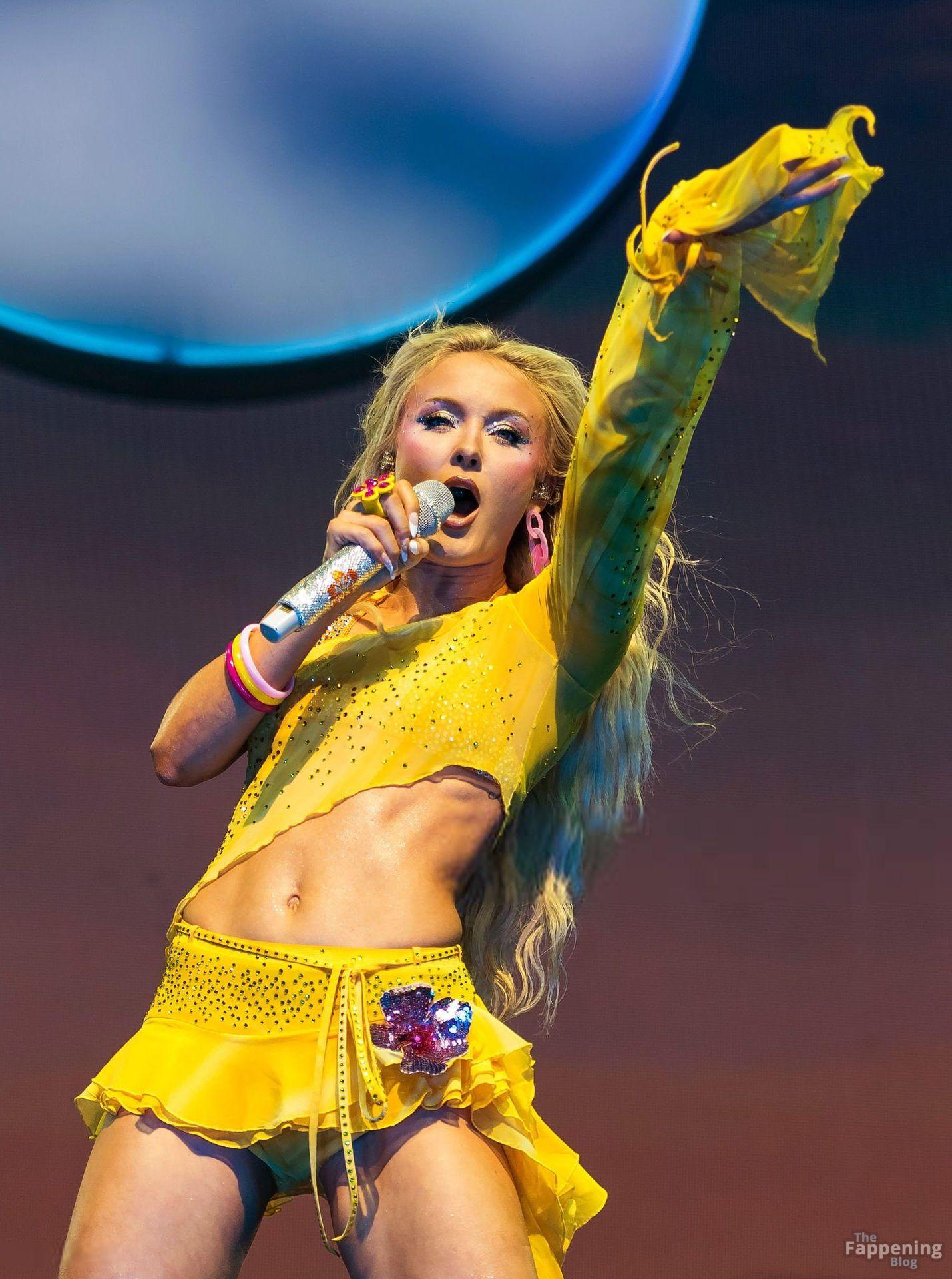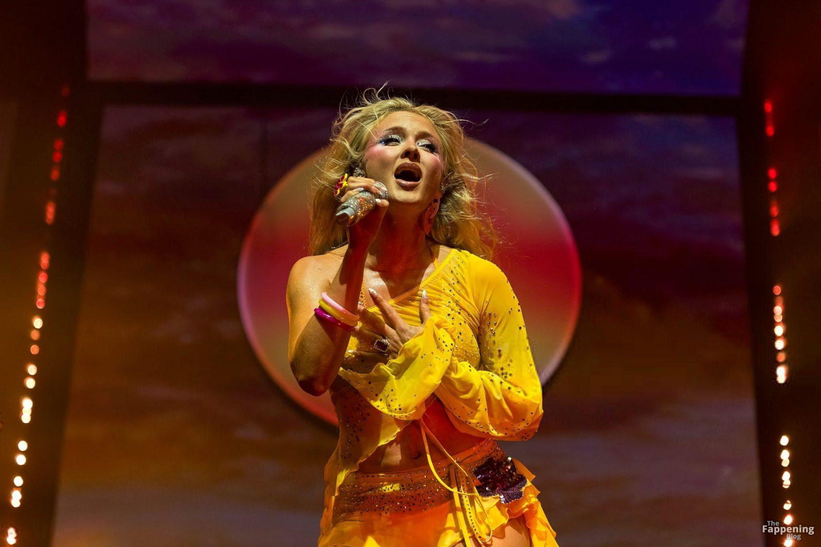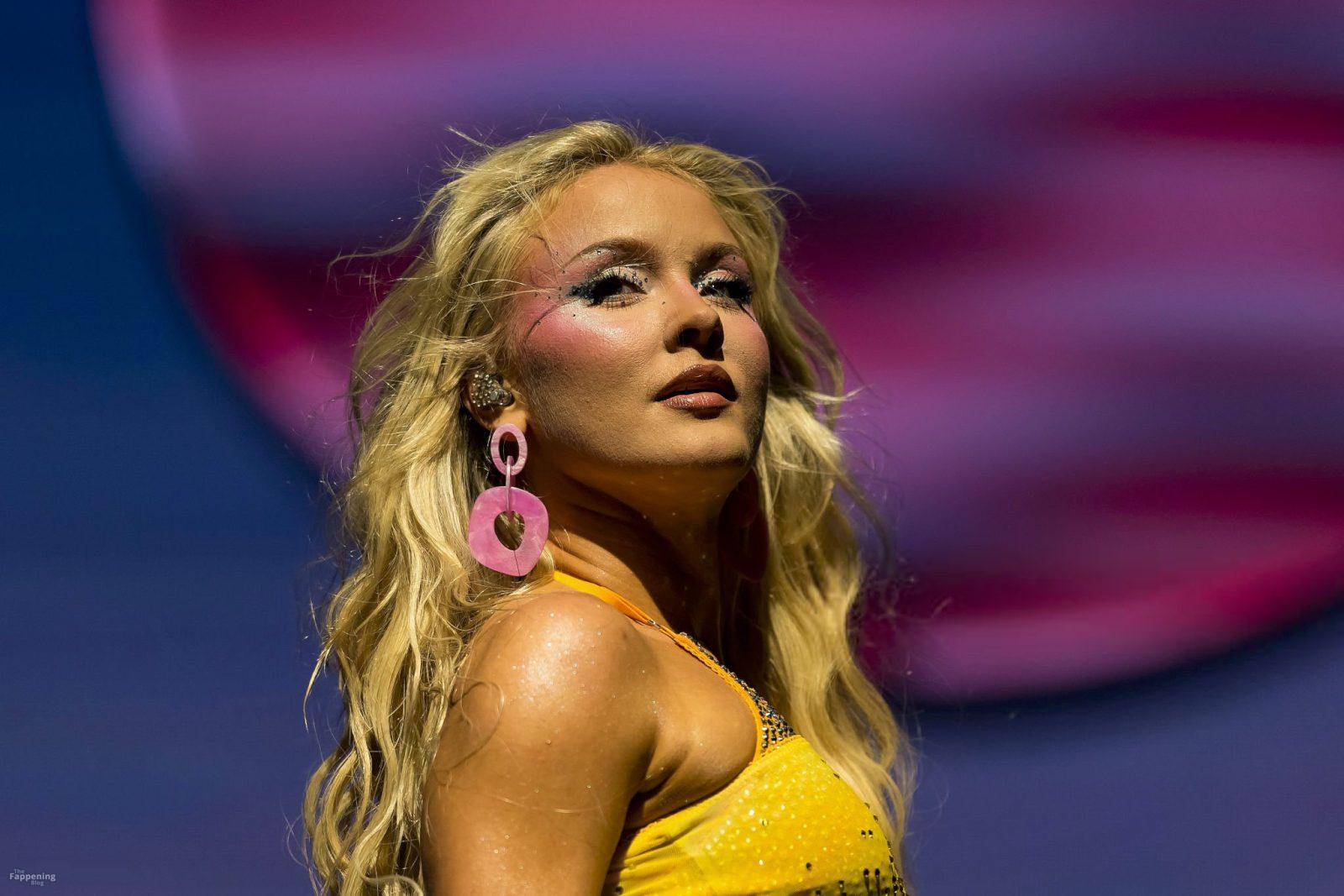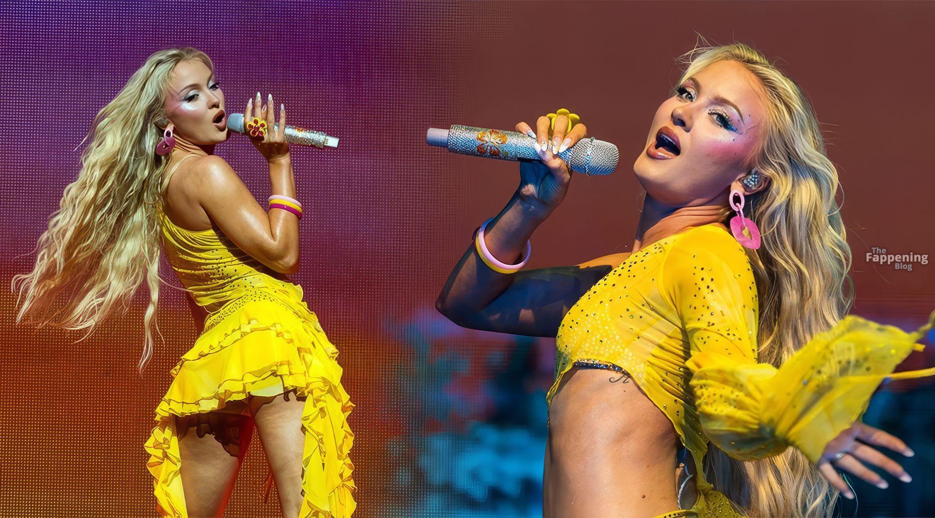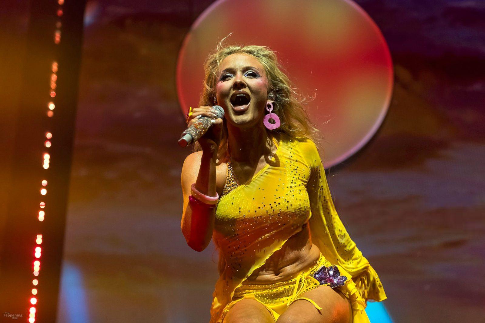 Zara Larsson subió al escenario del OVO Arena Wembley con un top corto amarillo transparente y una minifalda que mostraban sus abdominales y piernas.
