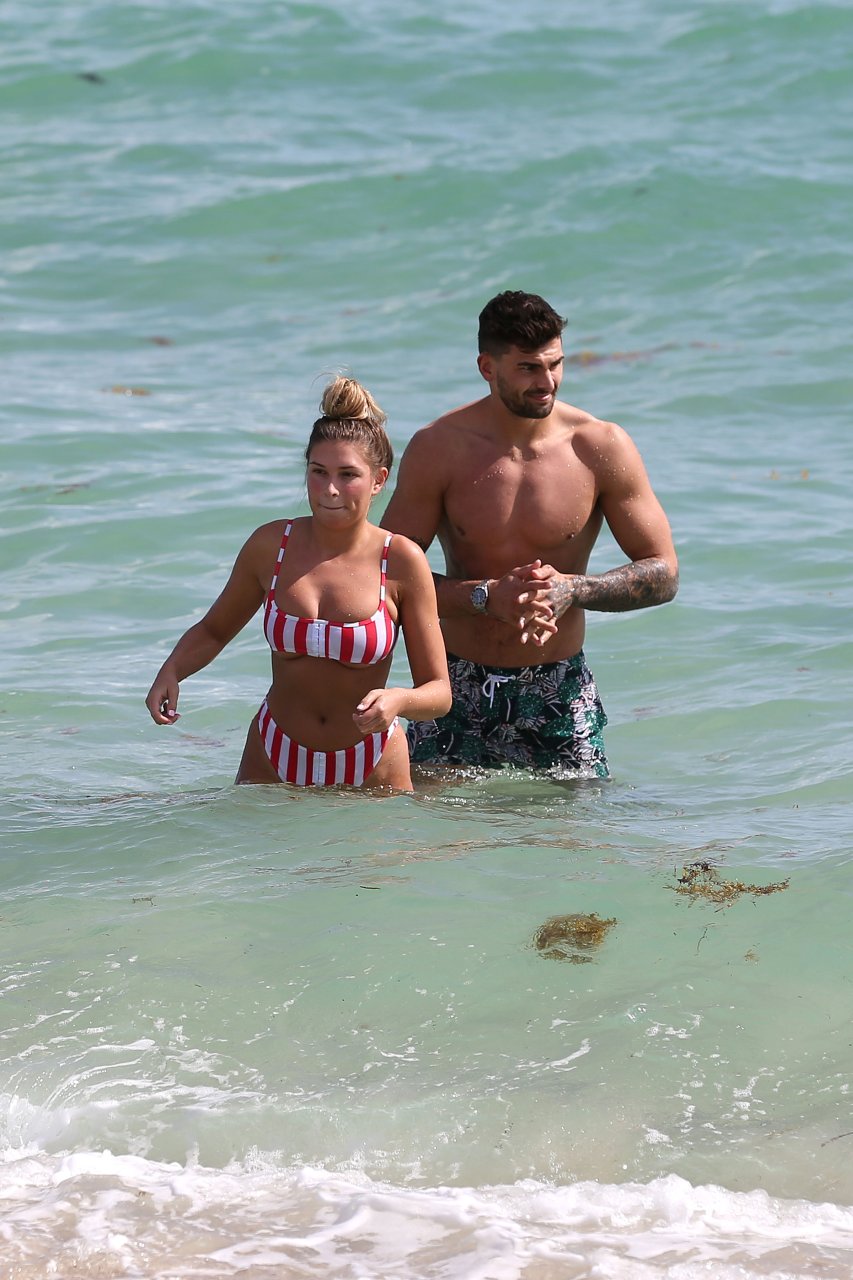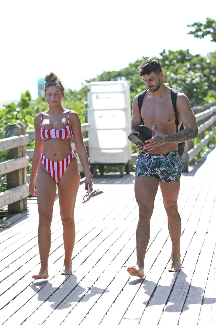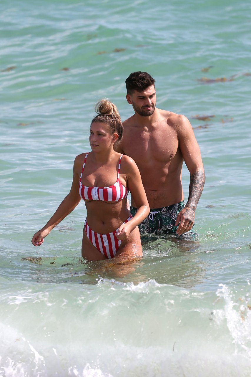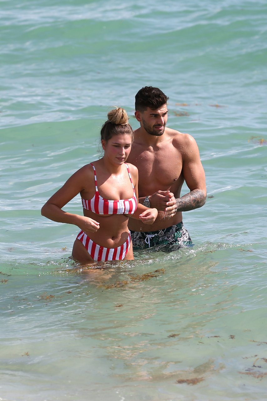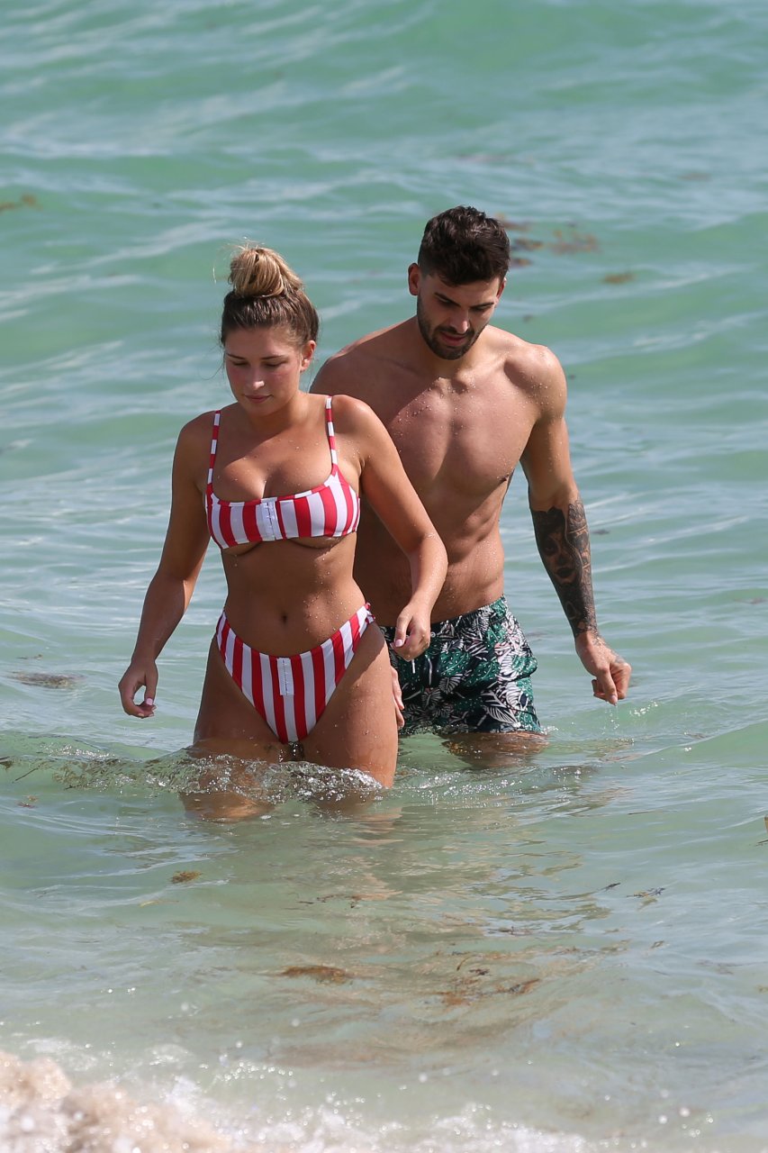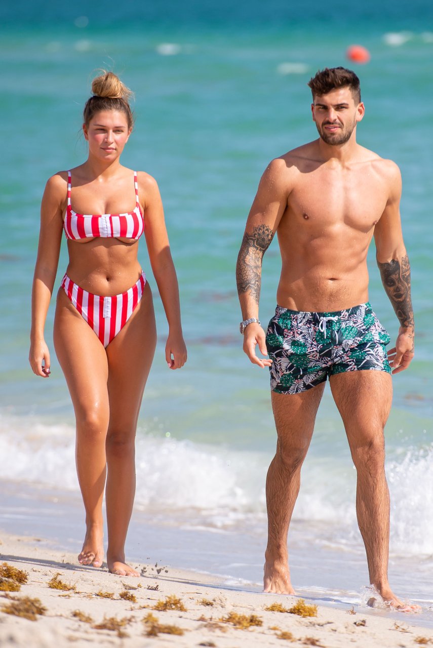 Zara sorprendió a Adam con un viaje de cumpleaños a Miami y las Bahamas y hoy fue su primera mañana bajo el sol. La pareja de reality show que se conoció en el programa de éxito, parecía tan enamorada como siempre mientras mostraban su afecto público mientras se daban un chapuzón en el océano. Zara mostró un pronunciado underboob con un bikini muy ajustado a rayas rojas y blancas.