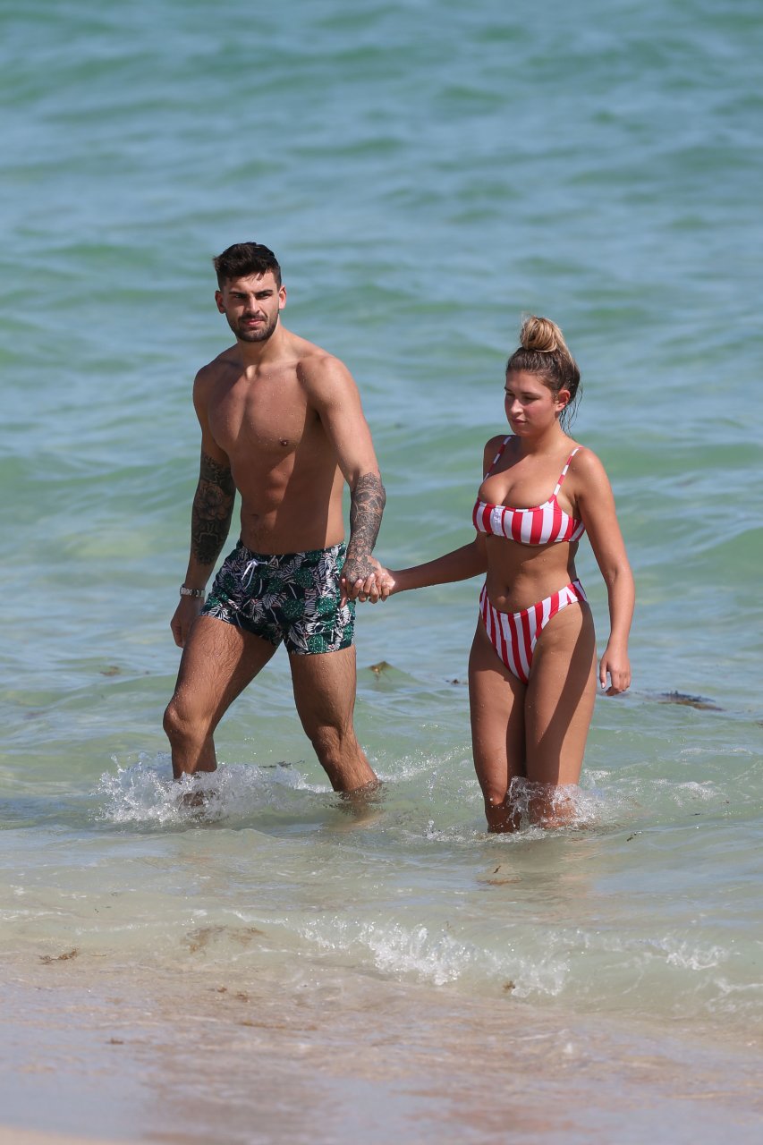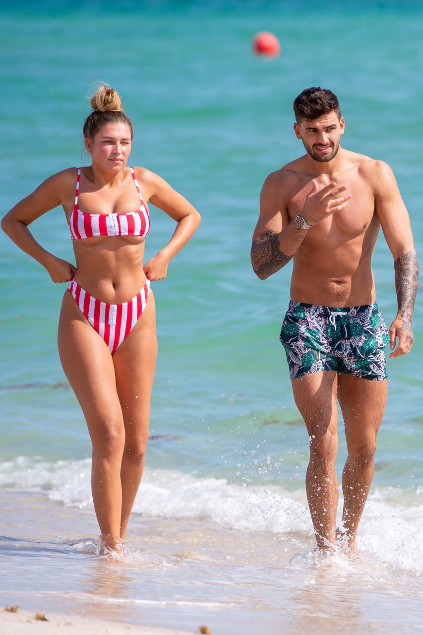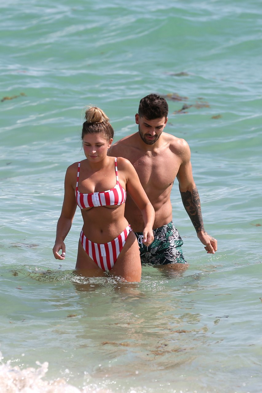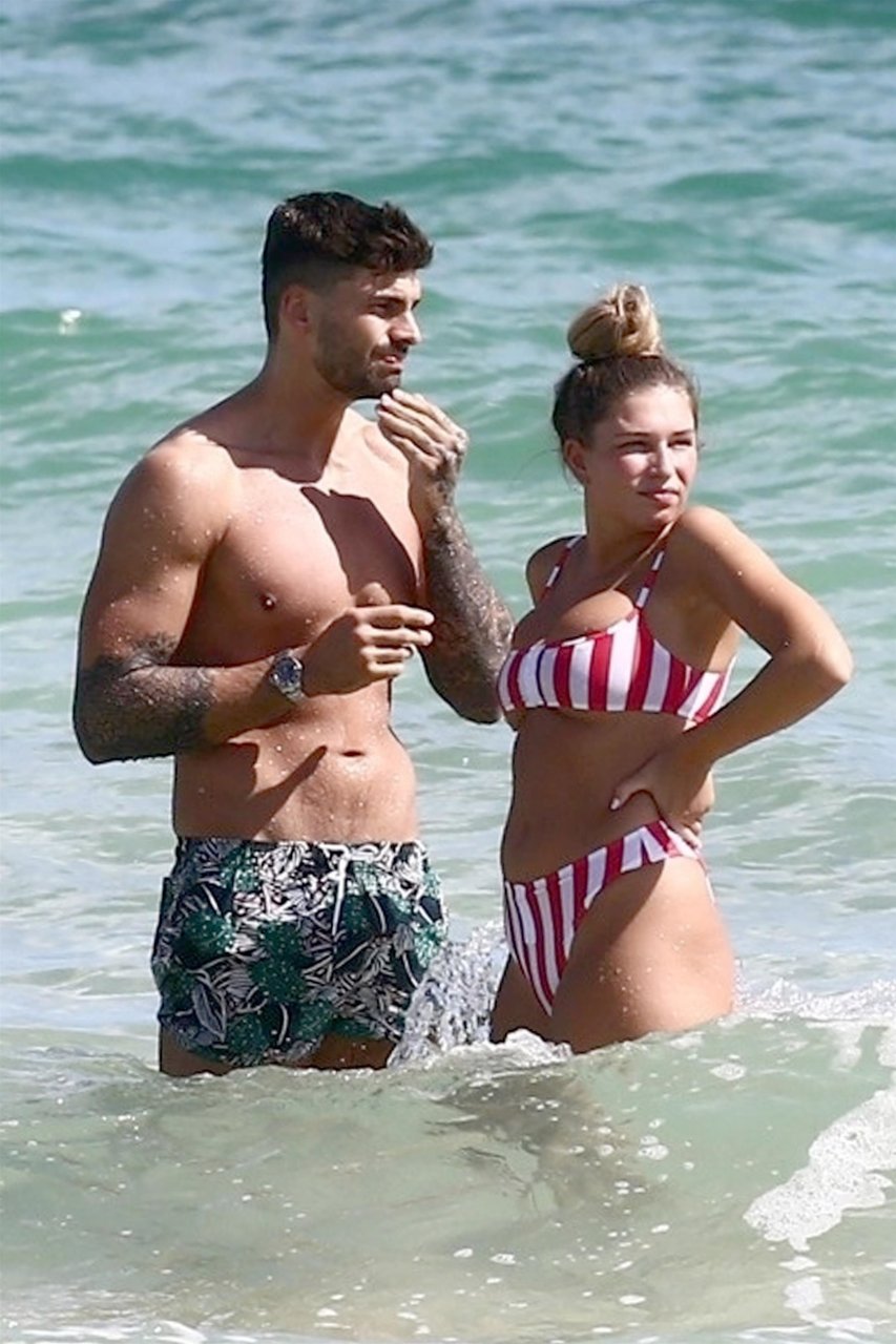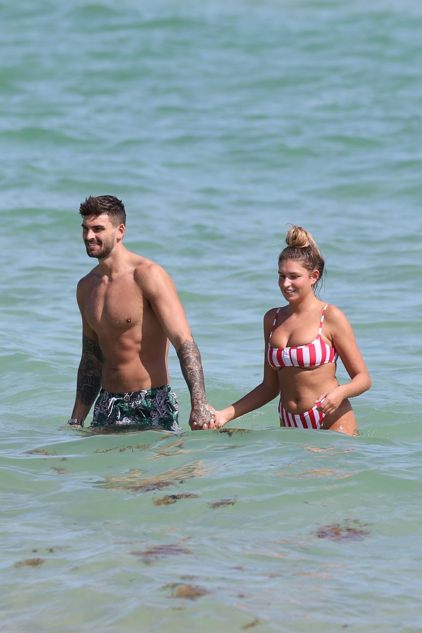 Zara sorprendió a Adam con un viaje de cumpleaños a Miami y las Bahamas y hoy fue su primera mañana bajo el sol. La pareja de reality show que se conoció en el programa de éxito, parecía tan enamorada como siempre mientras mostraban su afecto público mientras se daban un chapuzón en el océano. Zara mostró un pronunciado underboob con un bikini muy ajustado a rayas rojas y blancas.