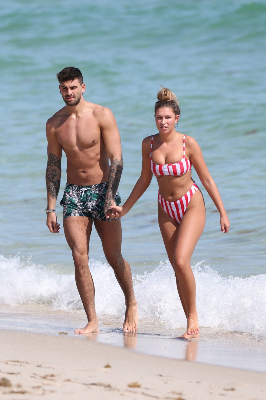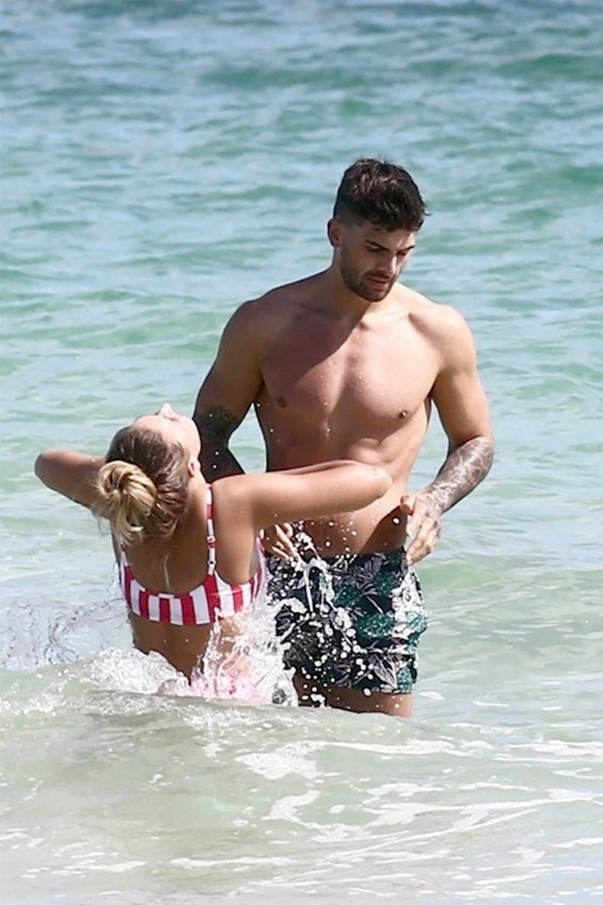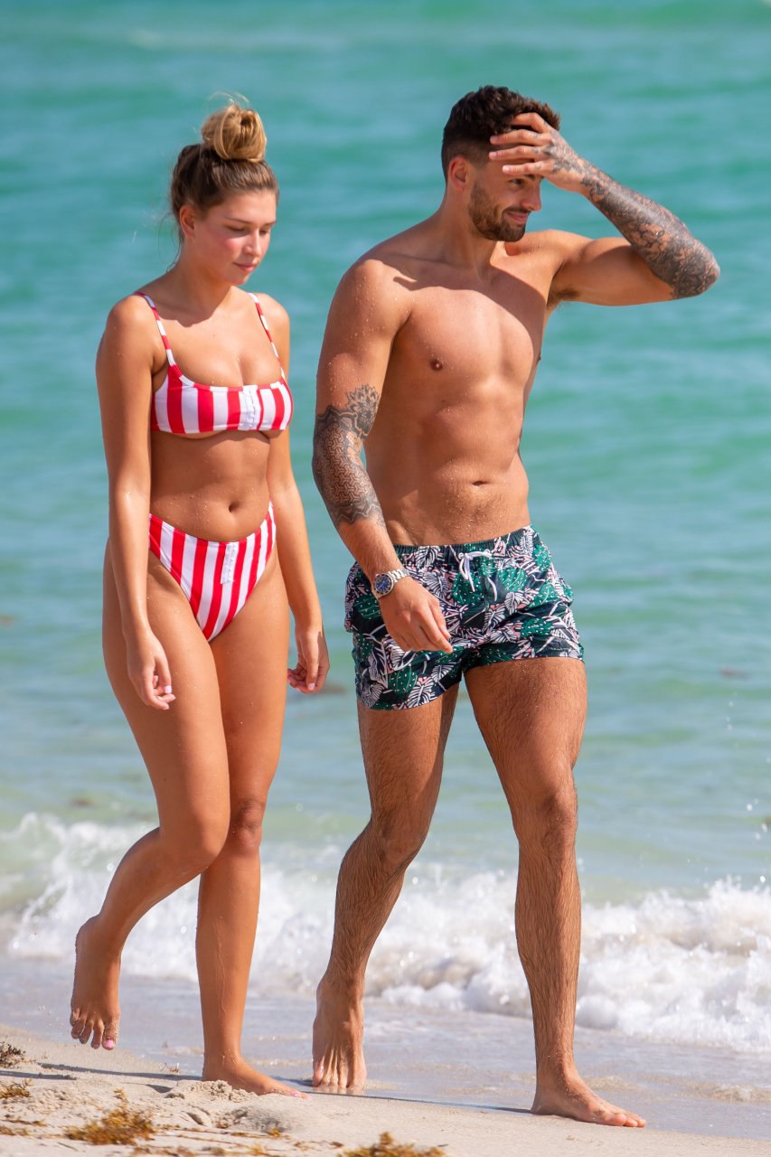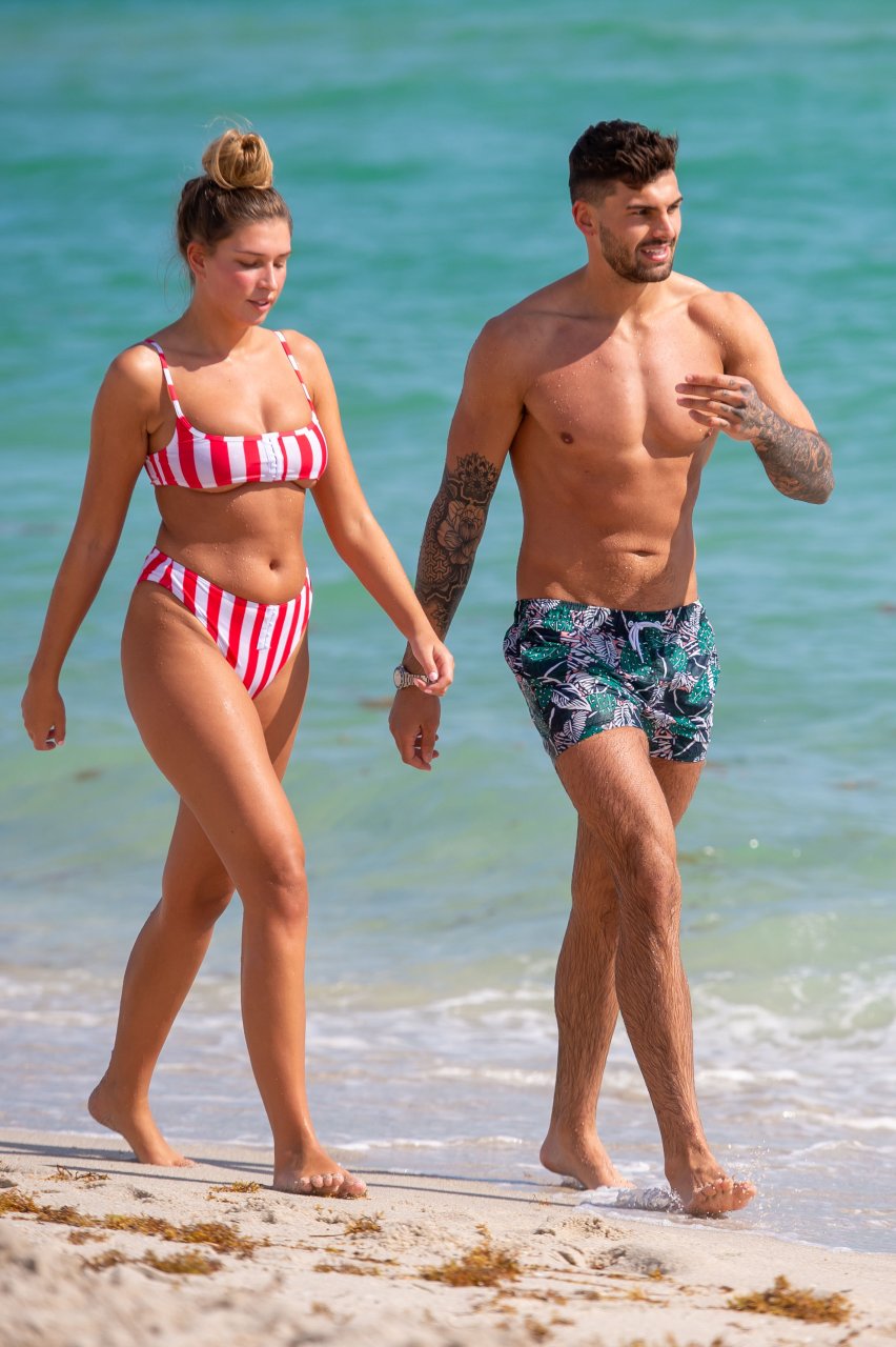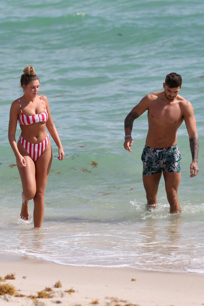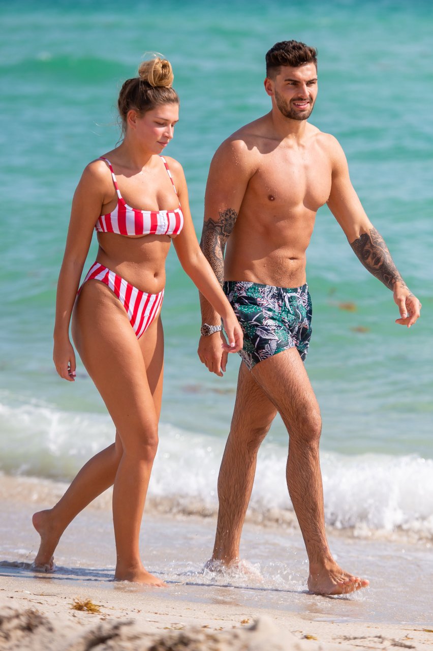Zara sorprendió a Adam con un viaje de cumpleaños a Miami y las Bahamas y hoy fue su primera mañana bajo el sol. La pareja de reality show que se conoció en el programa de éxito, parecía tan enamorada como siempre mientras mostraban su afecto público mientras se daban un chapuzón en el océano. Zara mostró un pronunciado underboob con un bikini muy ajustado a rayas rojas y blancas.