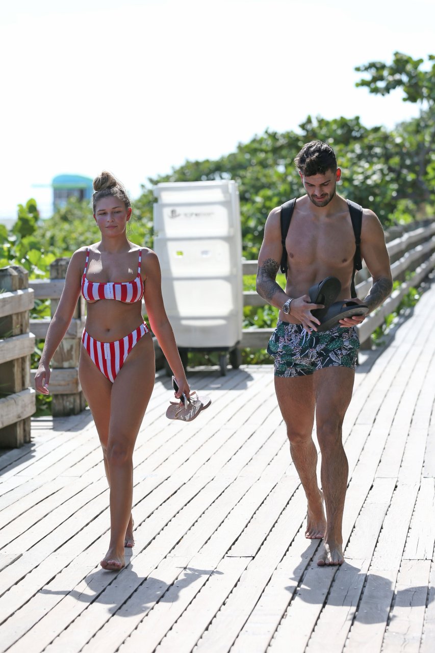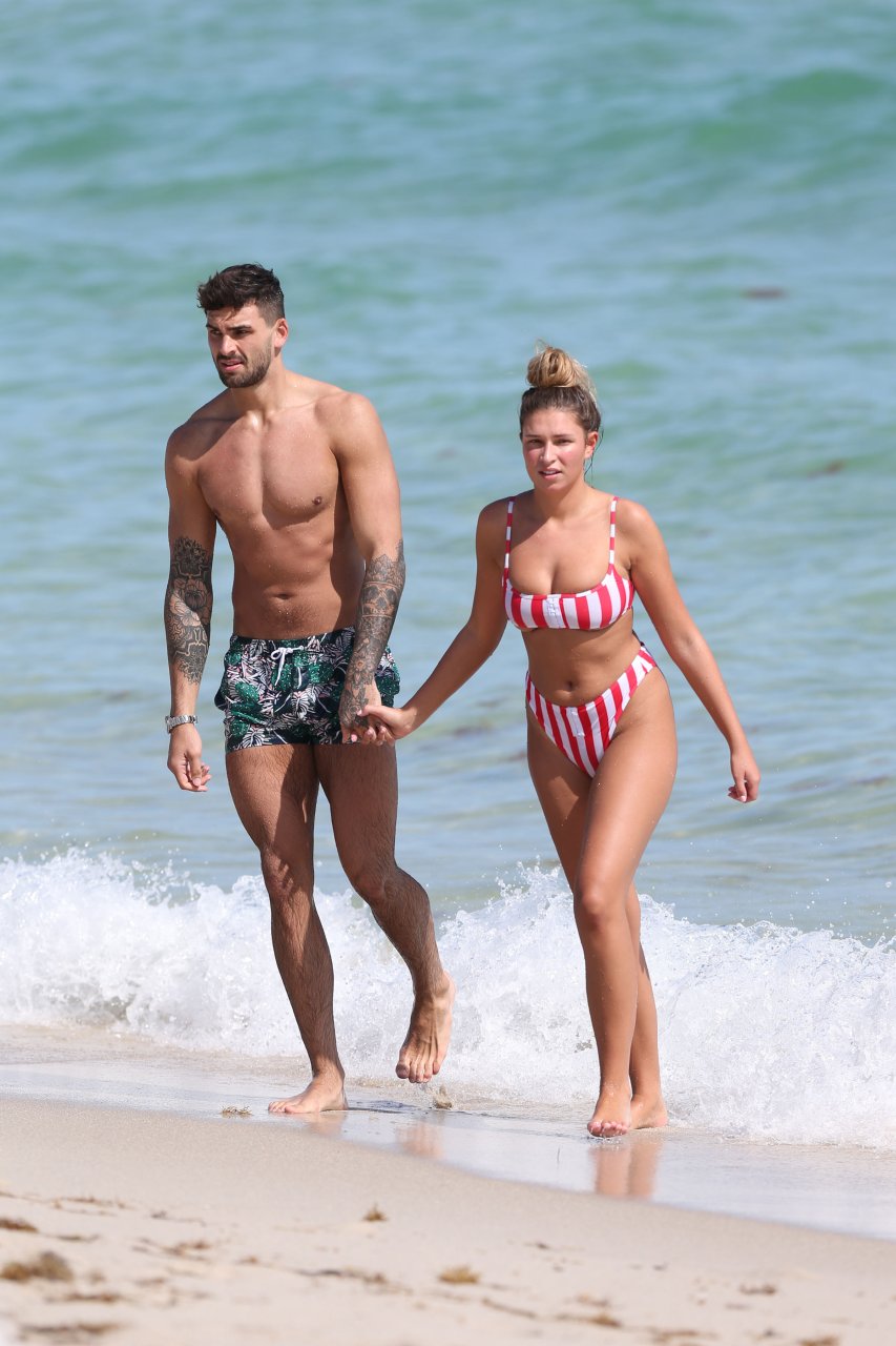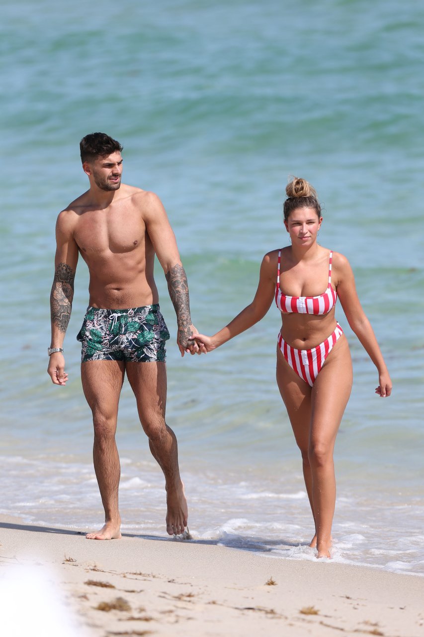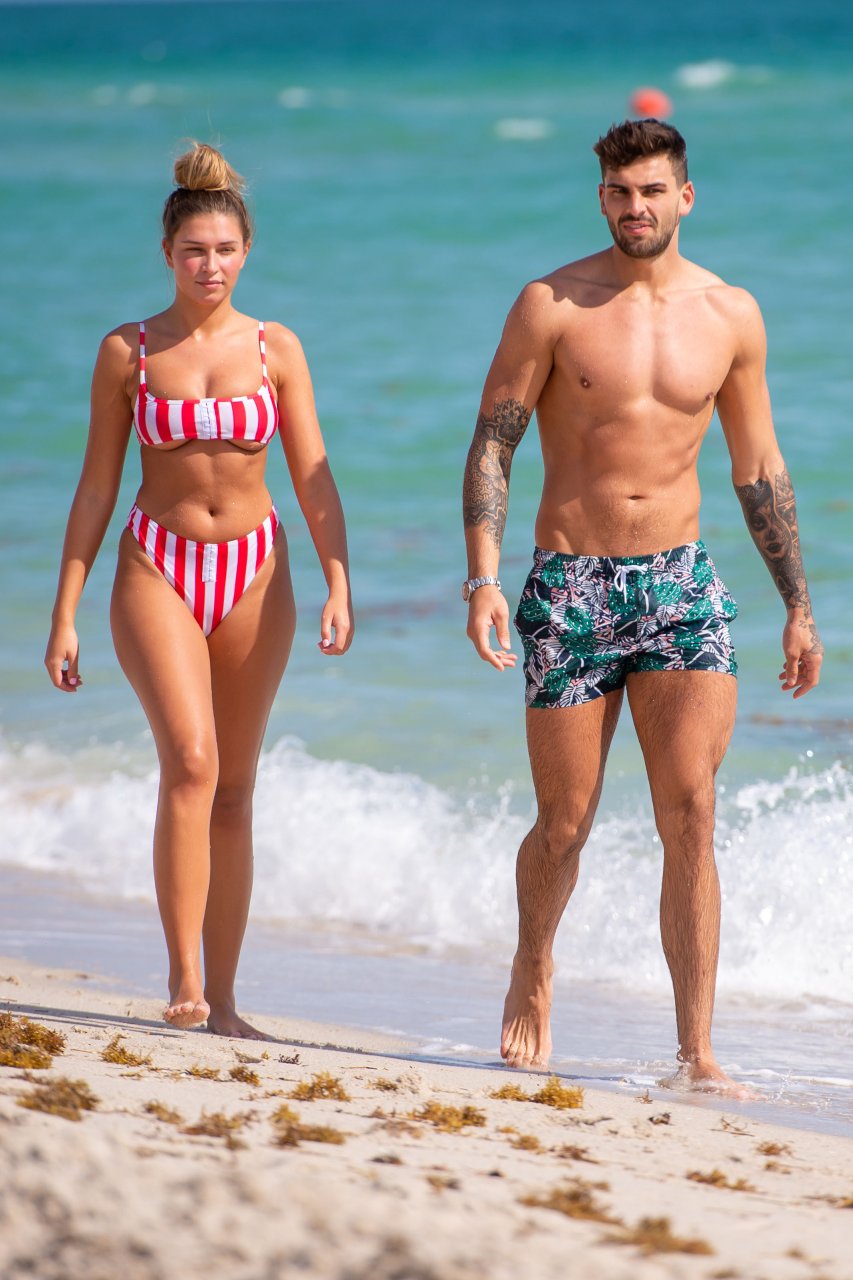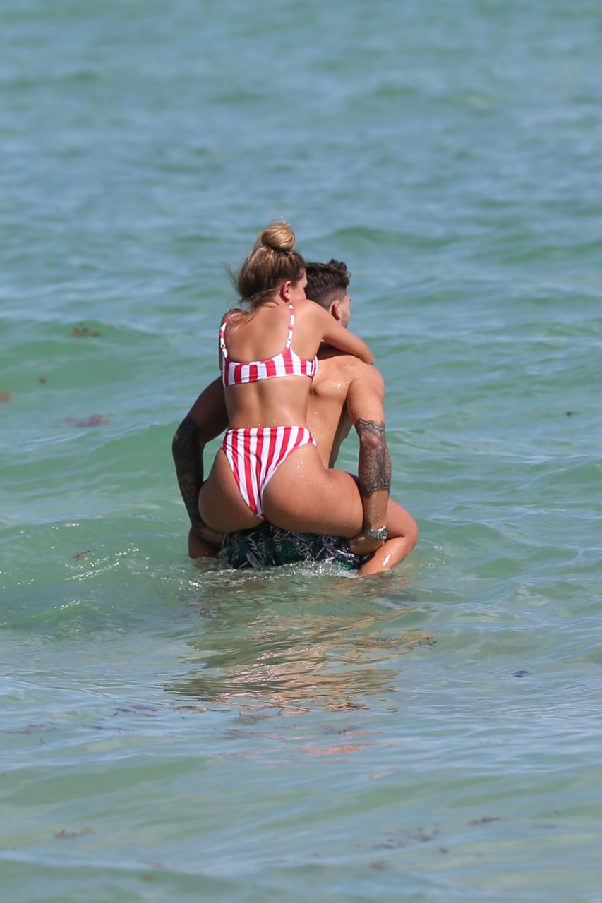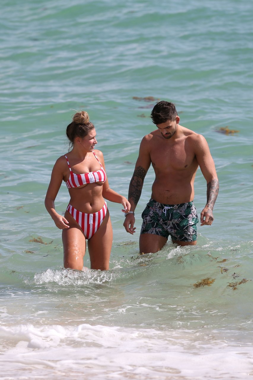 Zara sorprendió a Adam con un viaje de cumpleaños a Miami y las Bahamas y hoy fue su primera mañana bajo el sol. La pareja de reality show que se conoció en el programa de éxito, parecía tan enamorada como siempre mientras mostraban su afecto público mientras se daban un chapuzón en el océano. Zara mostró un pronunciado underboob con un bikini muy ajustado a rayas rojas y blancas.