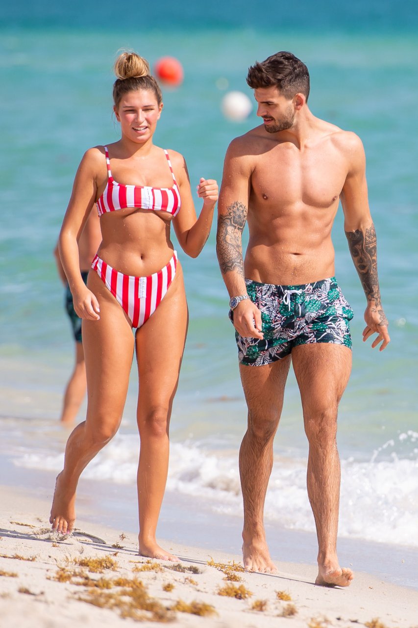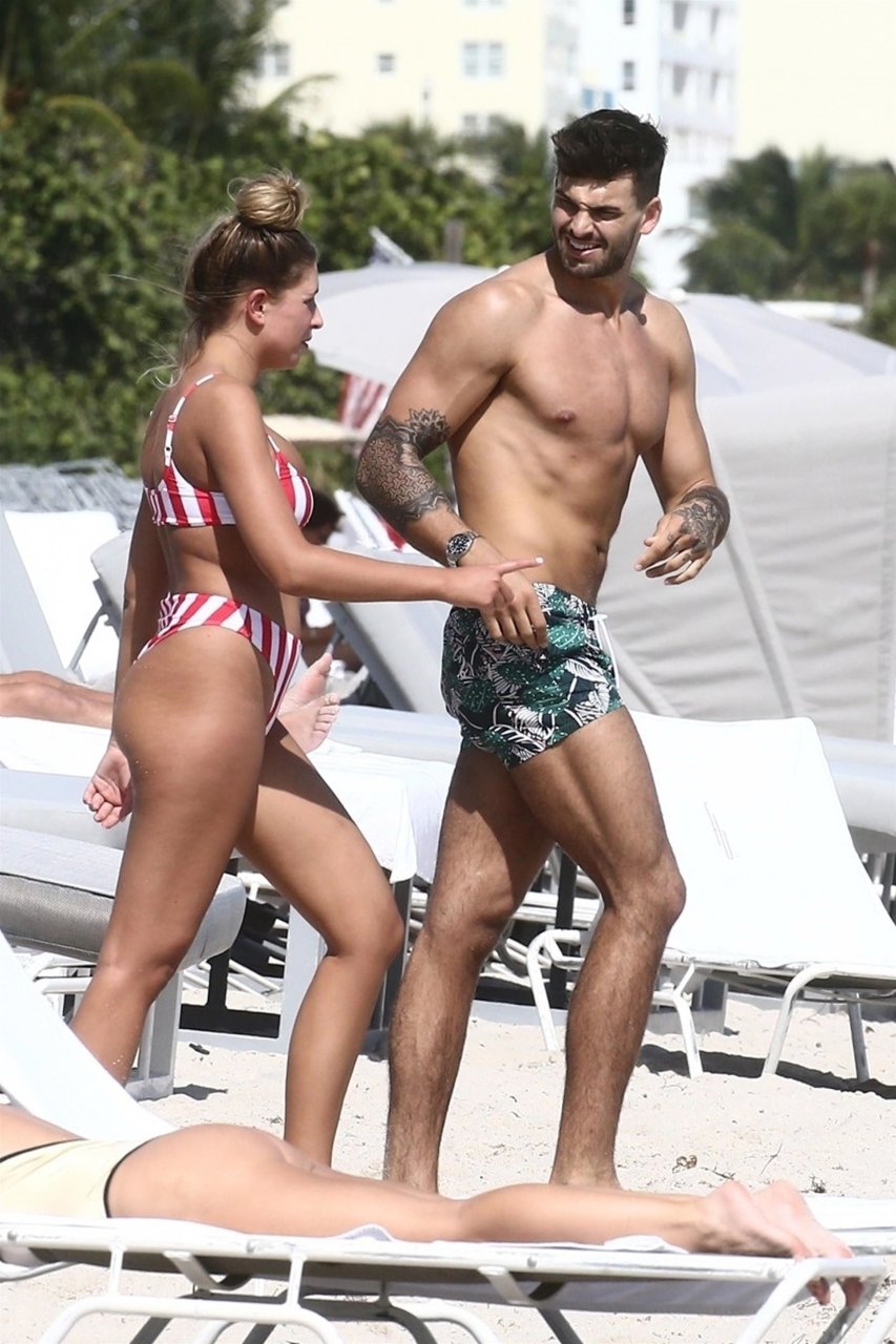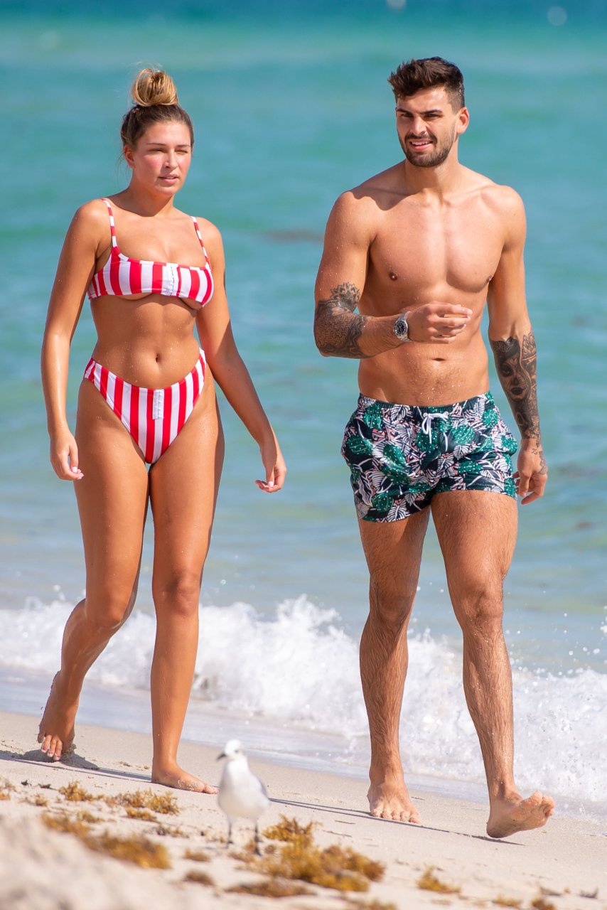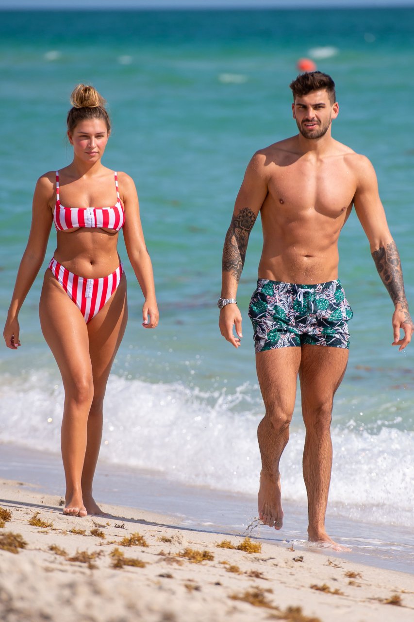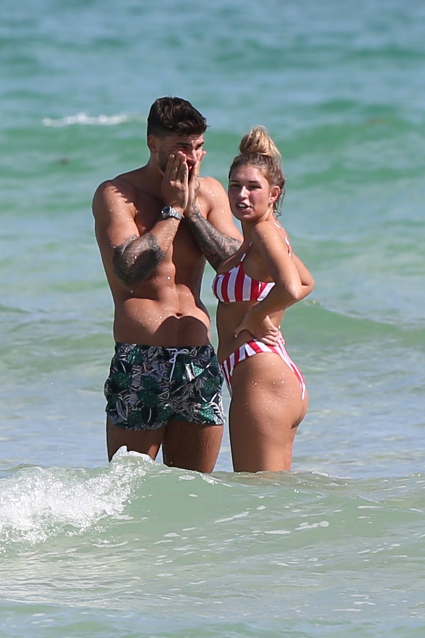 Zara sorprendió a Adam con un viaje de cumpleaños a Miami y las Bahamas y hoy fue su primera mañana bajo el sol. La pareja de reality show que se conoció en el programa de éxito, parecía tan enamorada como siempre mientras mostraban su afecto público mientras se daban un chapuzón en el océano. Zara mostró un pronunciado underboob con un bikini muy ajustado a rayas rojas y blancas.