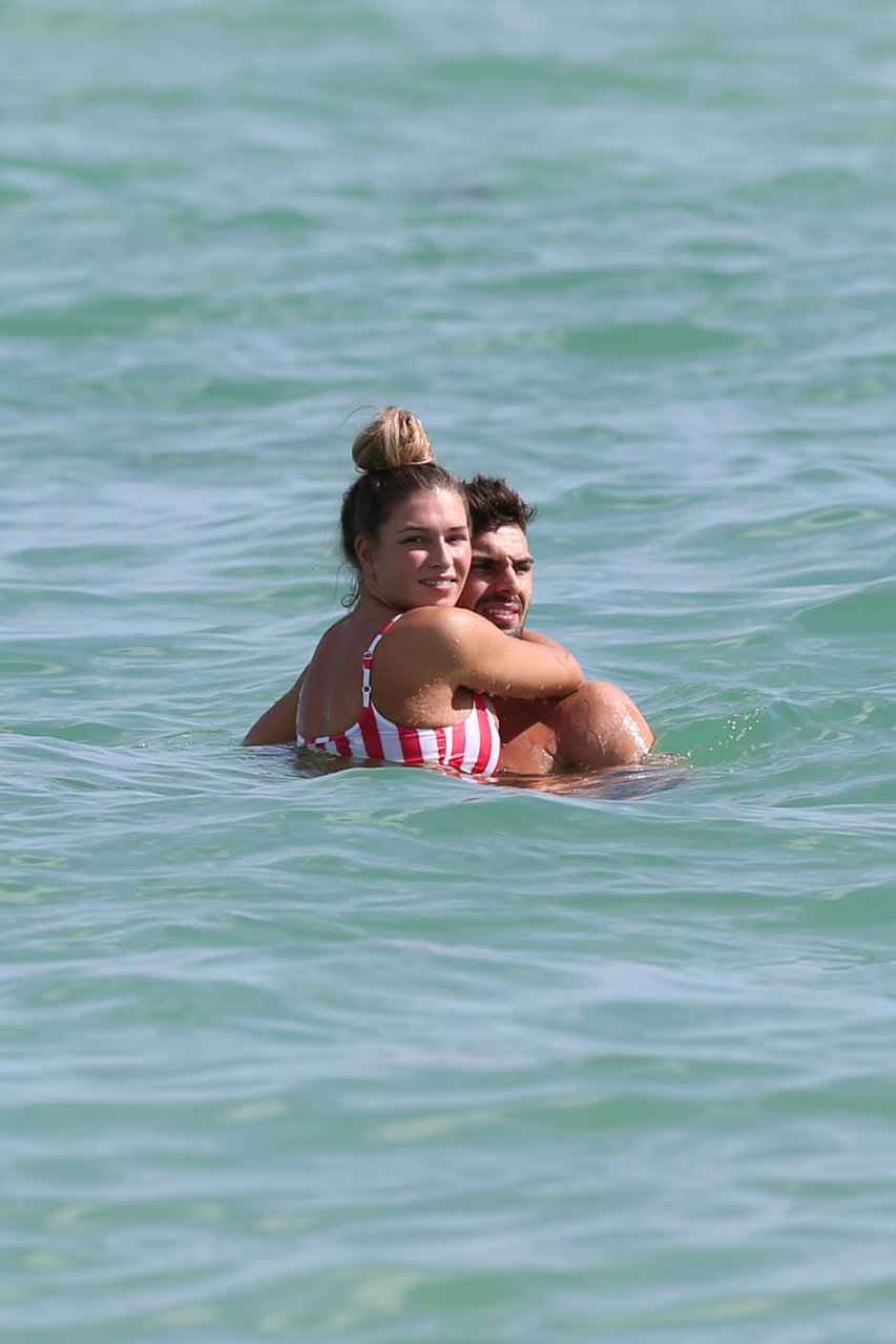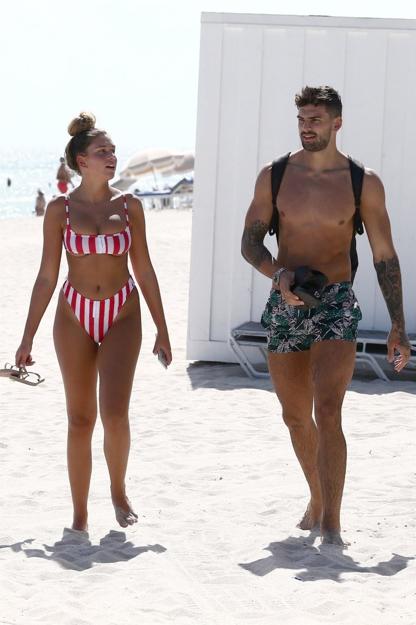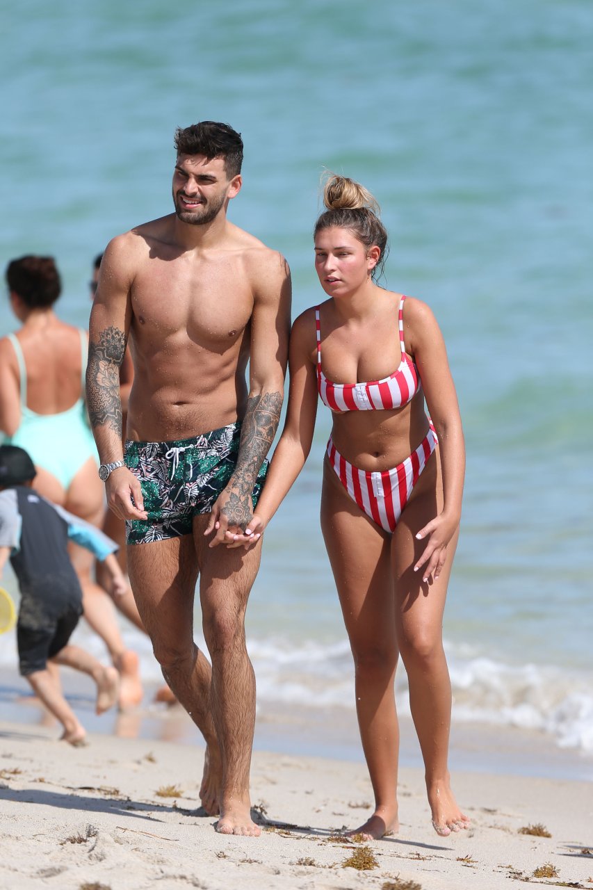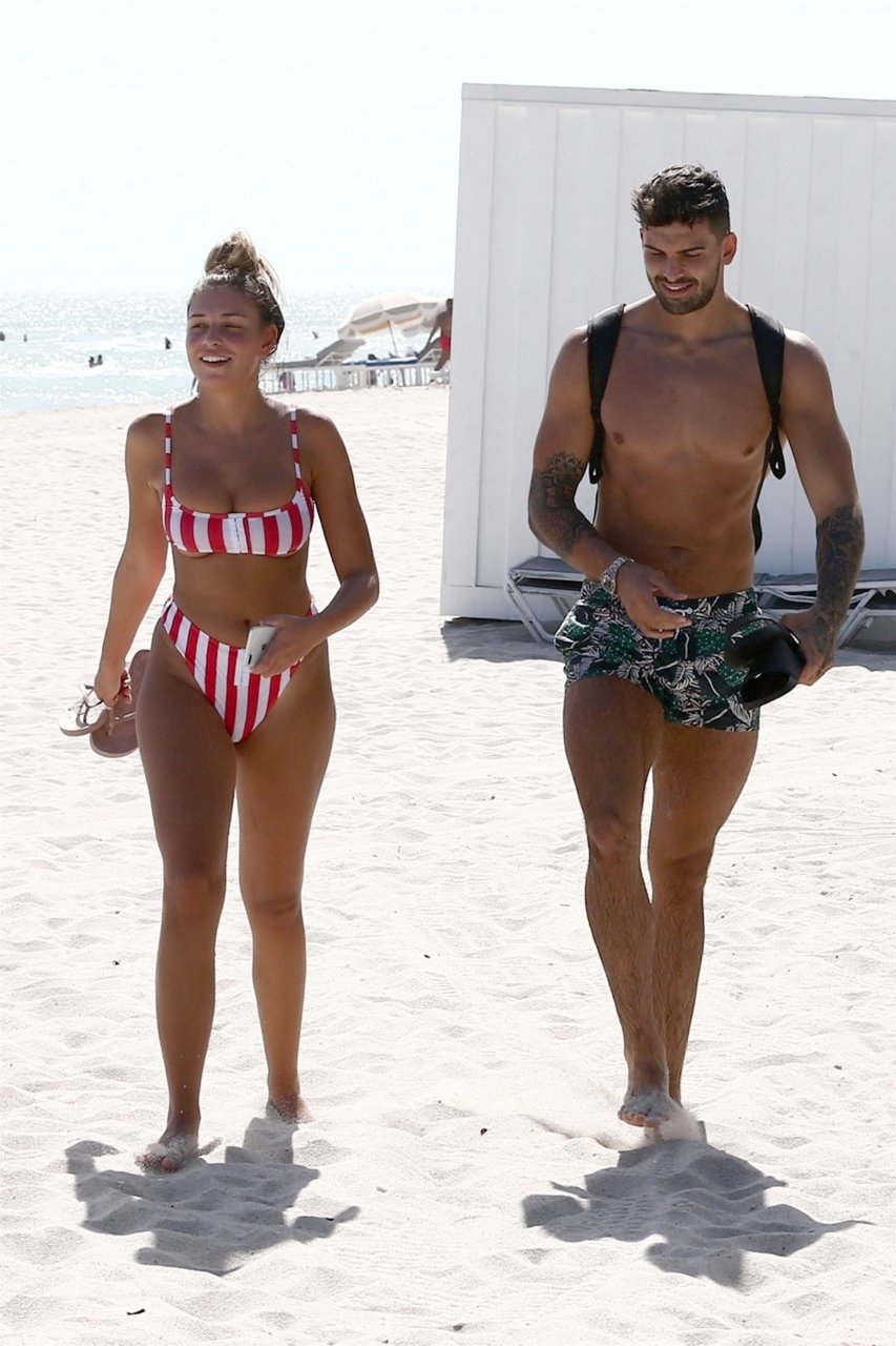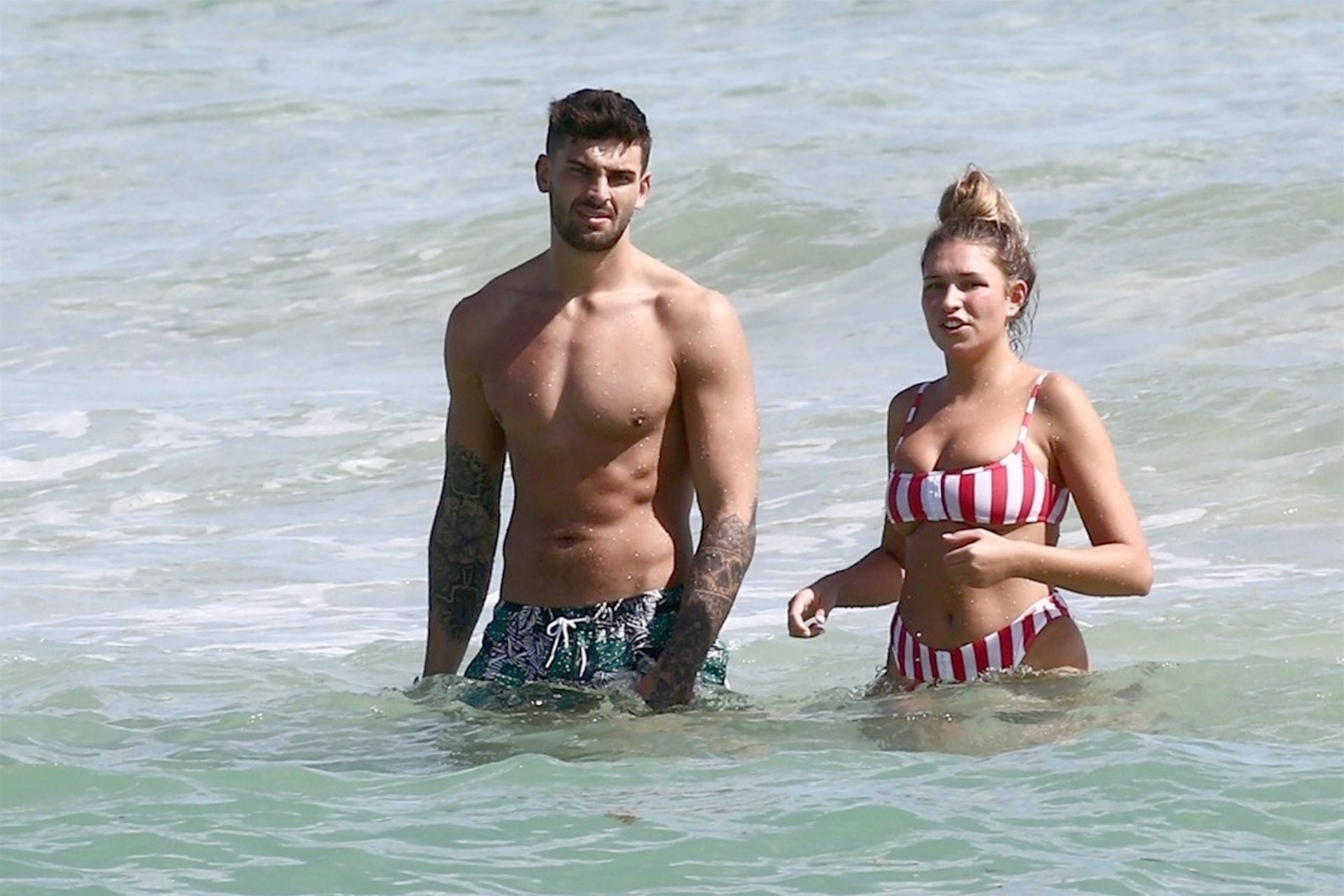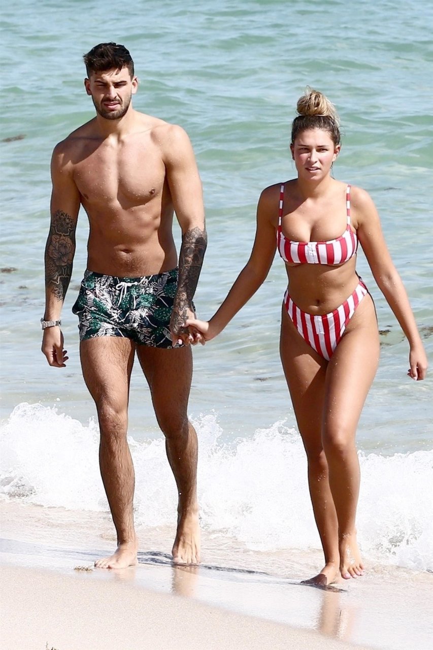 Zara sorprendió a Adam con un viaje de cumpleaños a Miami y las Bahamas y hoy fue su primera mañana bajo el sol. La pareja de reality show que se conoció en el programa de éxito, parecía tan enamorada como siempre mientras mostraban su afecto público mientras se daban un chapuzón en el océano. Zara mostró un pronunciado underboob con un bikini muy ajustado a rayas rojas y blancas.