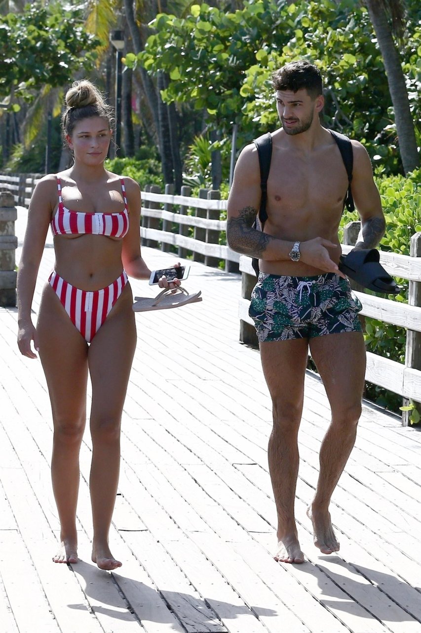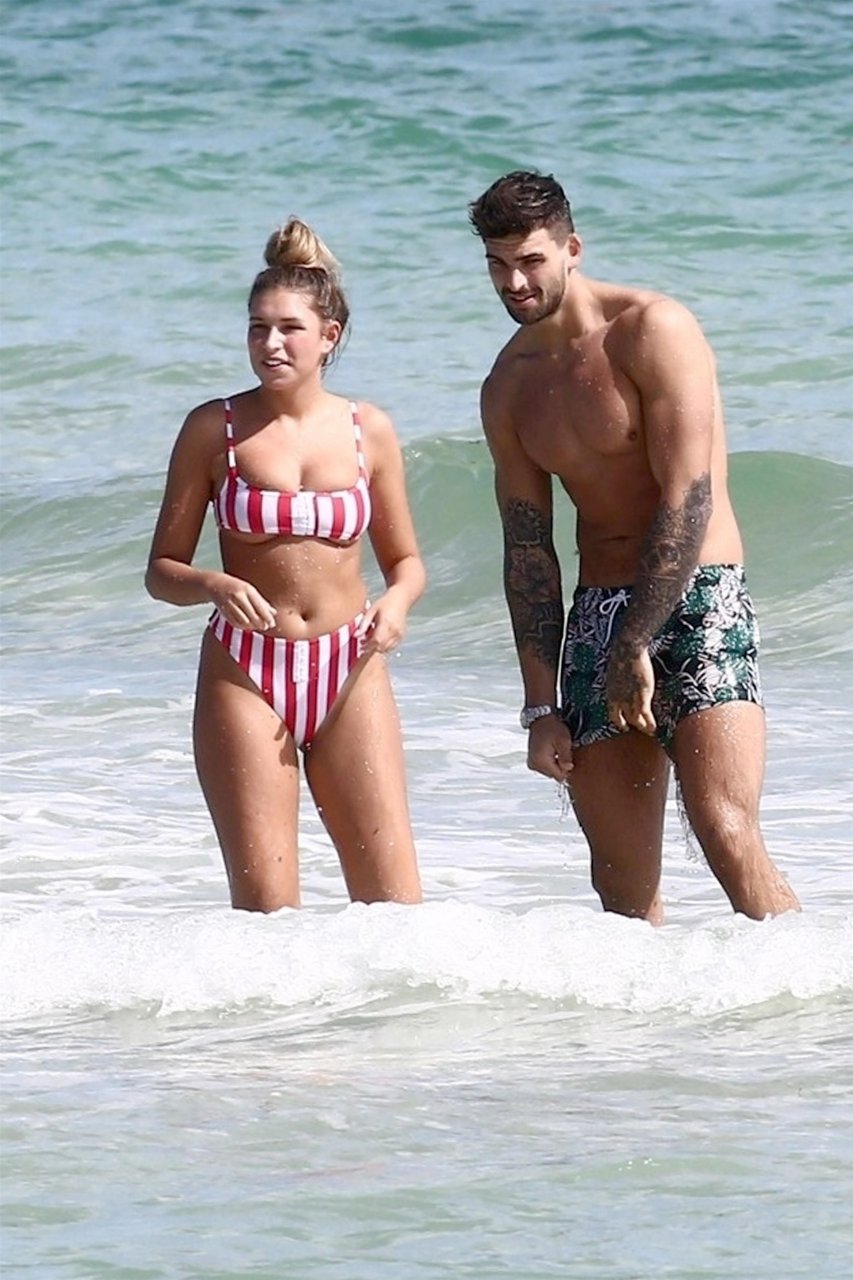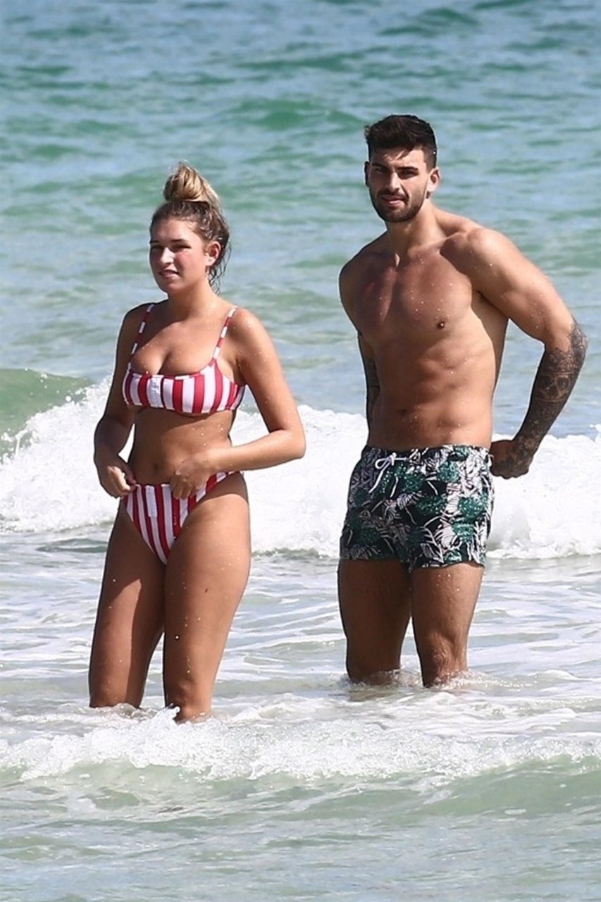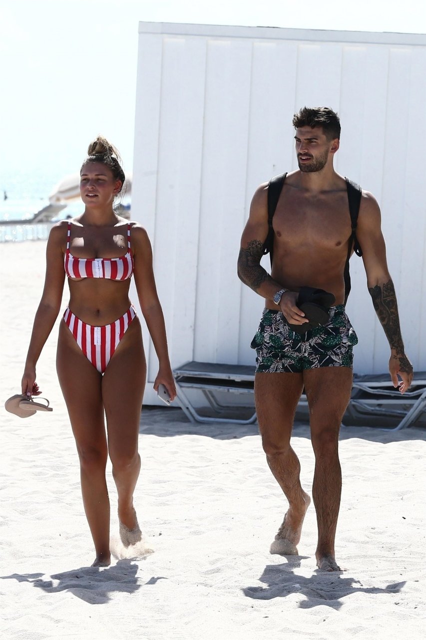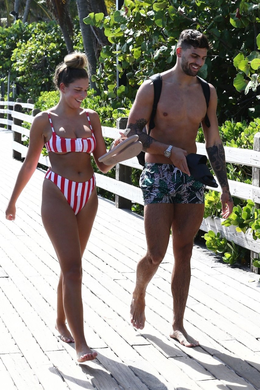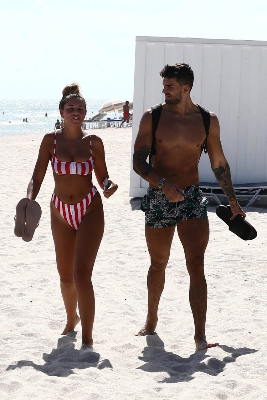Zara sorprendió a Adam con un viaje de cumpleaños a Miami y las Bahamas y hoy fue su primera mañana bajo el sol. La pareja de reality show que se conoció en el programa de éxito, parecía tan enamorada como siempre mientras mostraban su afecto público mientras se daban un chapuzón en el océano. Zara mostró un pronunciado underboob con un bikini muy ajustado a rayas rojas y blancas.