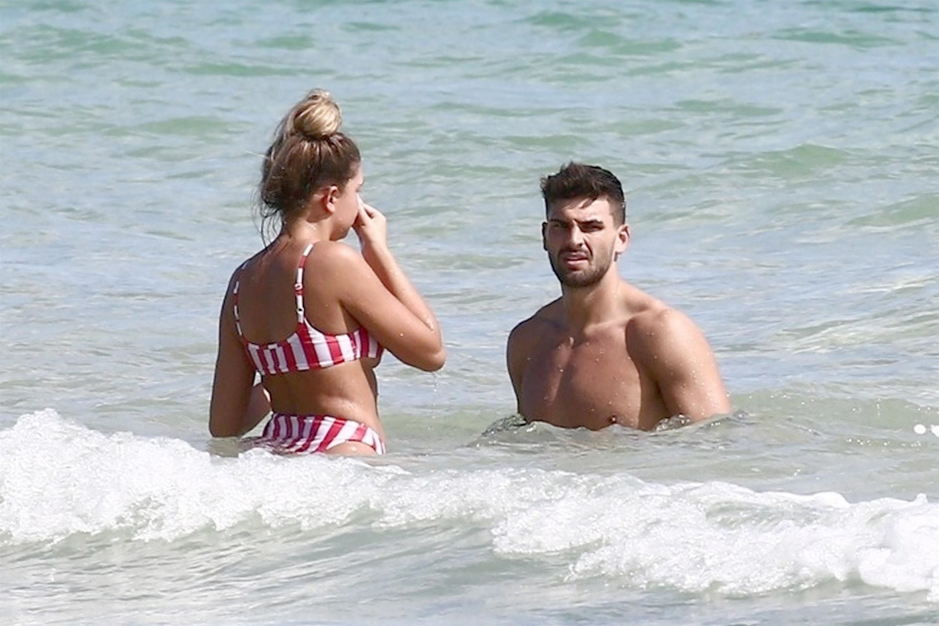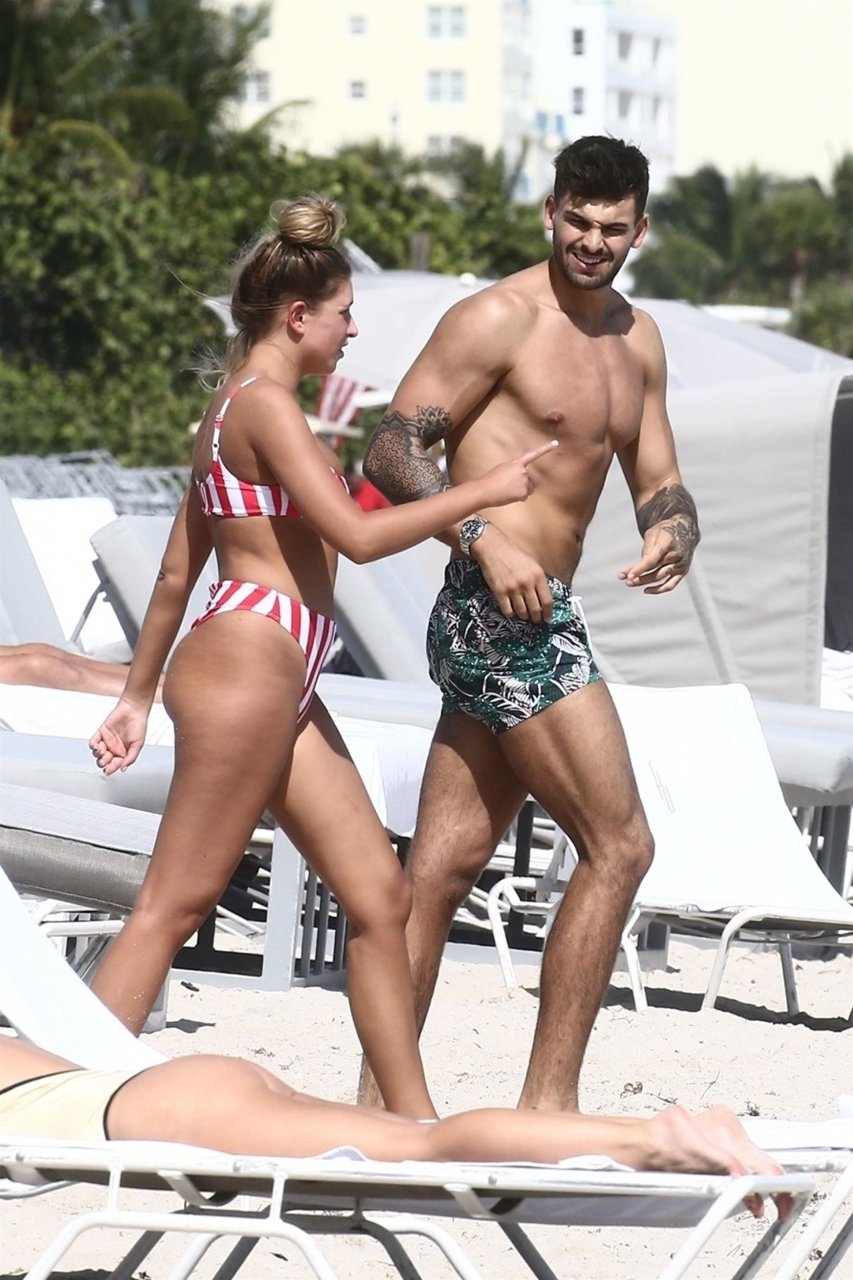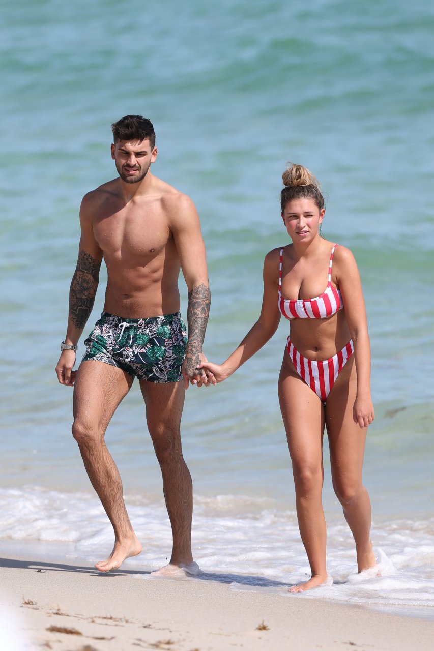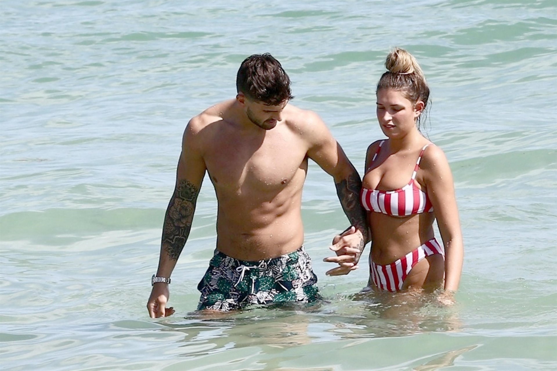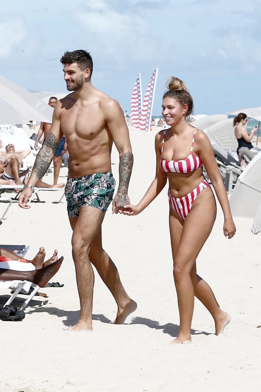 Zara sorprendió a Adam con un viaje de cumpleaños a Miami y las Bahamas y hoy fue su primera mañana bajo el sol. La pareja de reality show que se conoció en el programa de éxito, parecía tan enamorada como siempre mientras mostraban su afecto público mientras se daban un chapuzón en el océano. Zara mostró un pronunciado underboob con un bikini muy ajustado a rayas rojas y blancas.