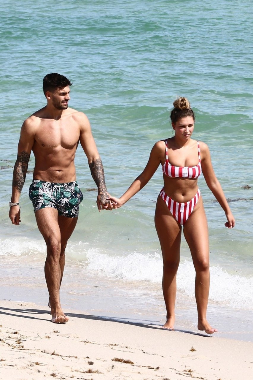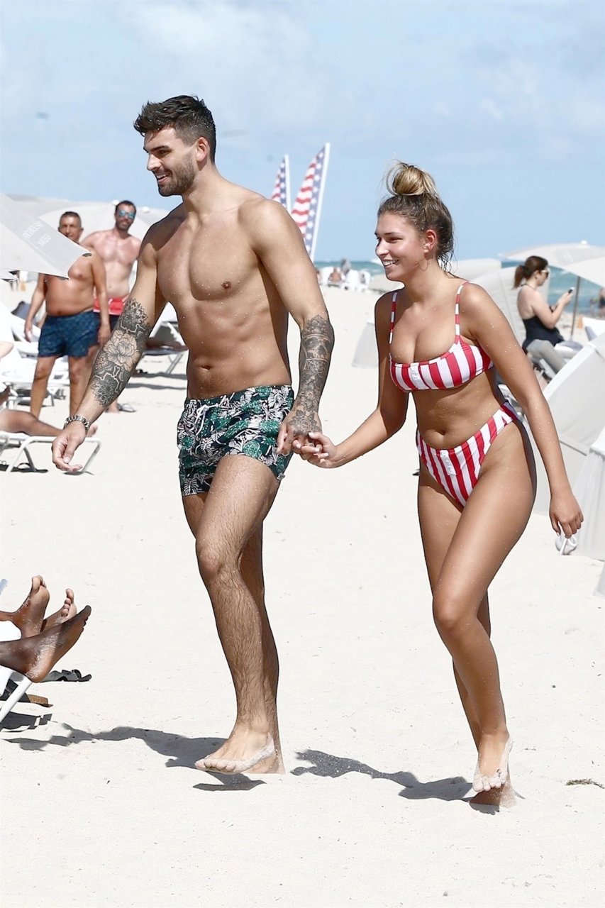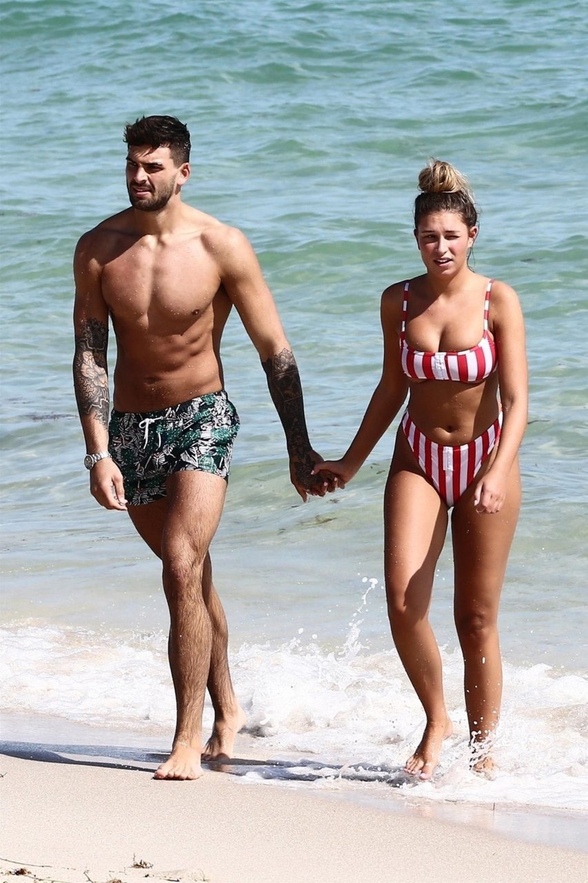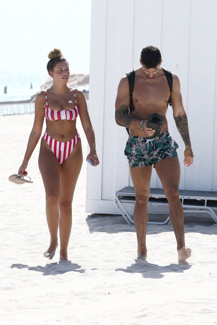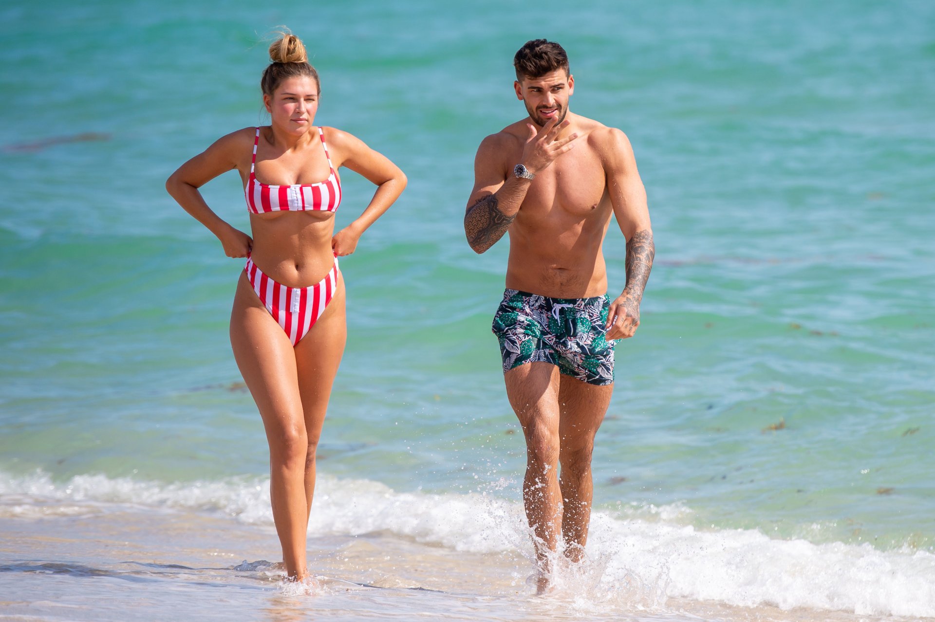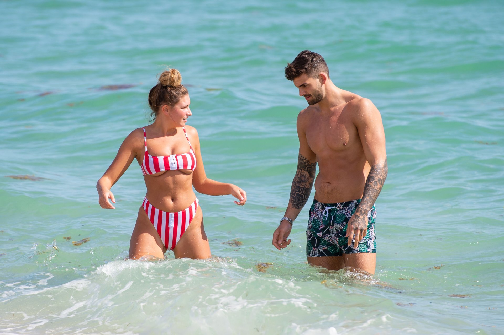 Zara sorprendió a Adam con un viaje de cumpleaños a Miami y las Bahamas y hoy fue su primera mañana bajo el sol. La pareja de reality show que se conoció en el programa de éxito, parecía tan enamorada como siempre mientras mostraban su afecto público mientras se daban un chapuzón en el océano. Zara mostró un pronunciado underboob con un bikini muy ajustado a rayas rojas y blancas.
