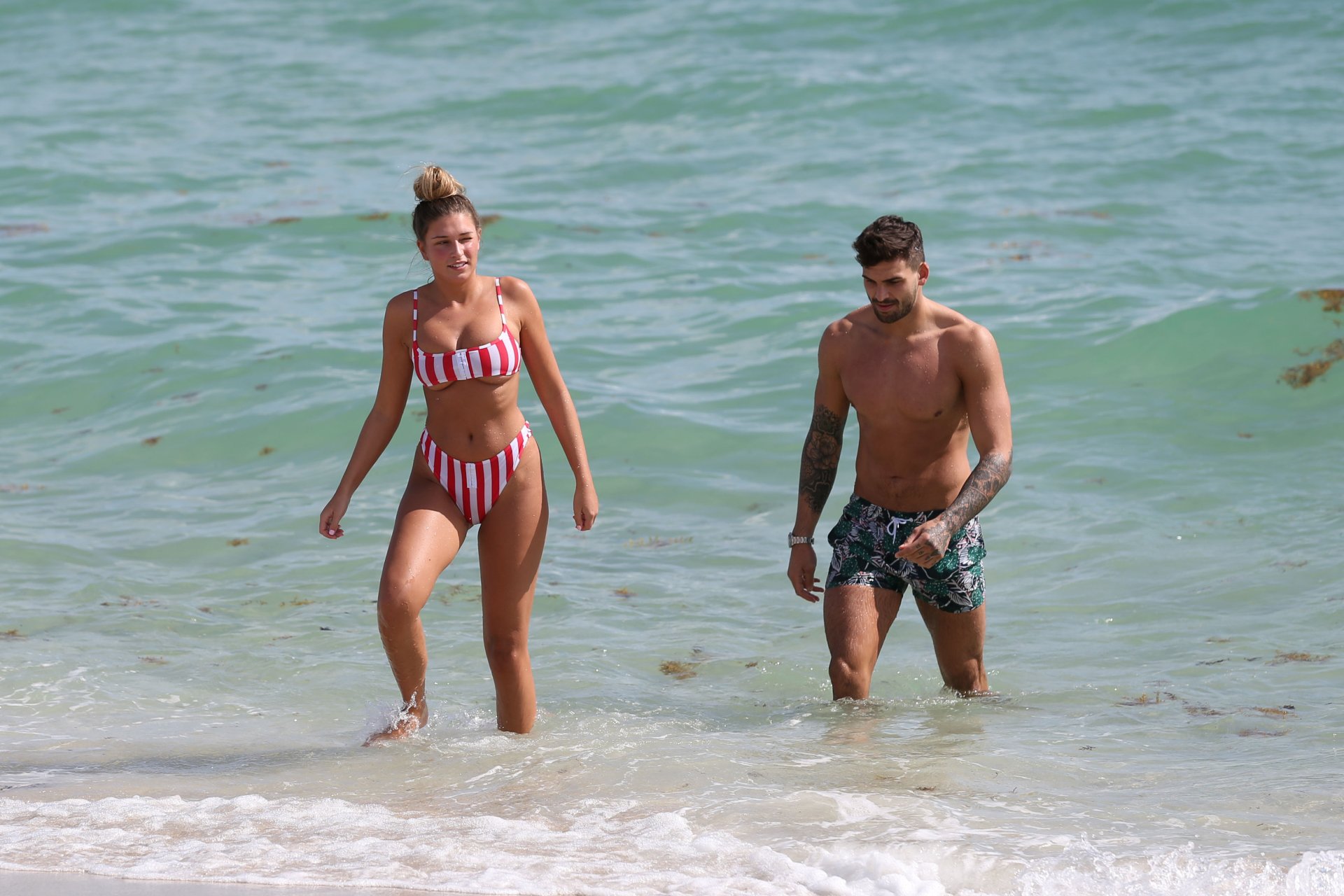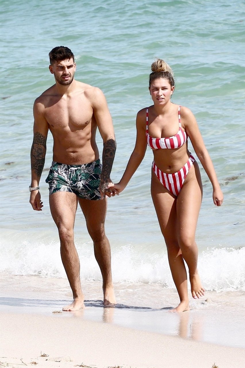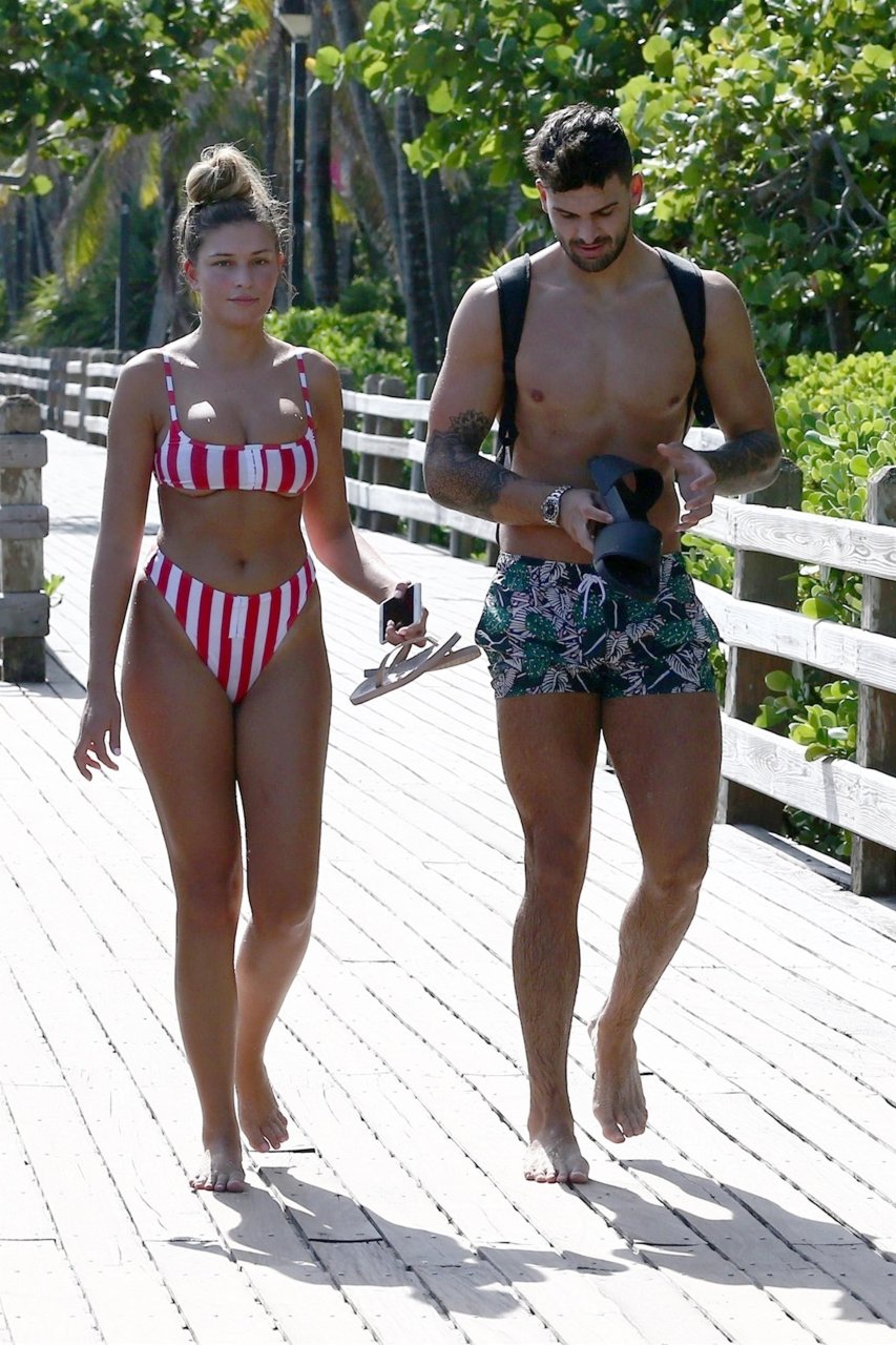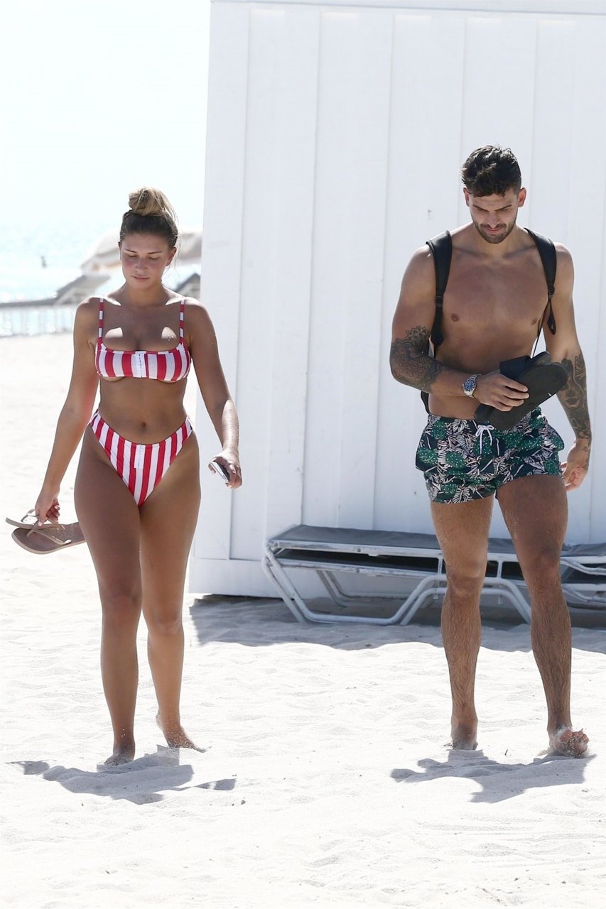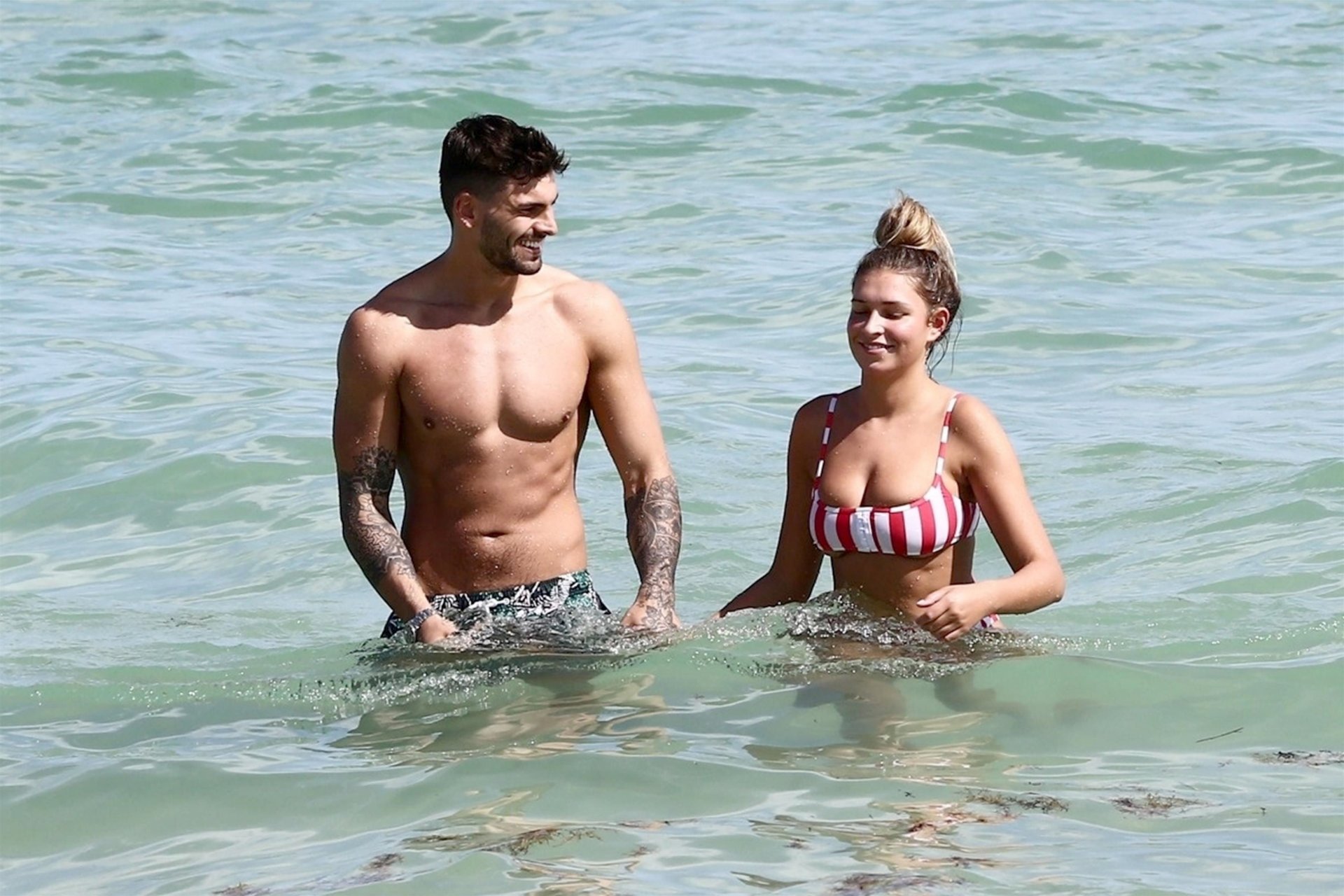Zara sorprendió a Adam con un viaje de cumpleaños a Miami y las Bahamas y hoy fue su primera mañana bajo el sol. La pareja de reality show que se conoció en el programa de éxito, parecía tan enamorada como siempre mientras mostraban su afecto público mientras se daban un chapuzón en el océano. Zara mostró un pronunciado underboob con un bikini muy ajustado a rayas rojas y blancas.