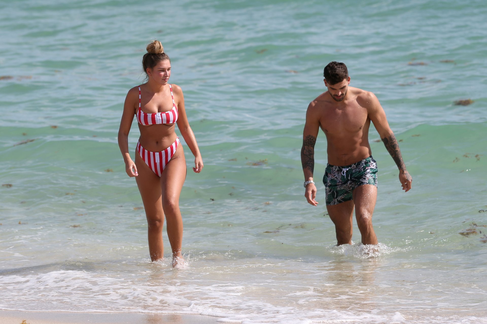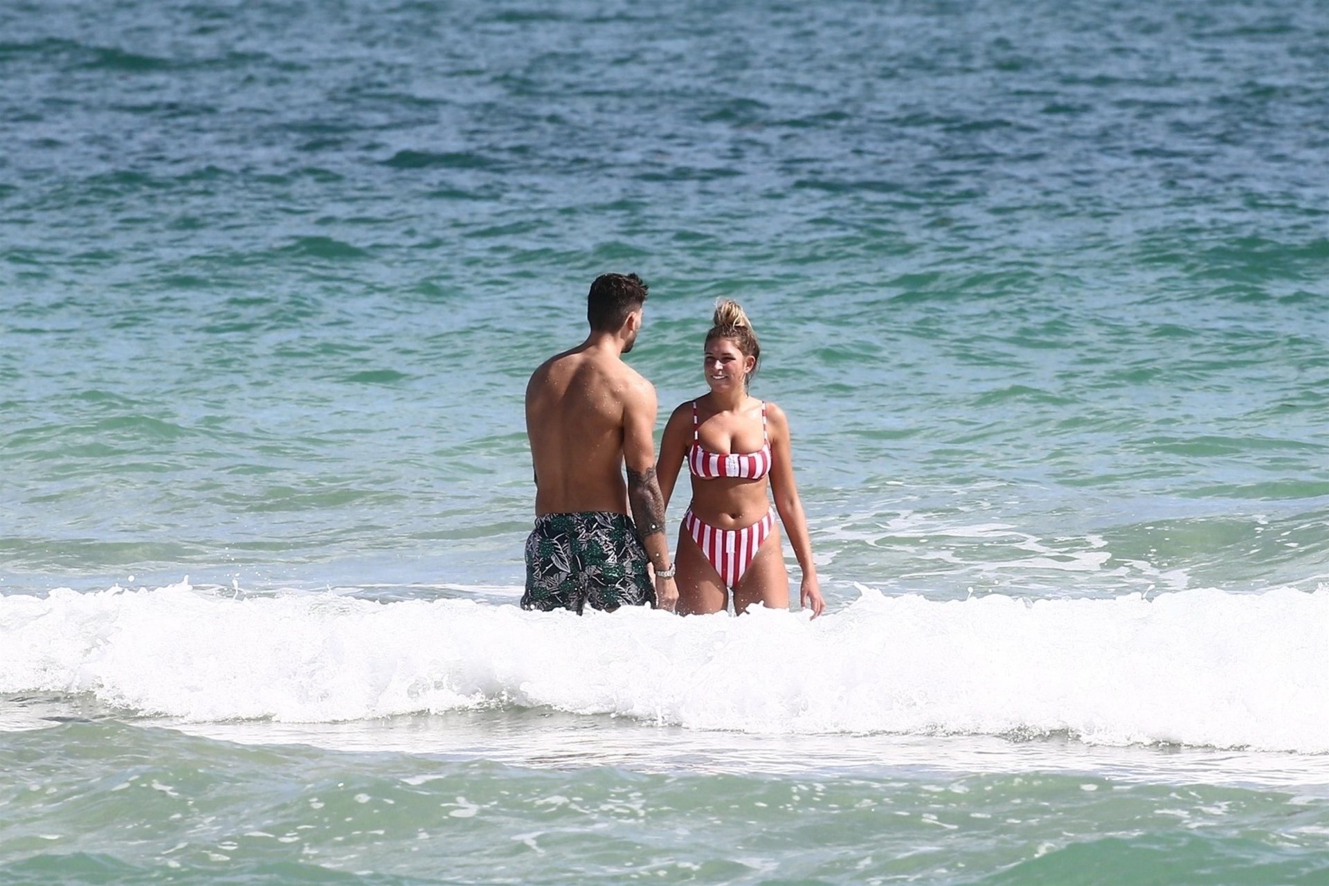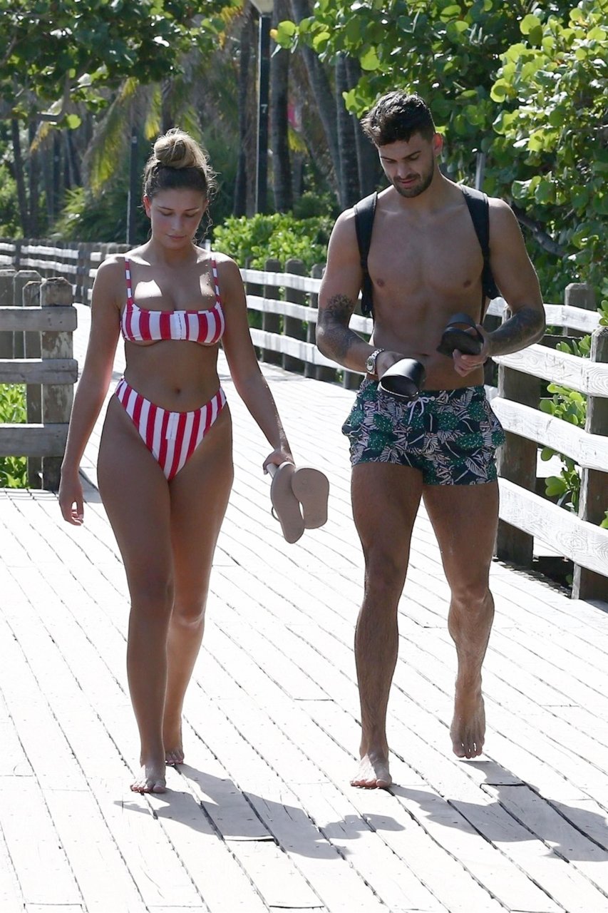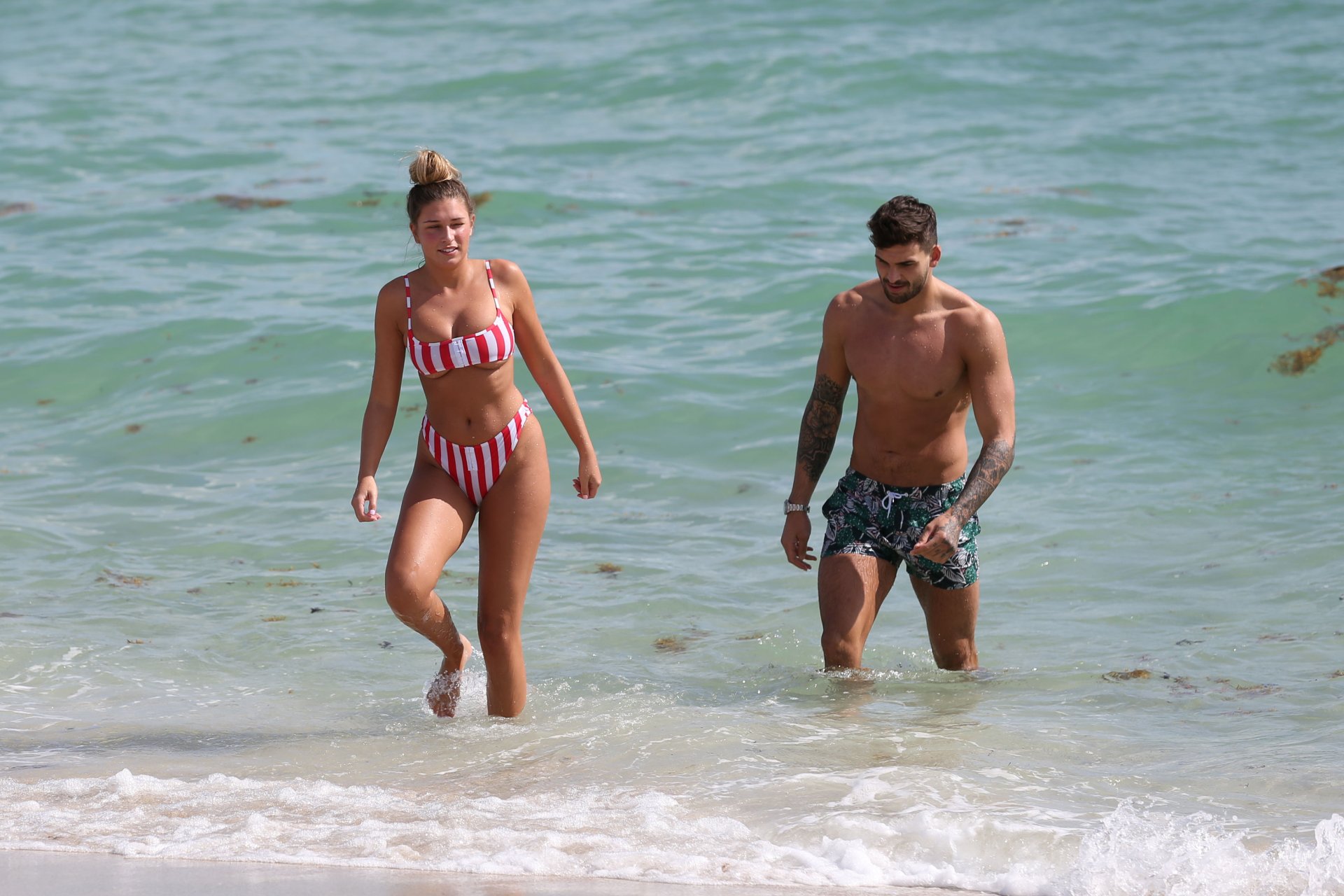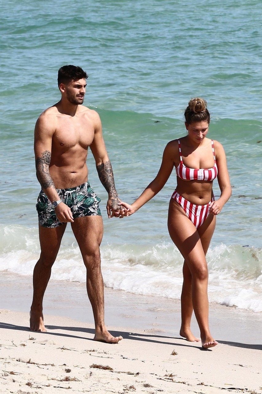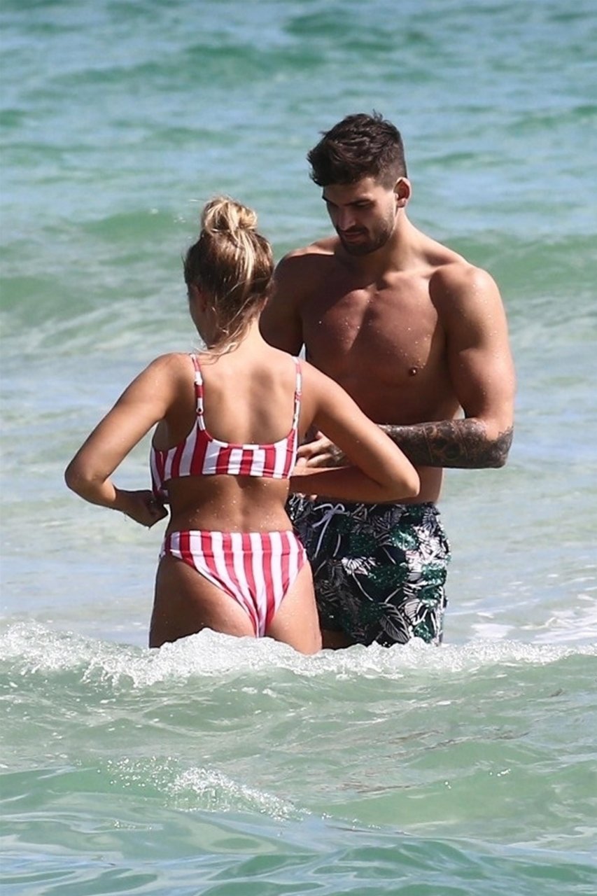 Zara sorprendió a Adam con un viaje de cumpleaños a Miami y las Bahamas y hoy fue su primera mañana bajo el sol. La pareja de reality show que se conoció en el programa de éxito, parecía tan enamorada como siempre mientras mostraban su afecto público mientras se daban un chapuzón en el océano. Zara mostró un pronunciado underboob con un bikini muy ajustado a rayas rojas y blancas.