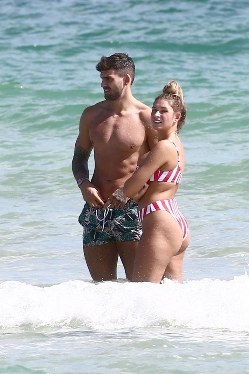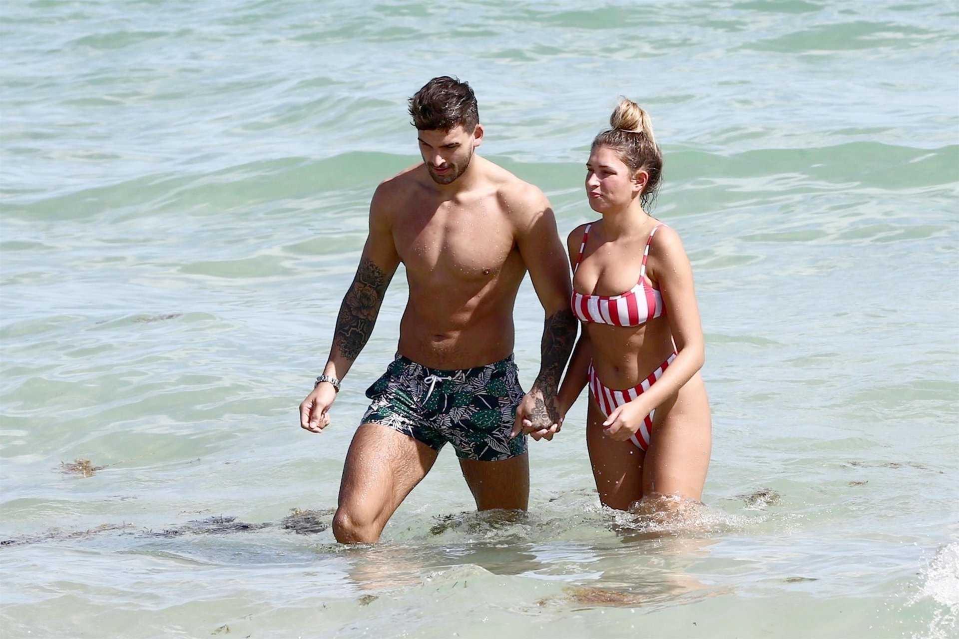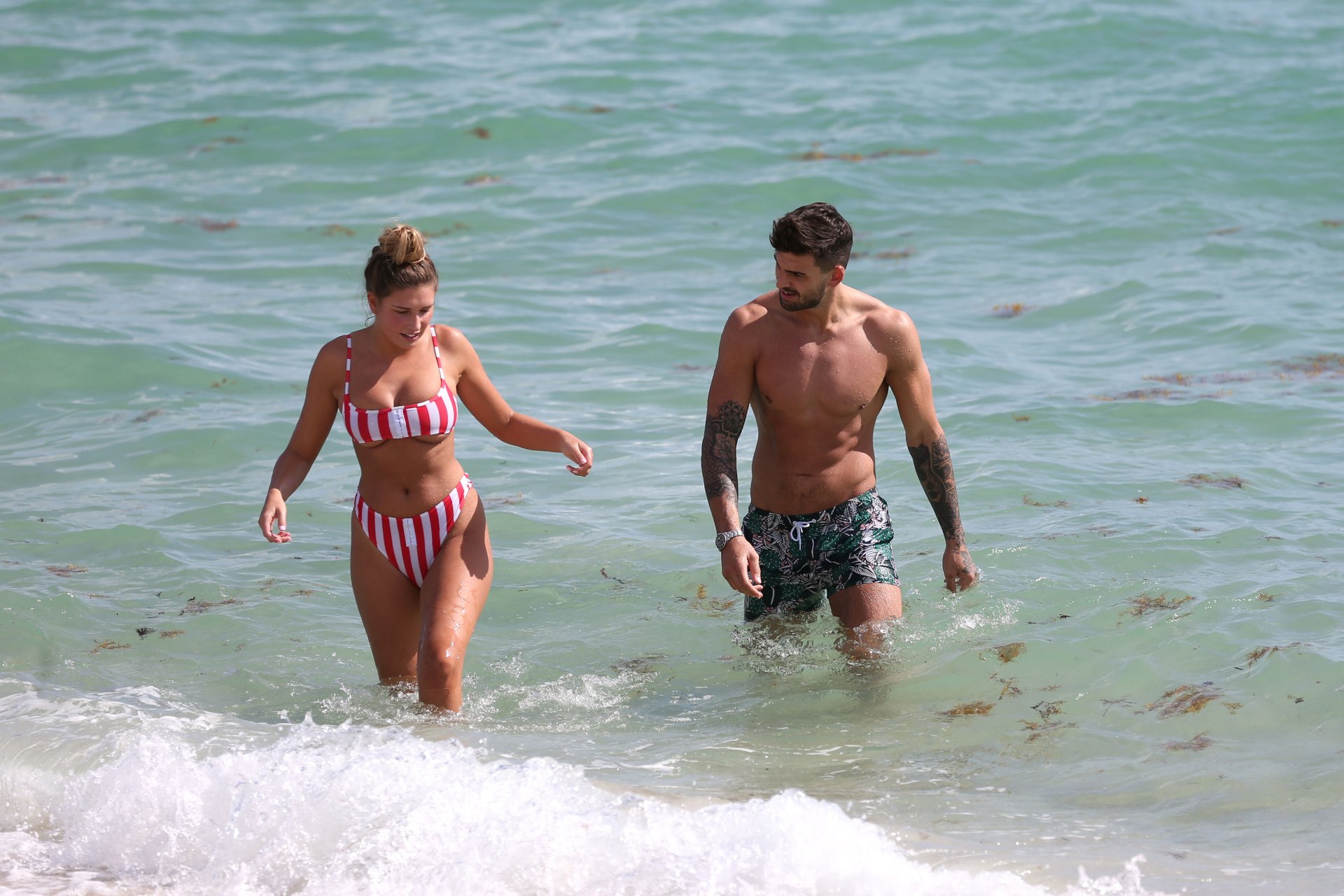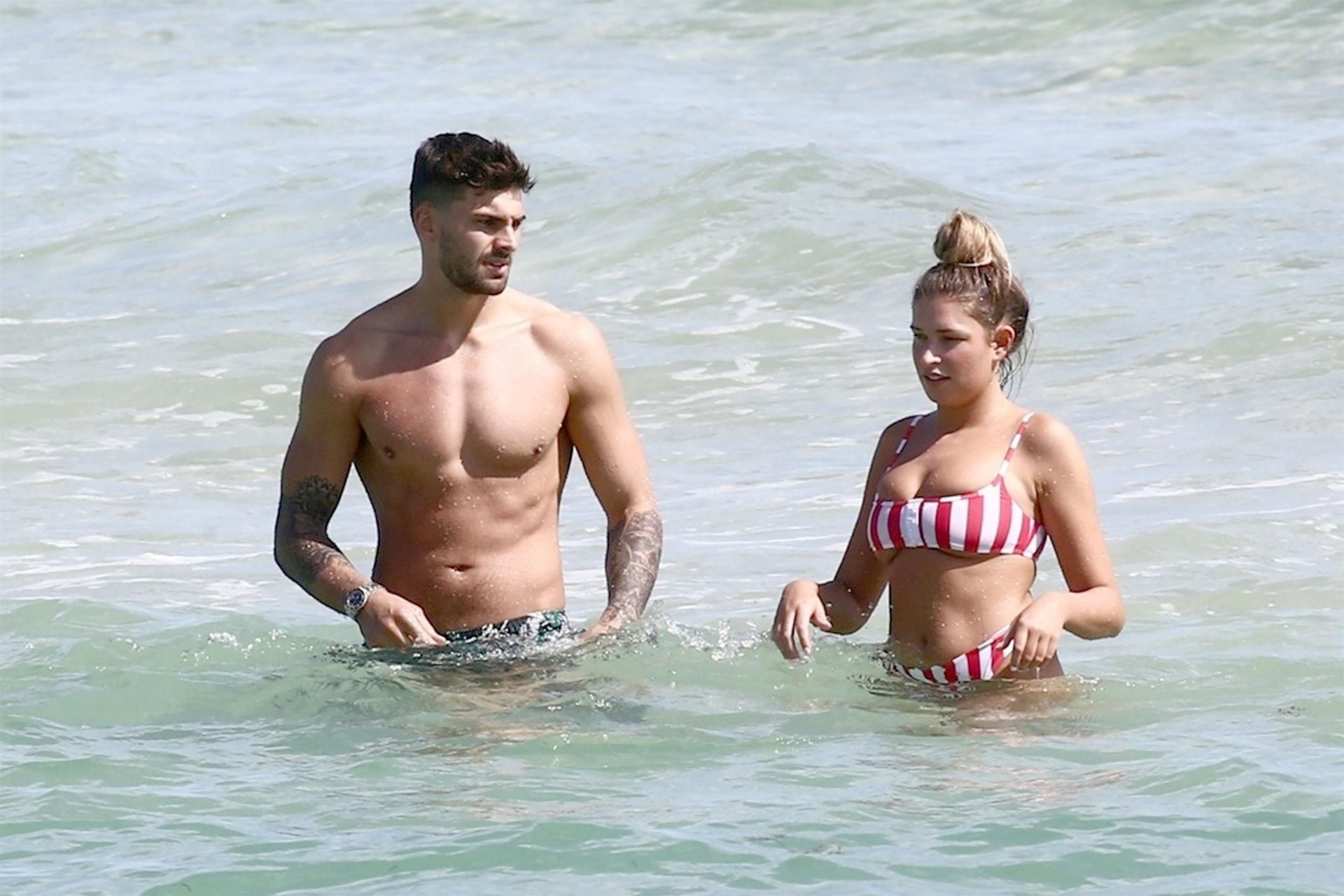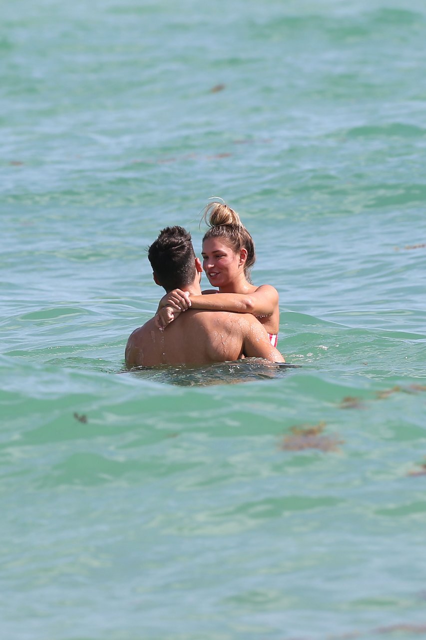 Zara sorprendió a Adam con un viaje de cumpleaños a Miami y las Bahamas y hoy fue su primera mañana bajo el sol. La pareja de reality show que se conoció en el programa de éxito, parecía tan enamorada como siempre mientras mostraban su afecto público mientras se daban un chapuzón en el océano. Zara mostró un pronunciado underboob con un bikini muy ajustado a rayas rojas y blancas.