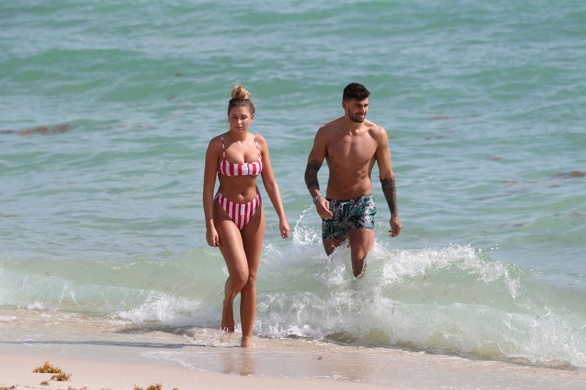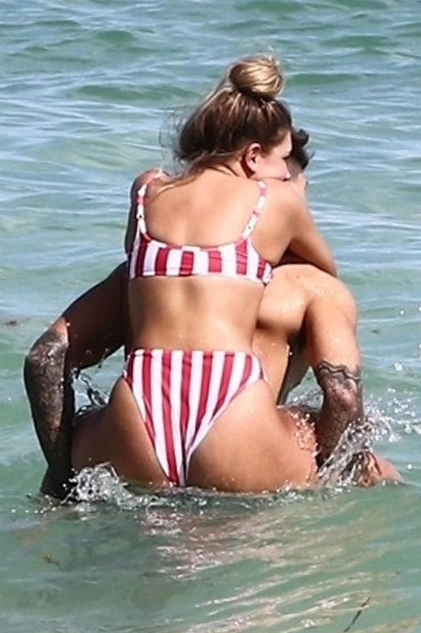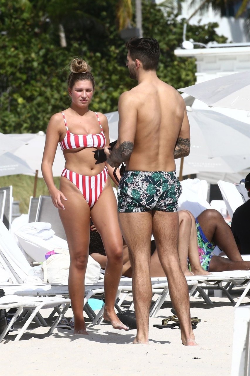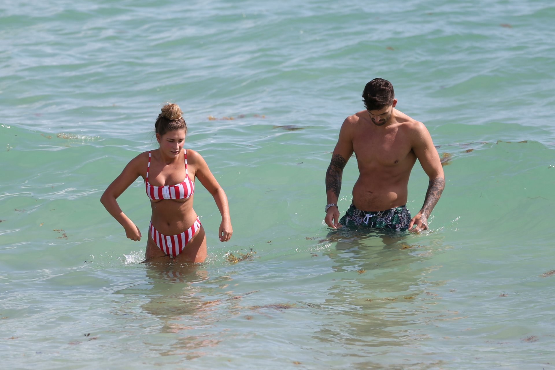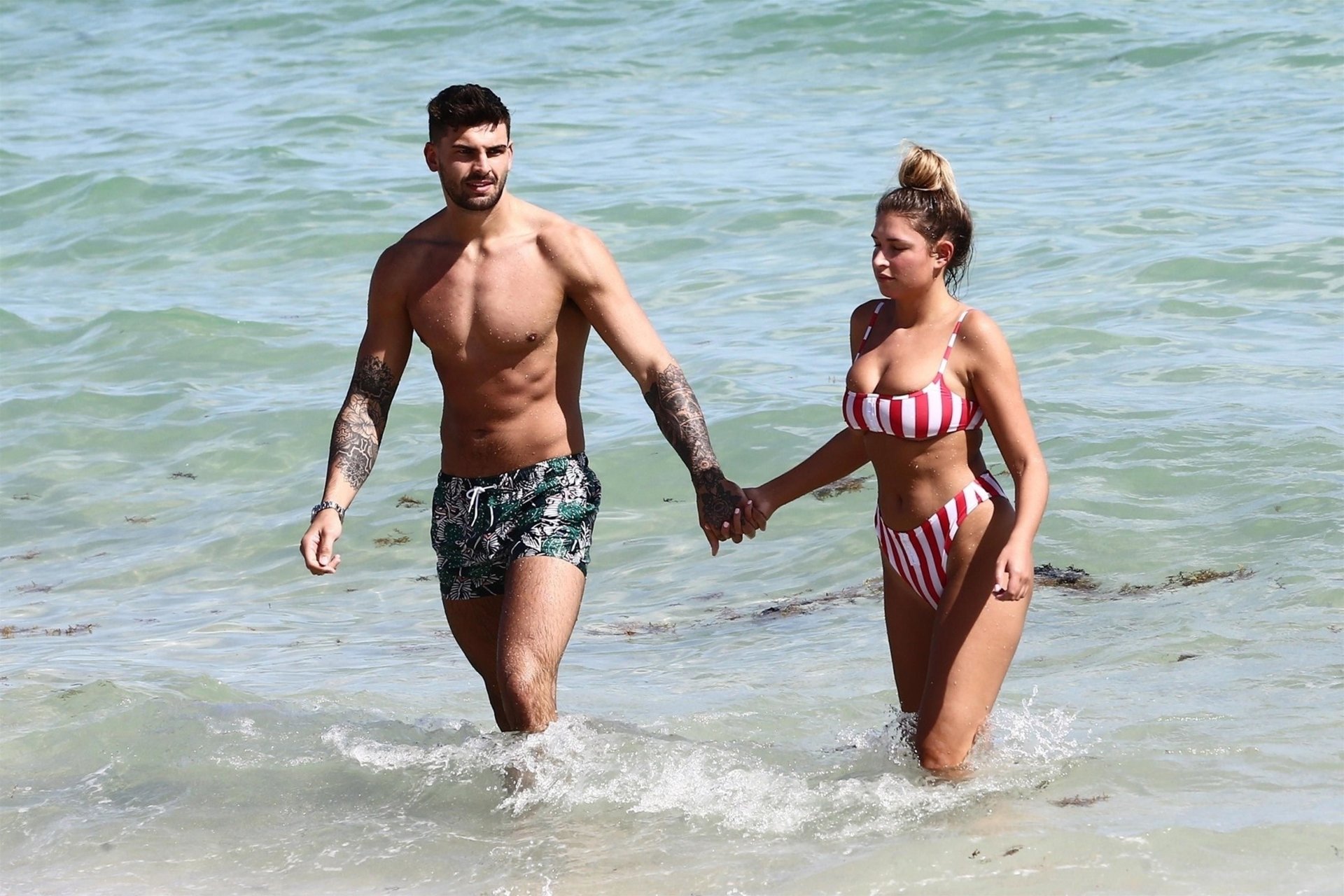 Zara sorprendió a Adam con un viaje de cumpleaños a Miami y las Bahamas y hoy fue su primera mañana bajo el sol. La pareja de reality show que se conoció en el programa de éxito, parecía tan enamorada como siempre mientras mostraban su afecto público mientras se daban un chapuzón en el océano. Zara mostró un pronunciado underboob con un bikini muy ajustado a rayas rojas y blancas.