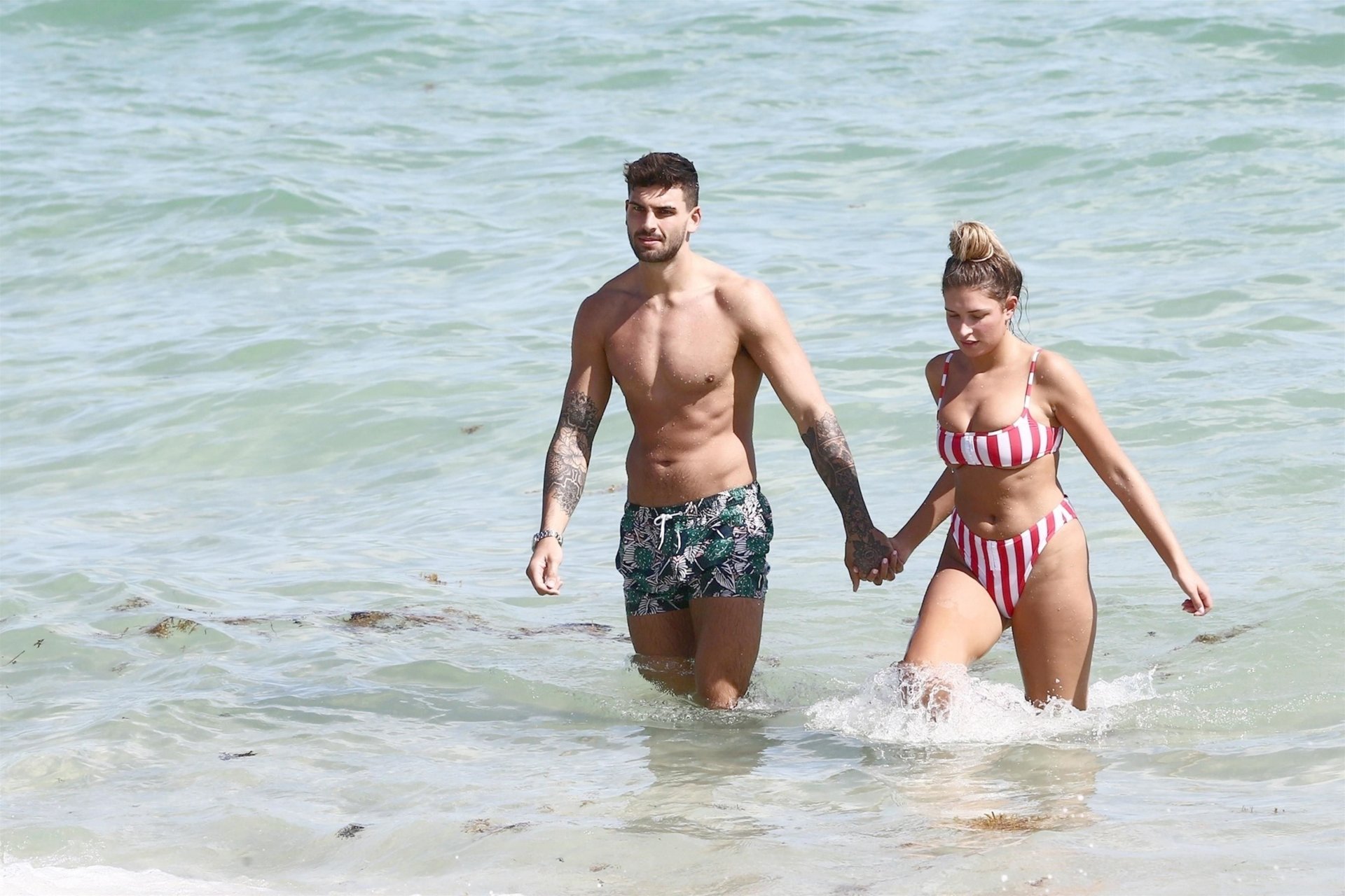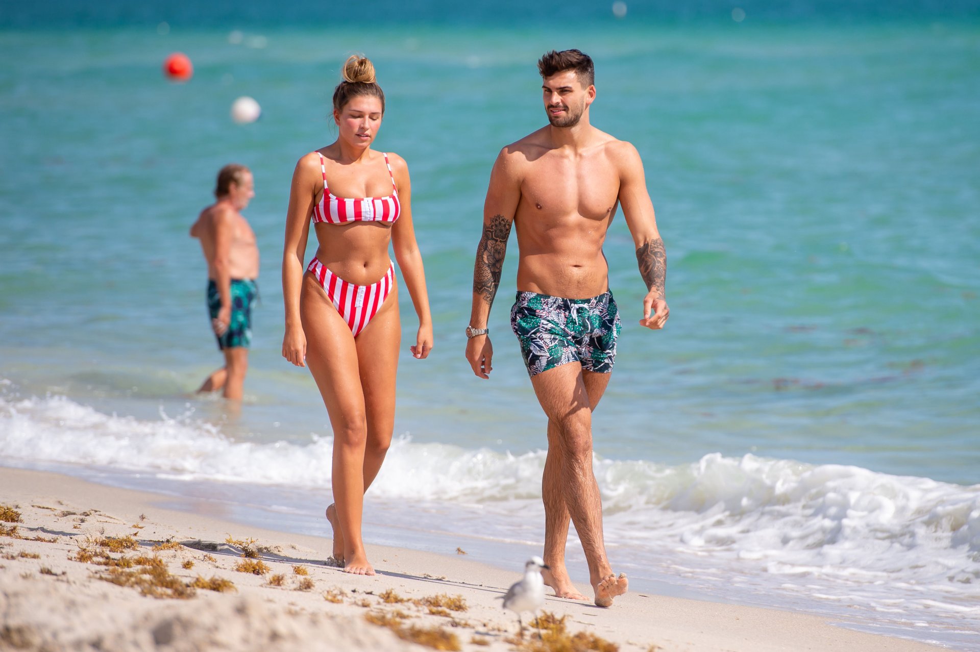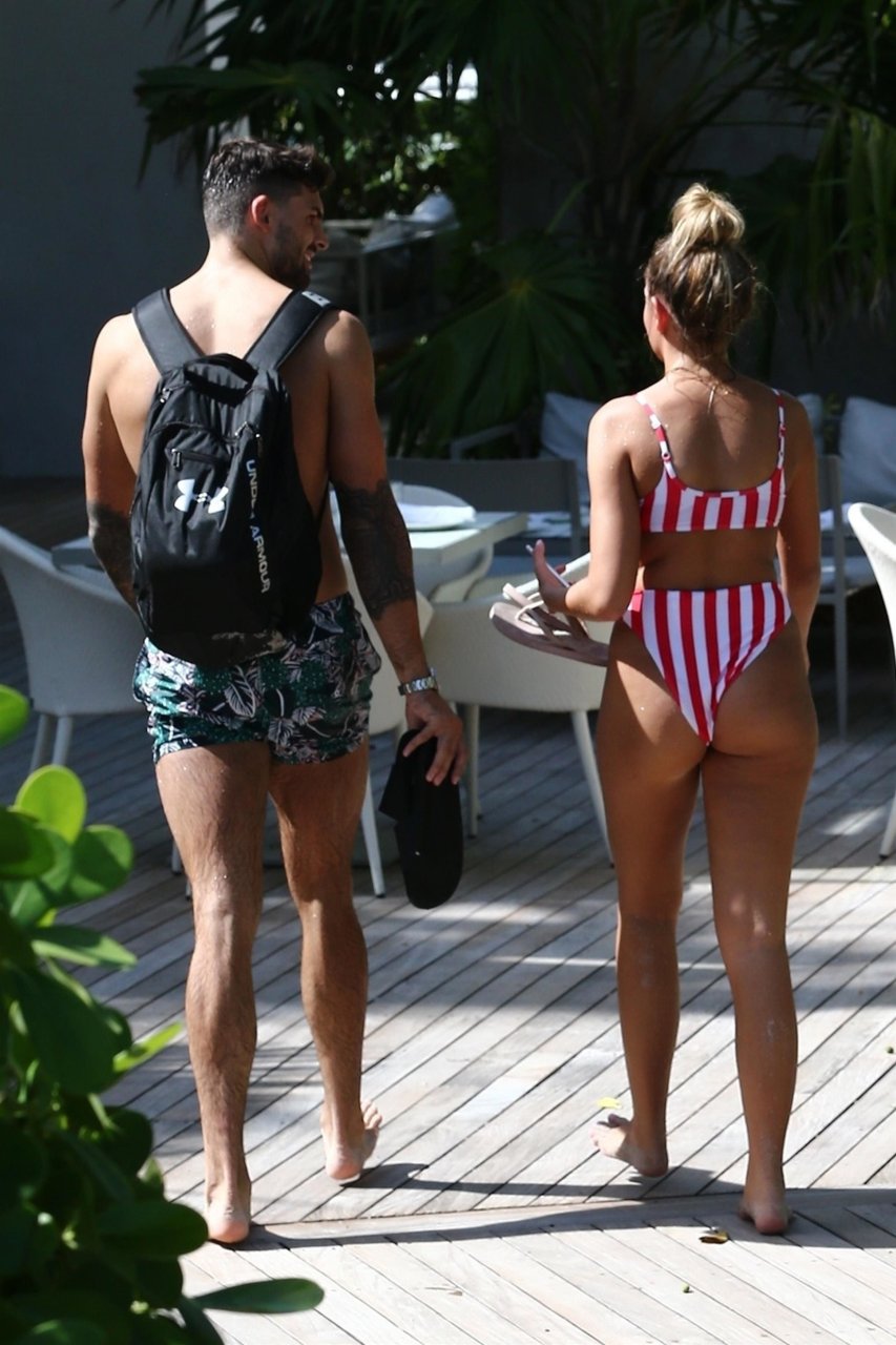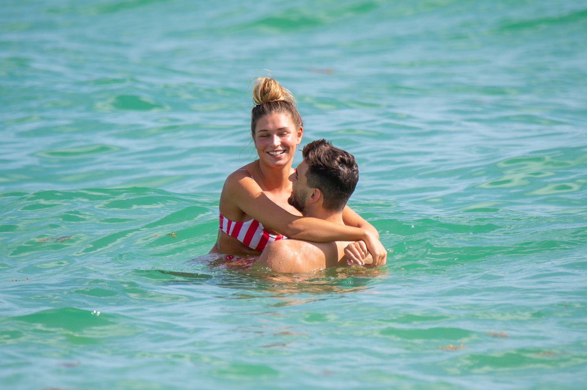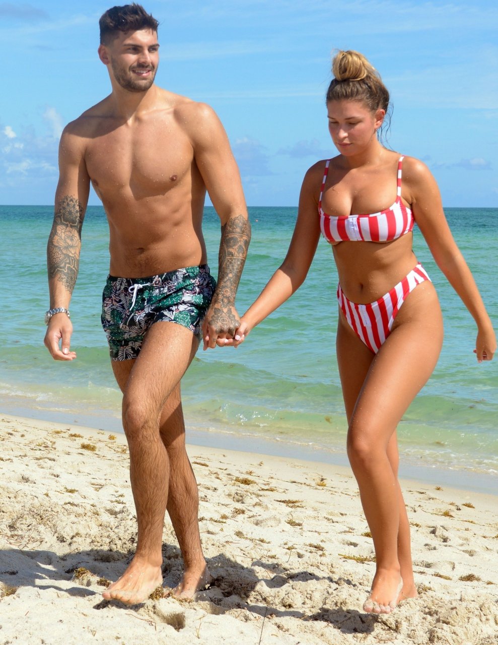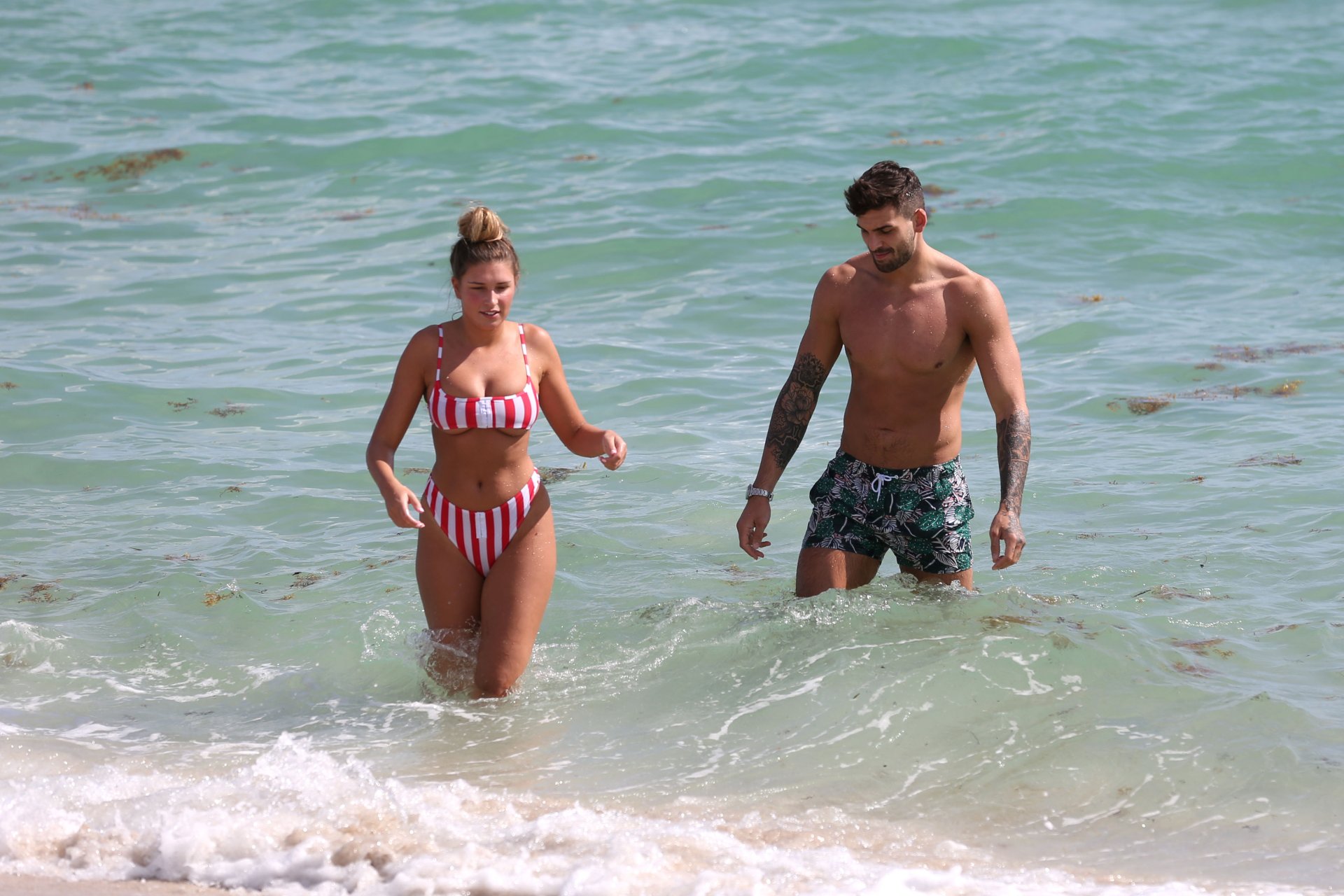 Zara sorprendió a Adam con un viaje de cumpleaños a Miami y las Bahamas y hoy fue su primera mañana bajo el sol. La pareja de reality show que se conoció en el programa de éxito, parecía tan enamorada como siempre mientras mostraban su afecto público mientras se daban un chapuzón en el océano. Zara mostró un pronunciado underboob con un bikini muy ajustado a rayas rojas y blancas.