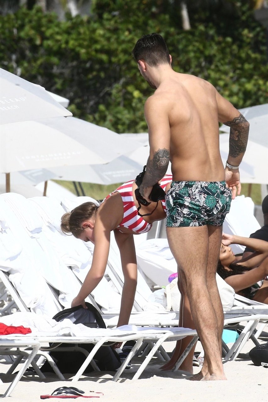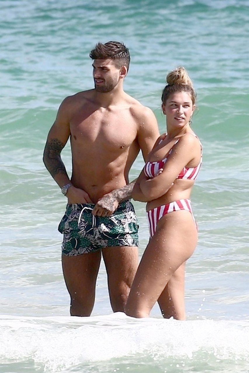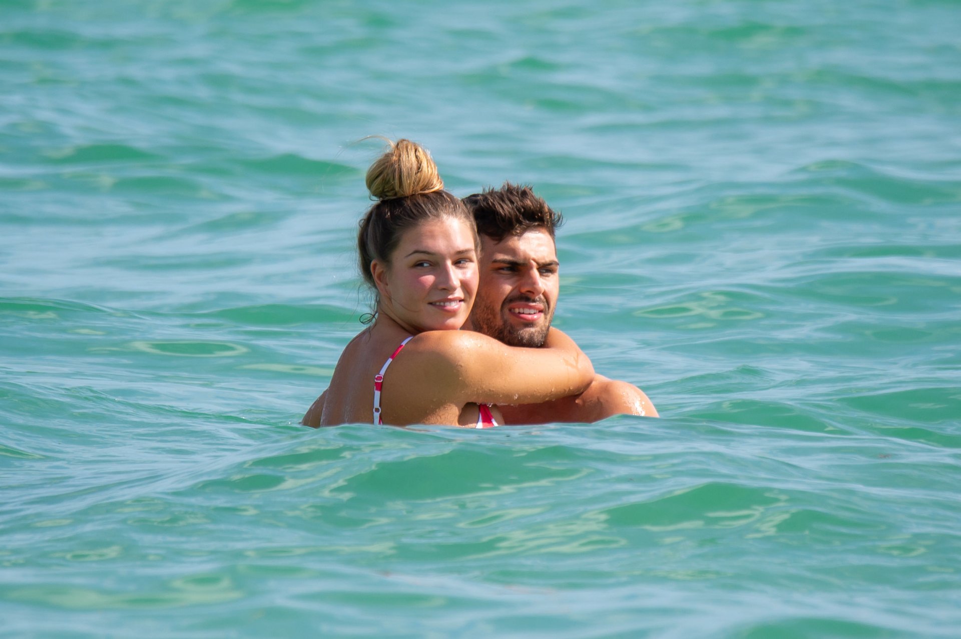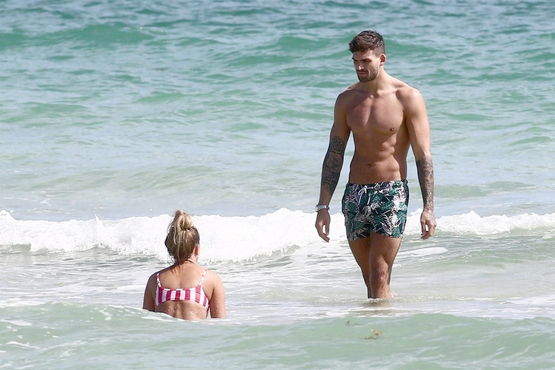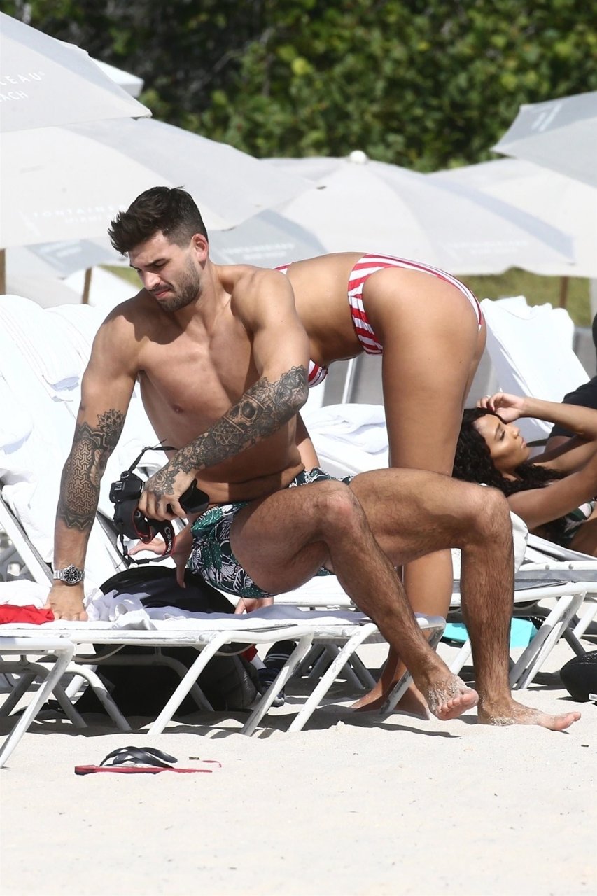 Zara sorprendió a Adam con un viaje de cumpleaños a Miami y las Bahamas y hoy fue su primera mañana bajo el sol. La pareja de reality show que se conoció en el programa de éxito, parecía tan enamorada como siempre mientras mostraban su afecto público mientras se daban un chapuzón en el océano. Zara mostró un pronunciado underboob con un bikini muy ajustado a rayas rojas y blancas.