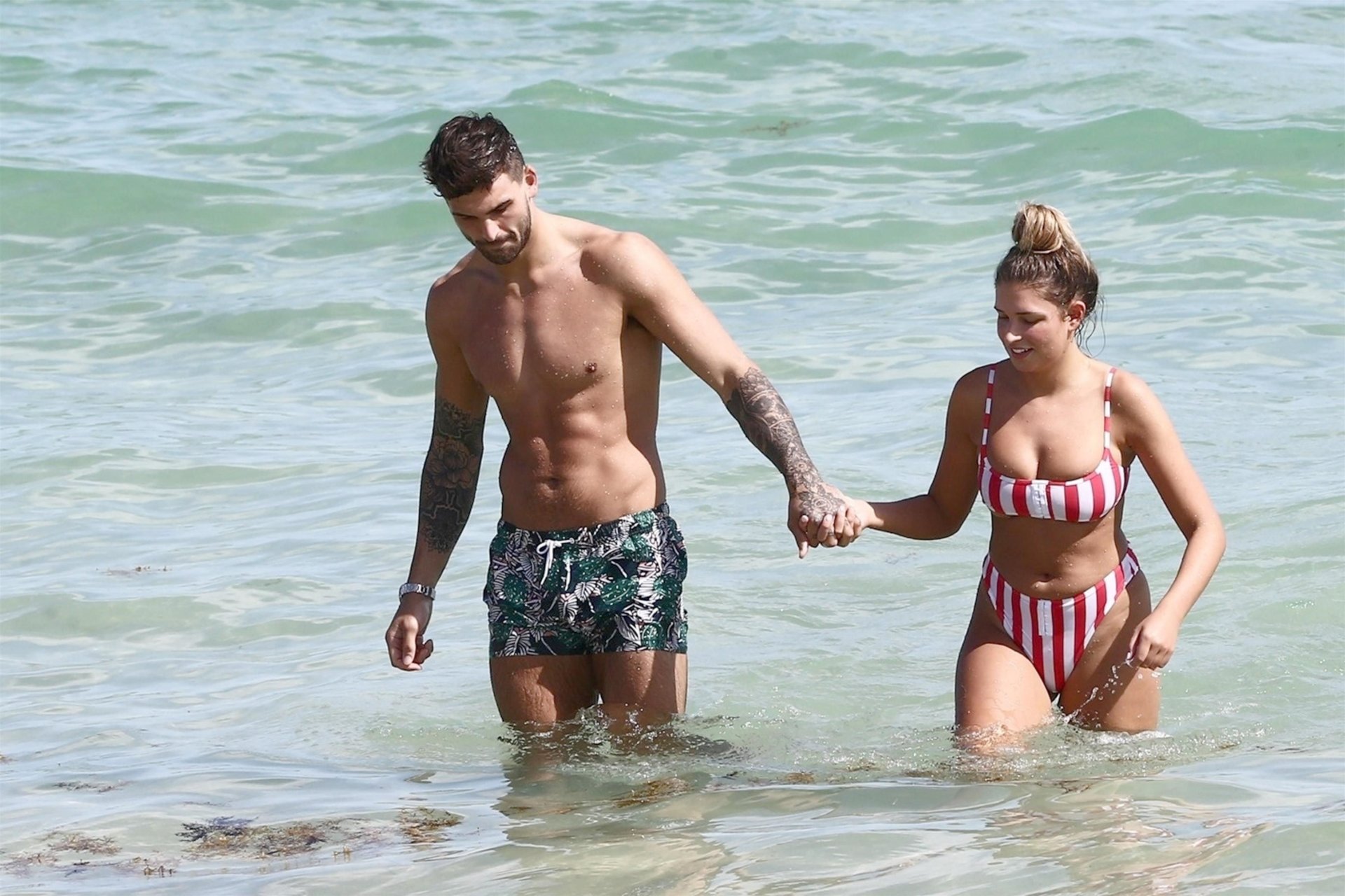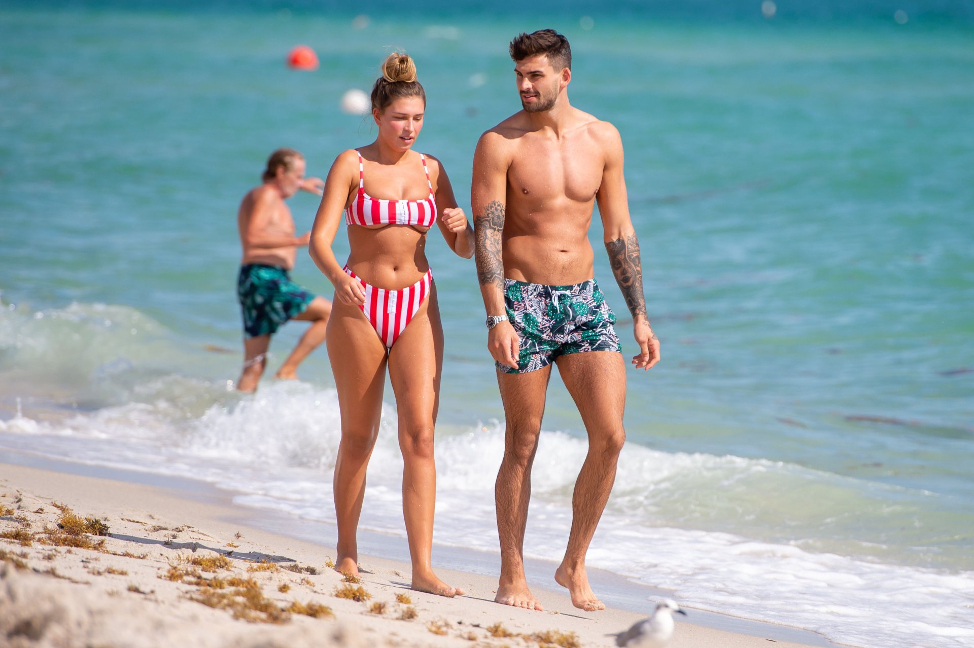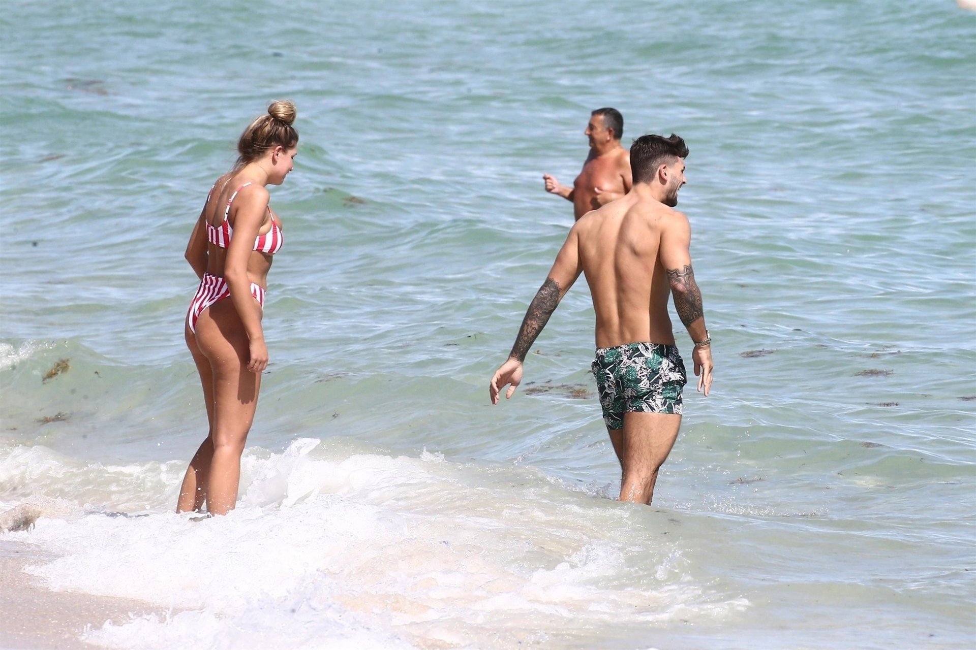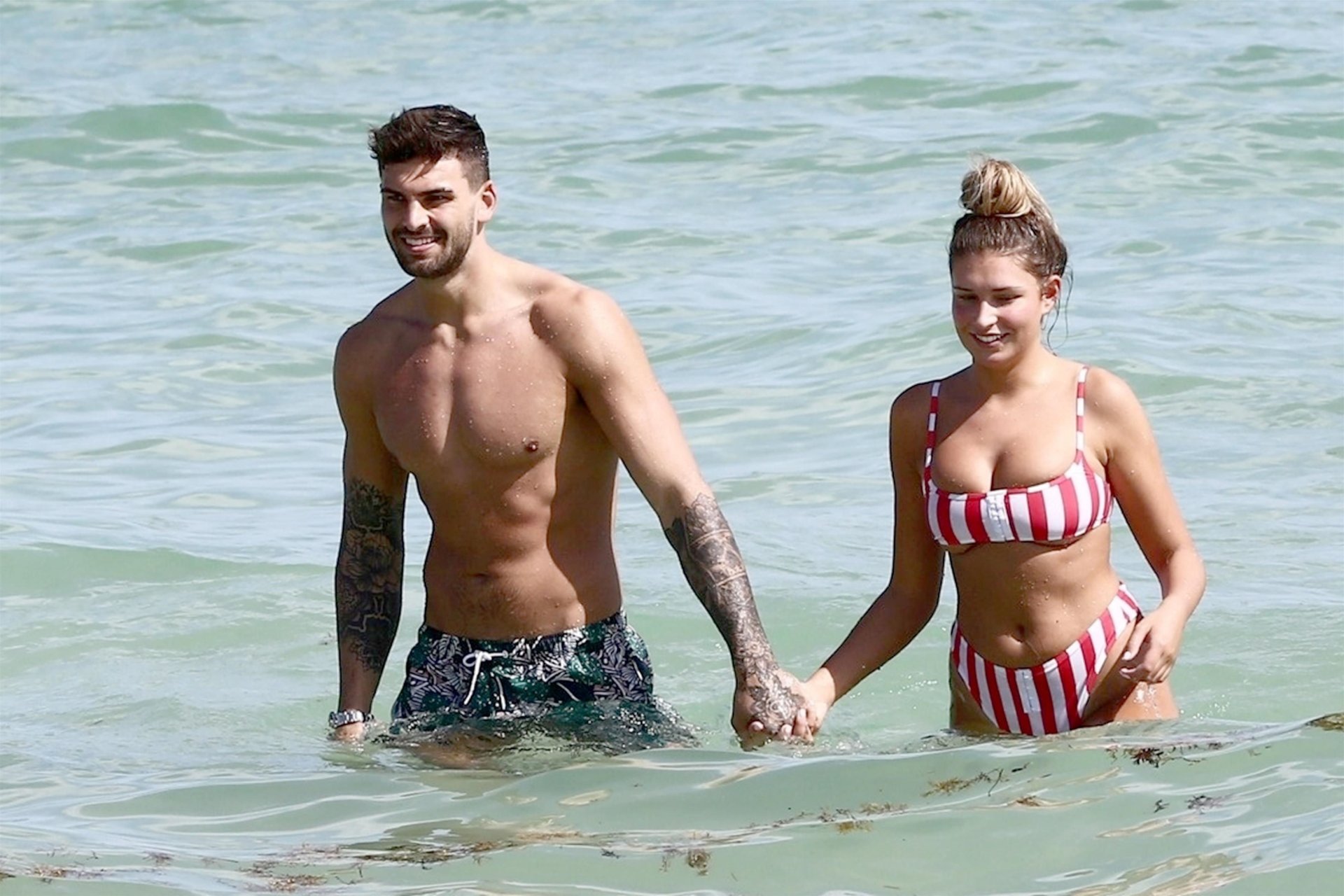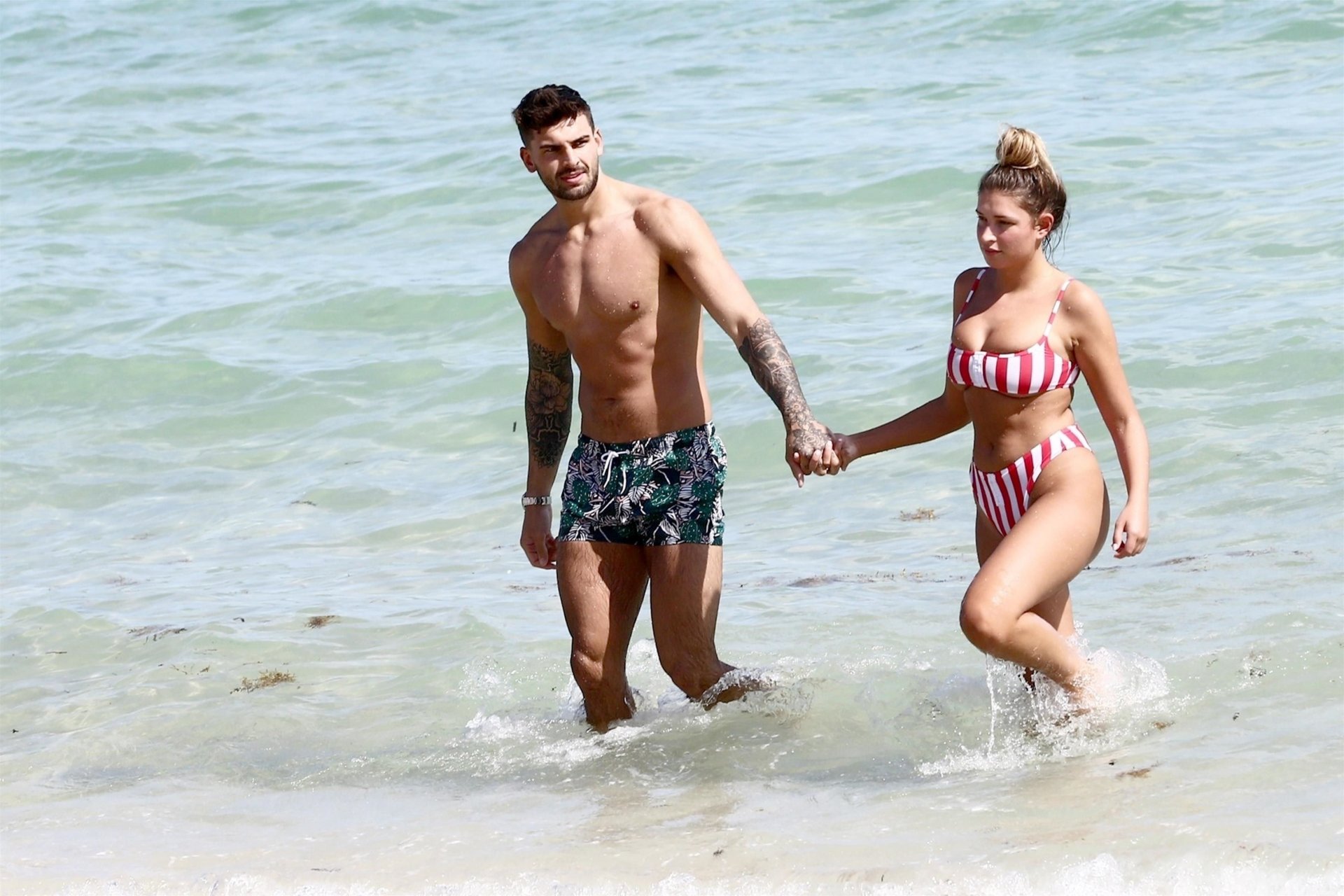 Zara sorprendió a Adam con un viaje de cumpleaños a Miami y las Bahamas y hoy fue su primera mañana bajo el sol. La pareja de reality show que se conoció en el programa de éxito, parecía tan enamorada como siempre mientras mostraban su afecto público mientras se daban un chapuzón en el océano. Zara mostró un pronunciado underboob con un bikini muy ajustado a rayas rojas y blancas.