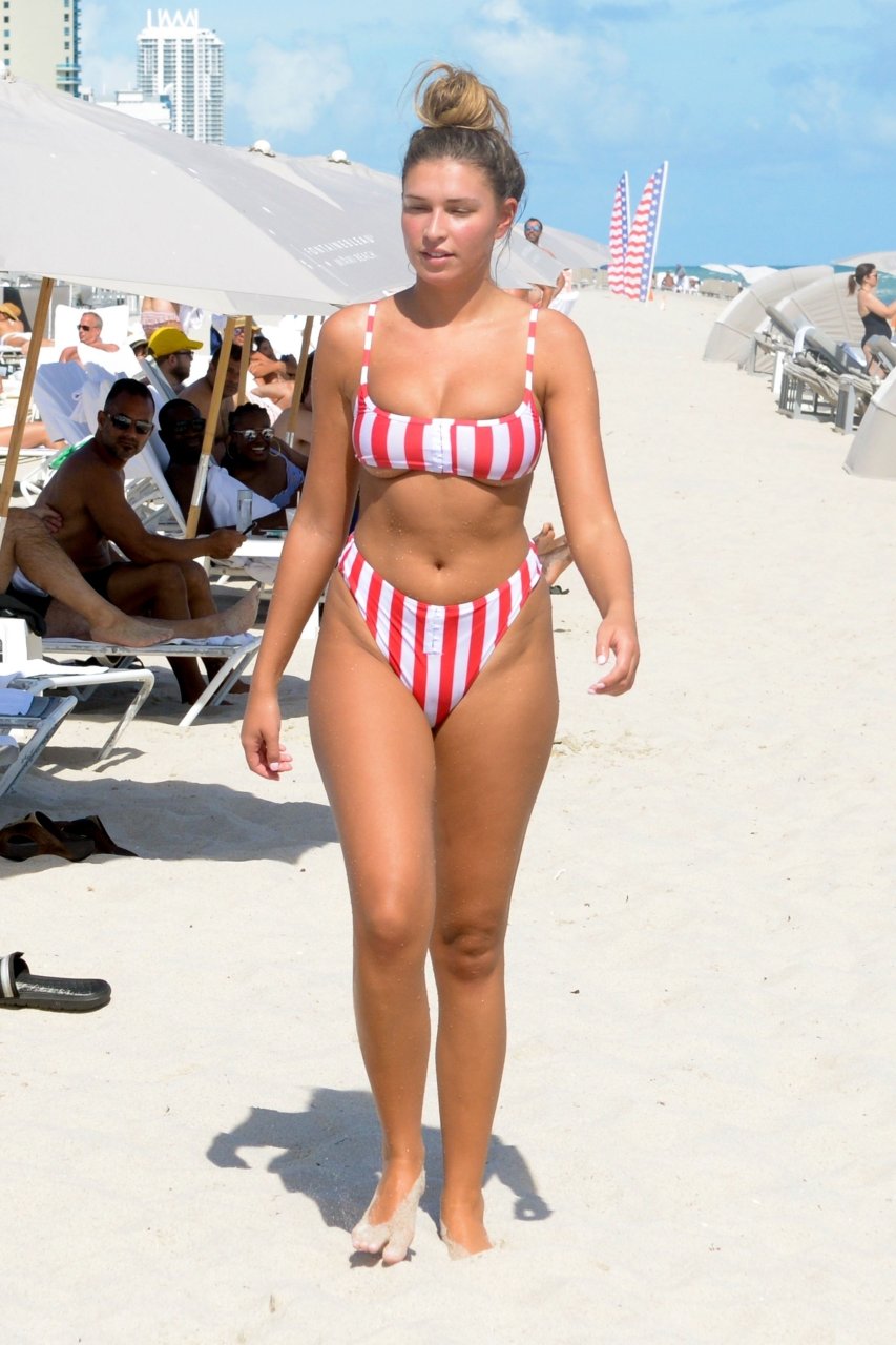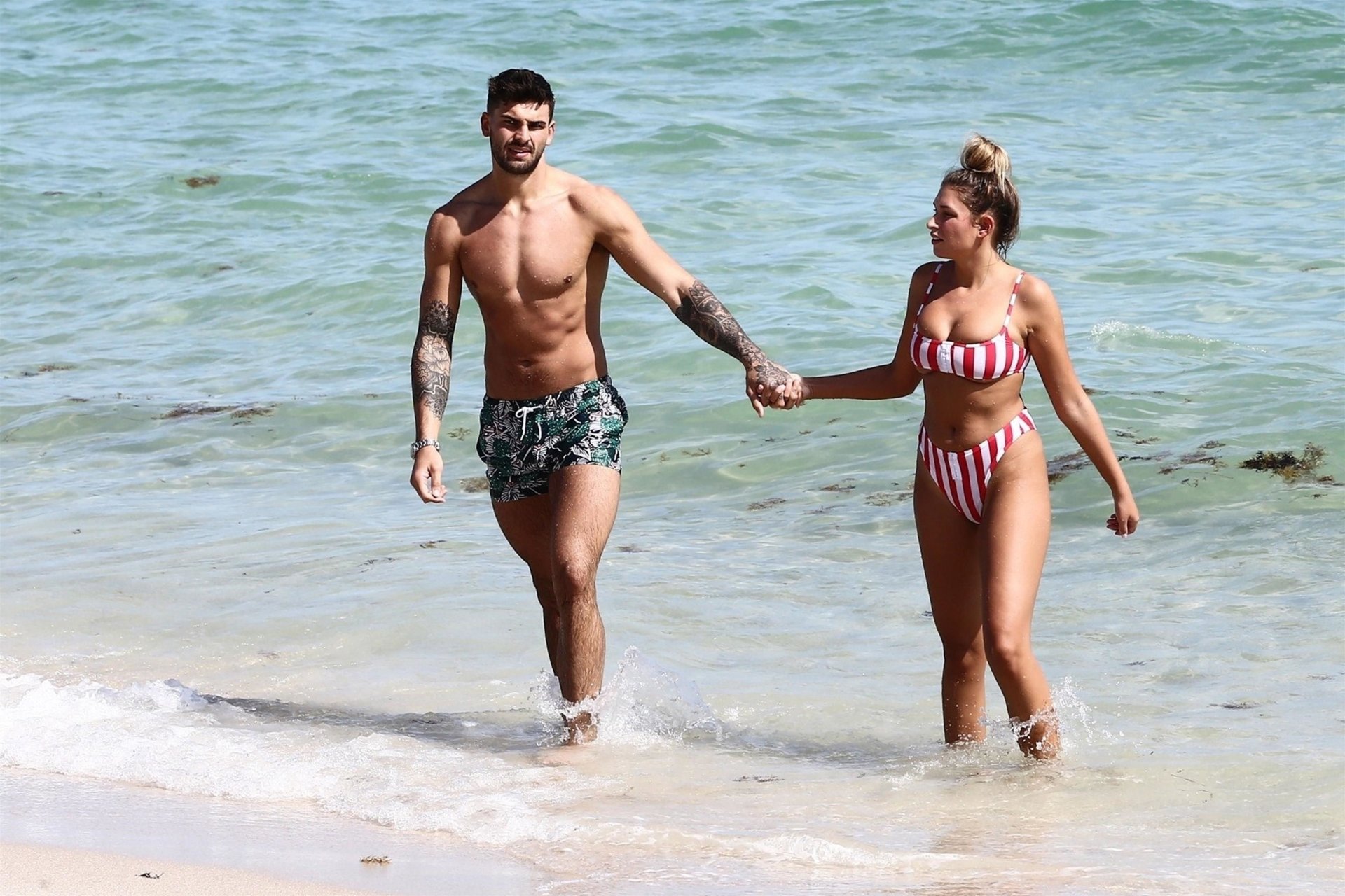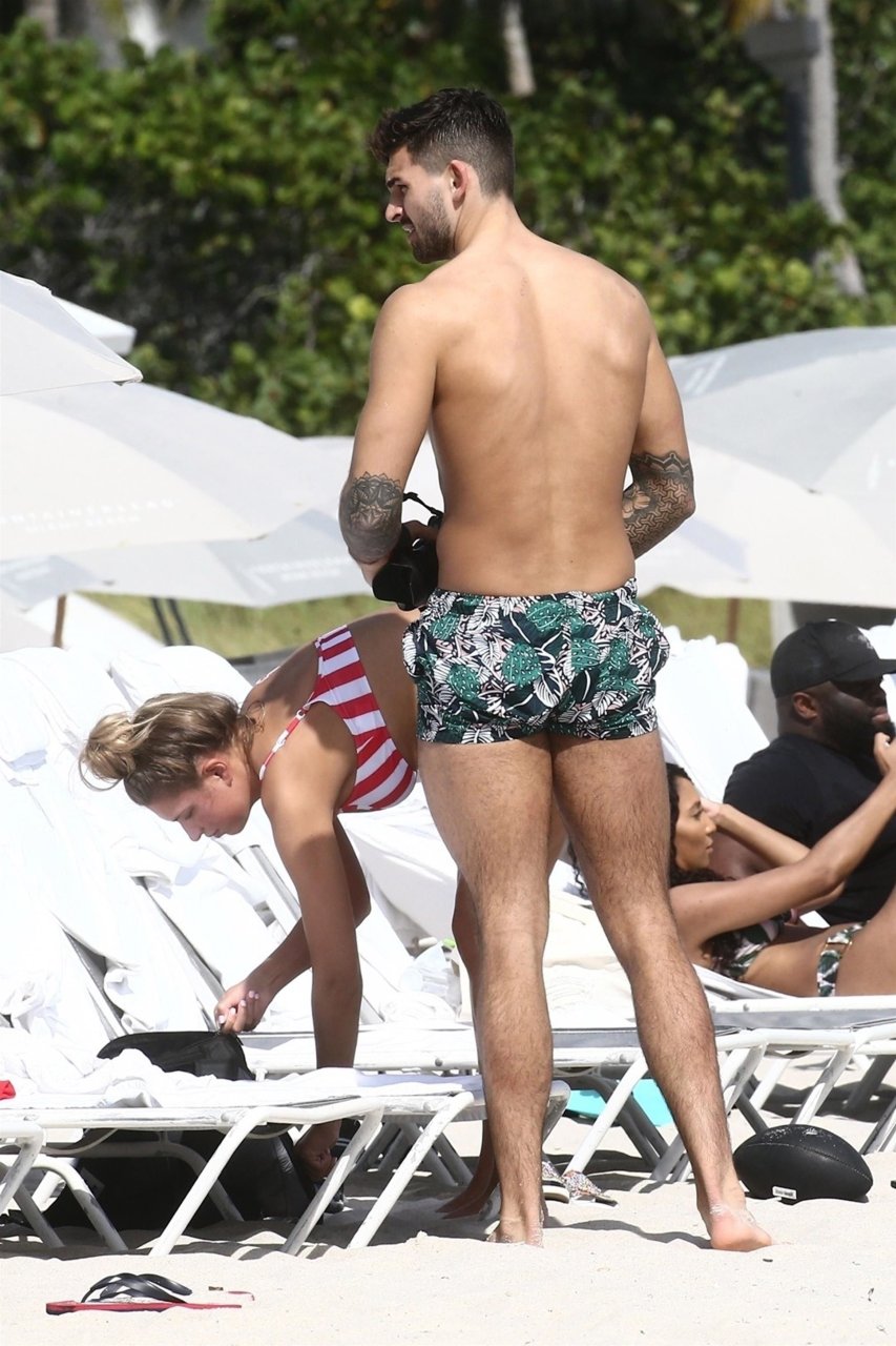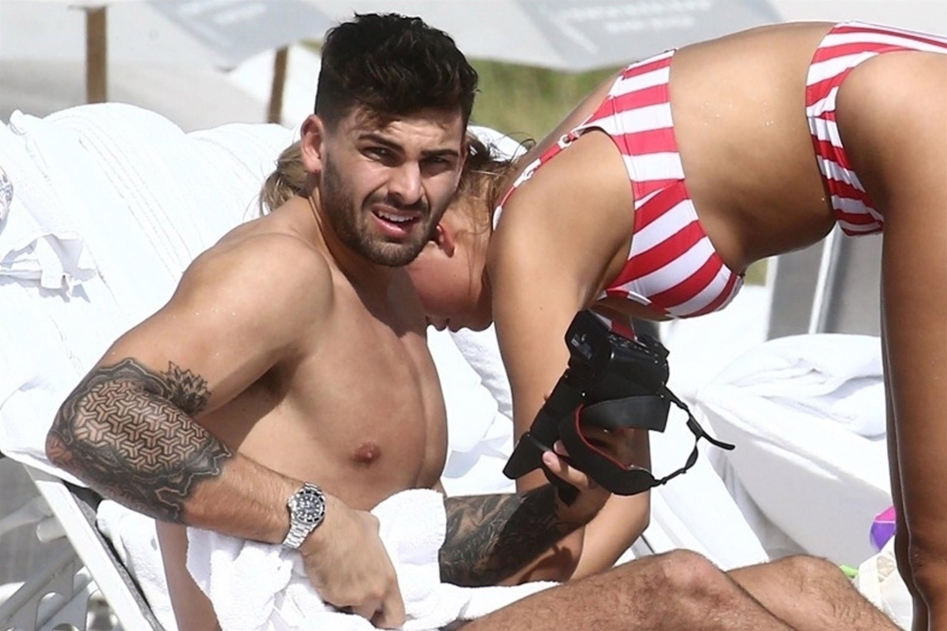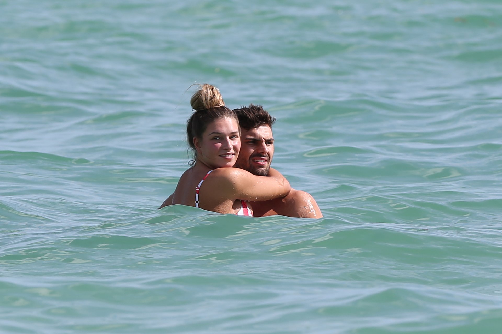 Zara sorprendió a Adam con un viaje de cumpleaños a Miami y las Bahamas y hoy fue su primera mañana bajo el sol. La pareja de reality show que se conoció en el programa de éxito, parecía tan enamorada como siempre mientras mostraban su afecto público mientras se daban un chapuzón en el océano. Zara mostró un pronunciado underboob con un bikini muy ajustado a rayas rojas y blancas.
